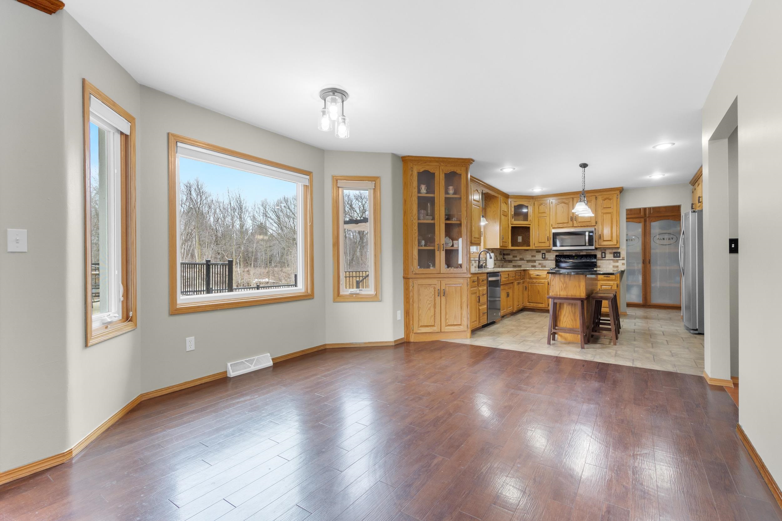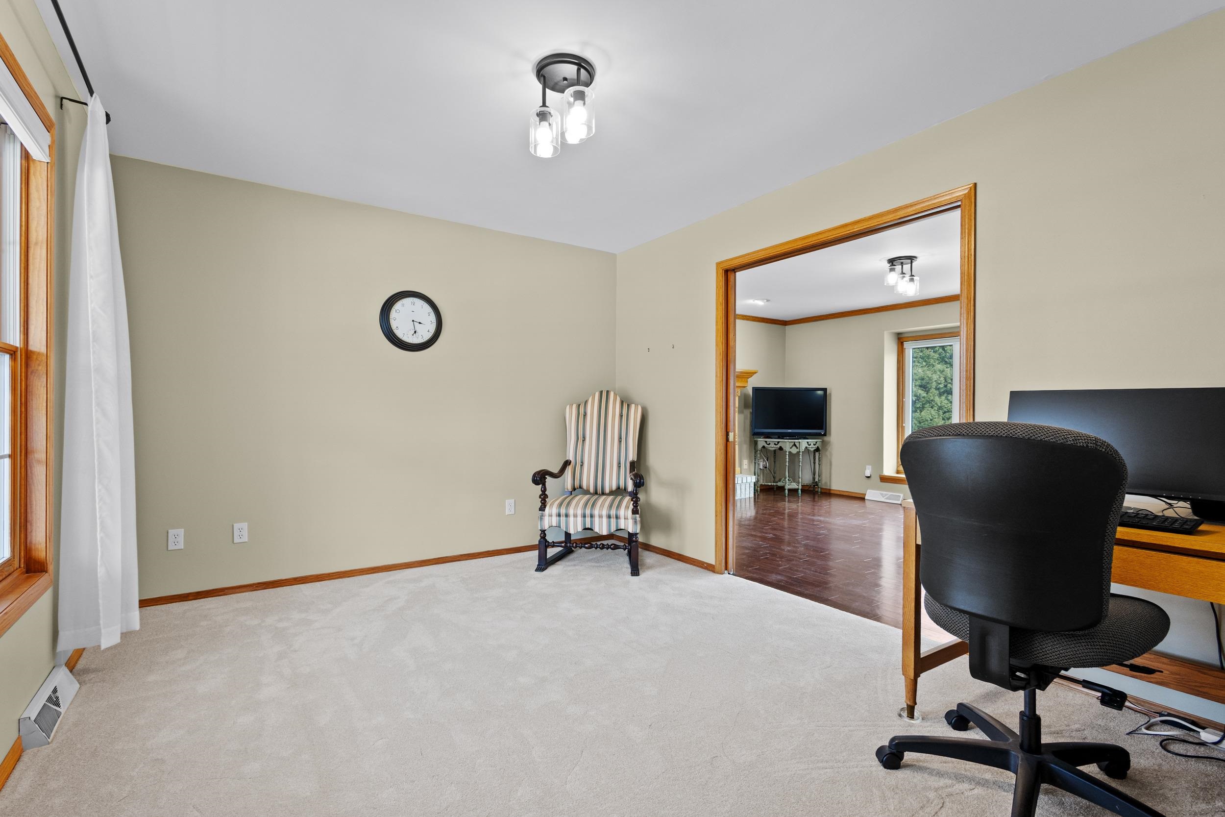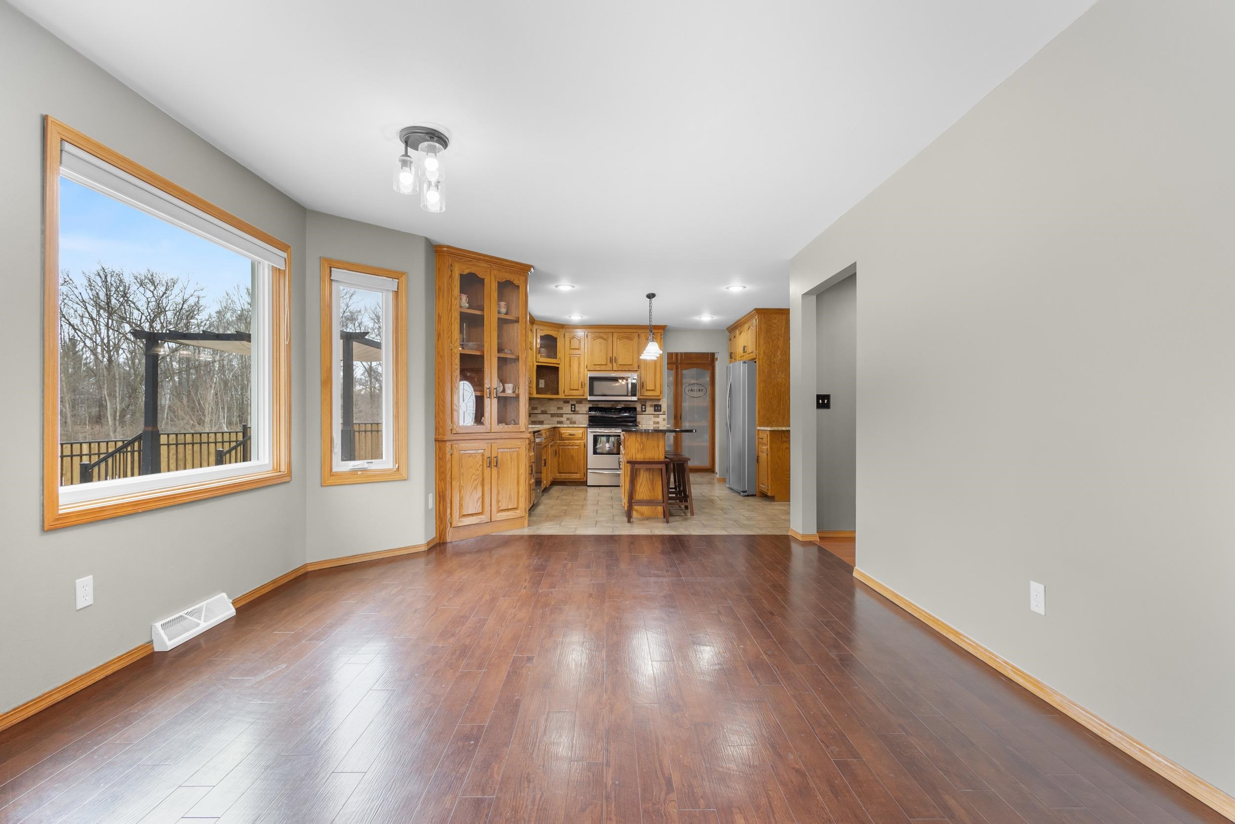 Location, Location, Location! Well kept large 2 story home located on approx. .93 of an acre. Large foyer with hardwood flooring leads to kitchen w/ pantry, appliances, granite counters and overlooks dining and living room making an open concept feel along with access to the multi tiered decking, pergola & awning, private wooded backyard w/ small creek & landscape pond. Mudroom off of the 3.5 stall garage, 1st floor laundry rm that includes washer & dryer, 1/2 bath & office w/ french doors. Upper level has new carpeting (2026) large primary suite, walk in closet, tiled shower & dble sinks & access to the 16x7 loft.2 other generous size bedrooms & full bath. Lower level is finished w/ family room, wet bar area, craft/office rm, 1/2 bath & storage room area. 48 Hr Binding acceptance