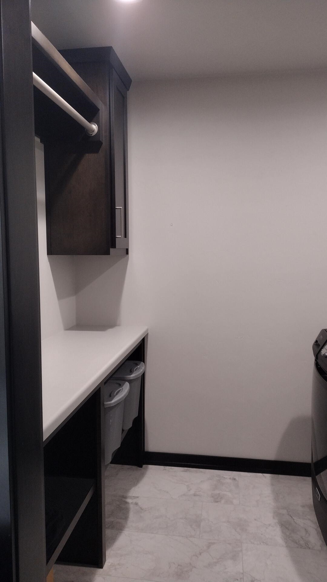 Washer/dryer, drapes, white laminate shoe cubby, wood artwork coat rack, black patio door tension rod, personal property