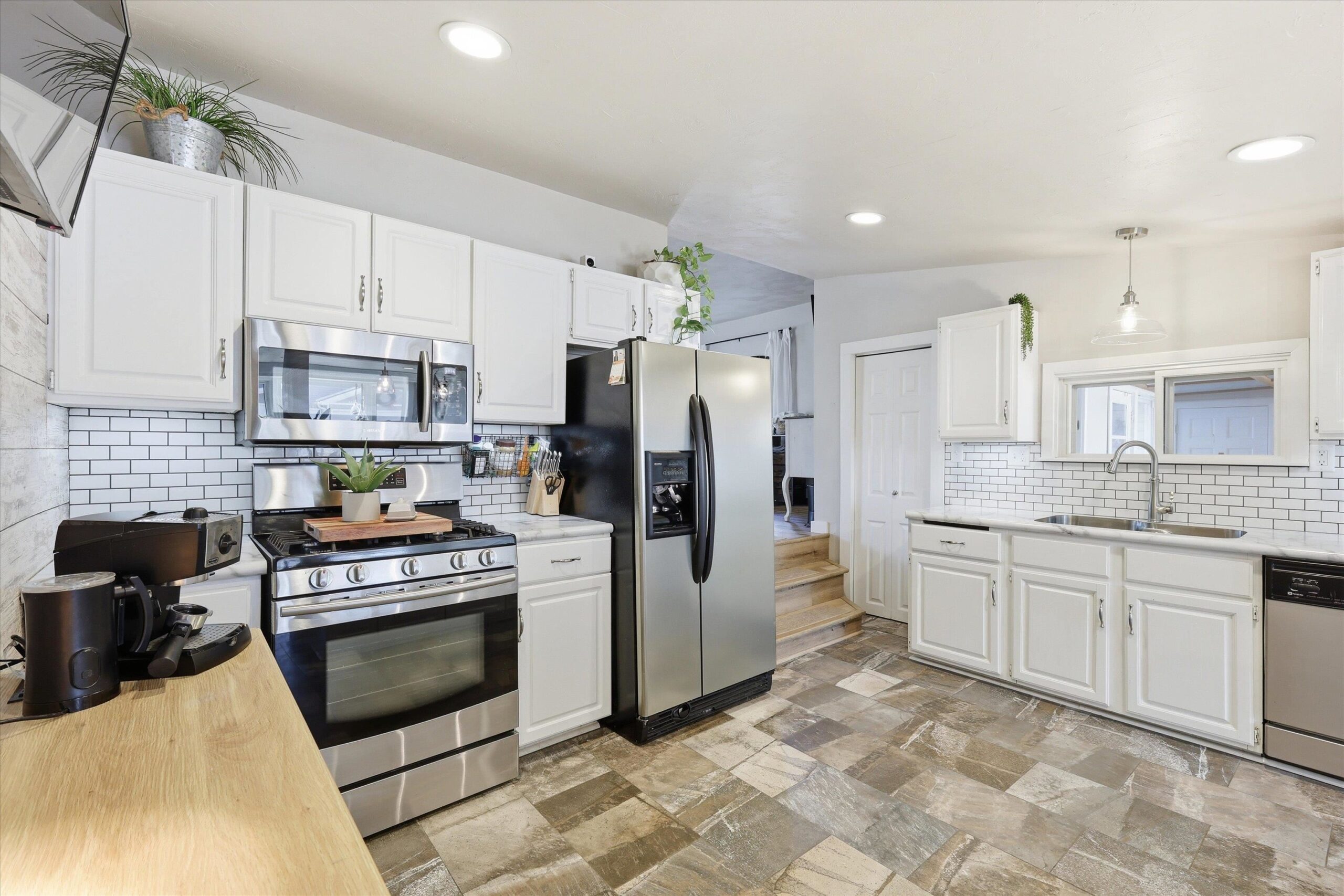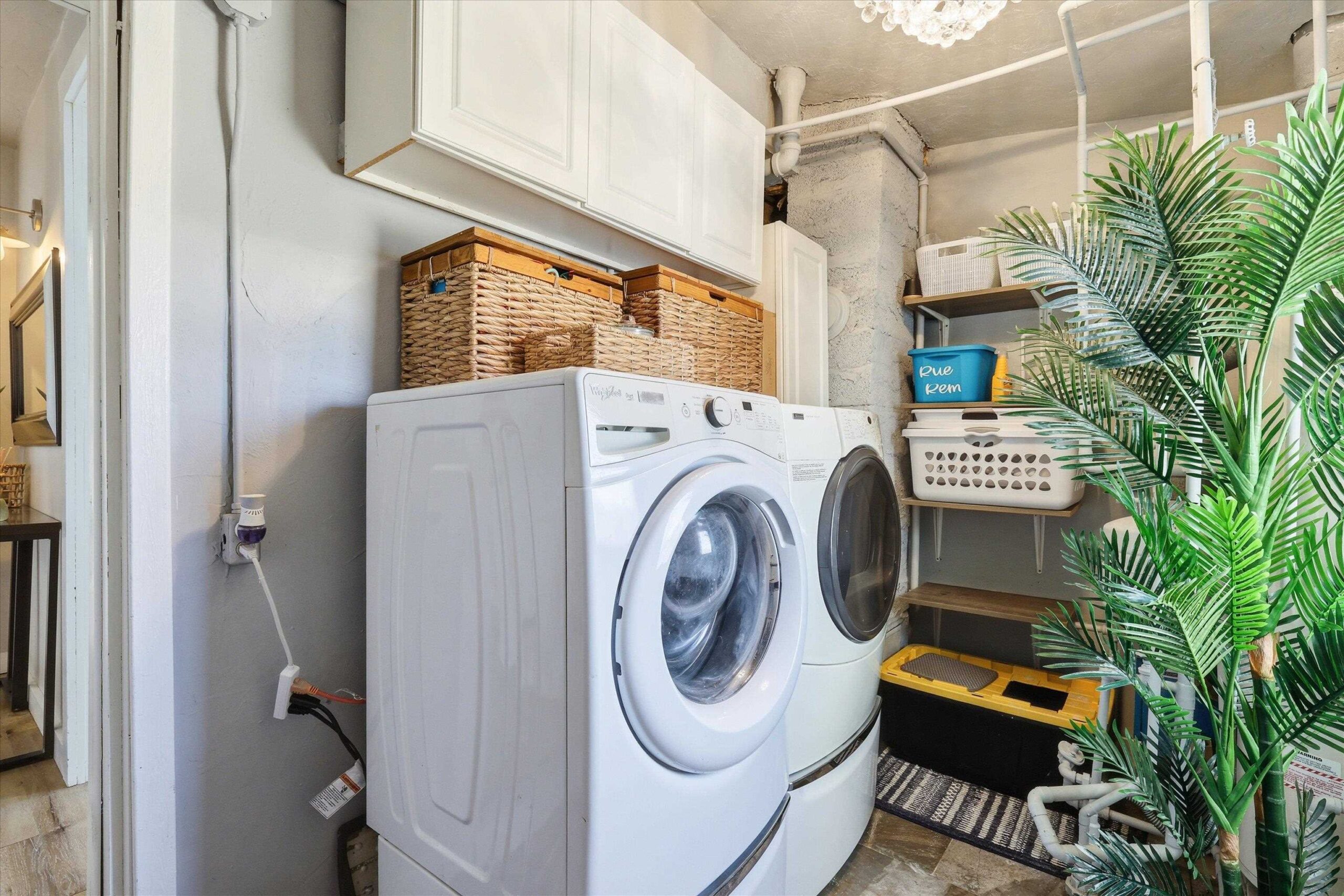 Refrigerator, Stove/Oven, Microwave, Dishwasher, Washer, Dryer, 2 window a/c units, 2 portable a/c units.