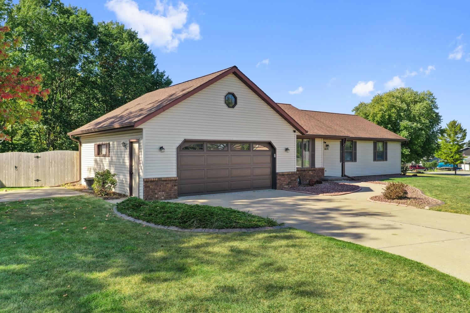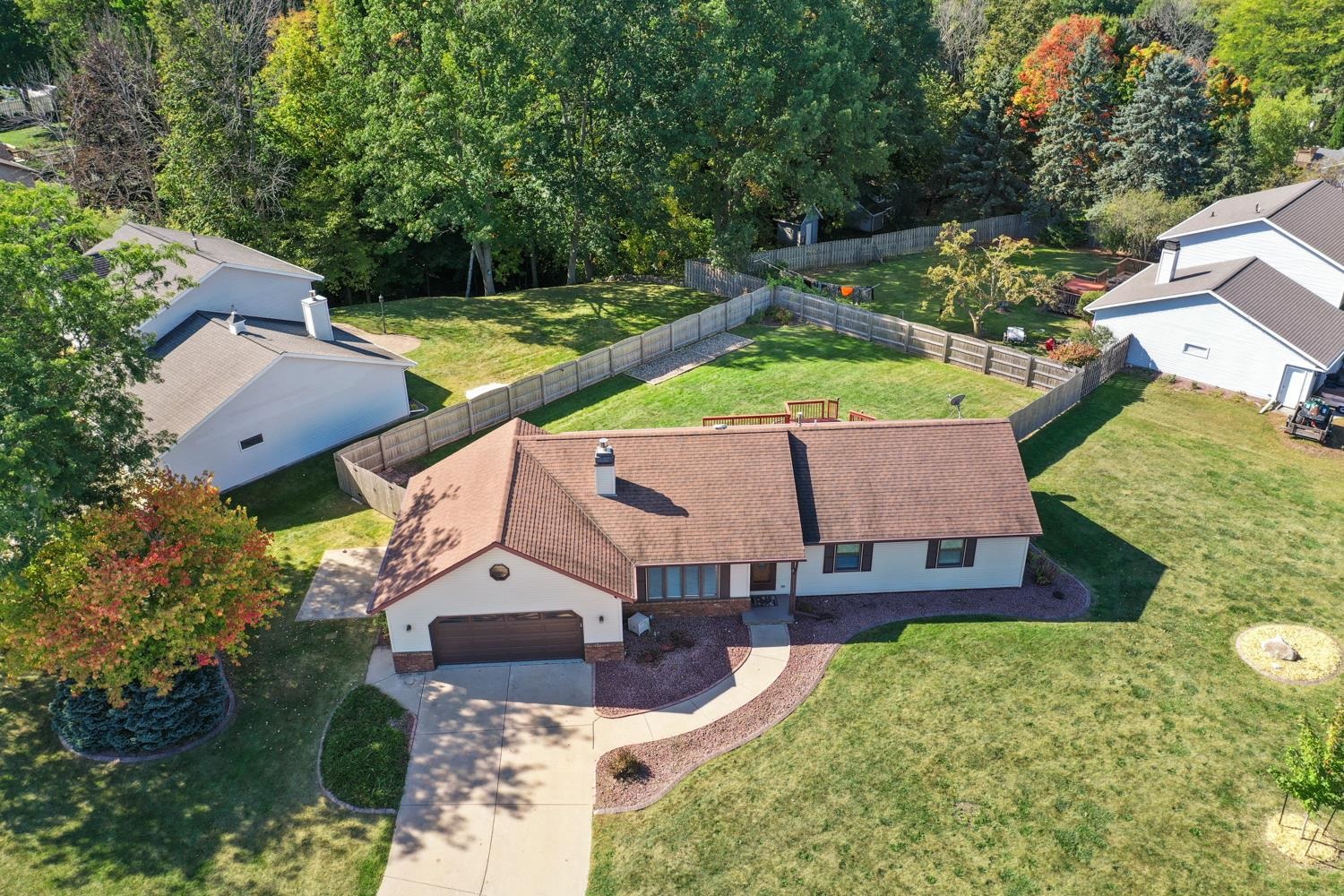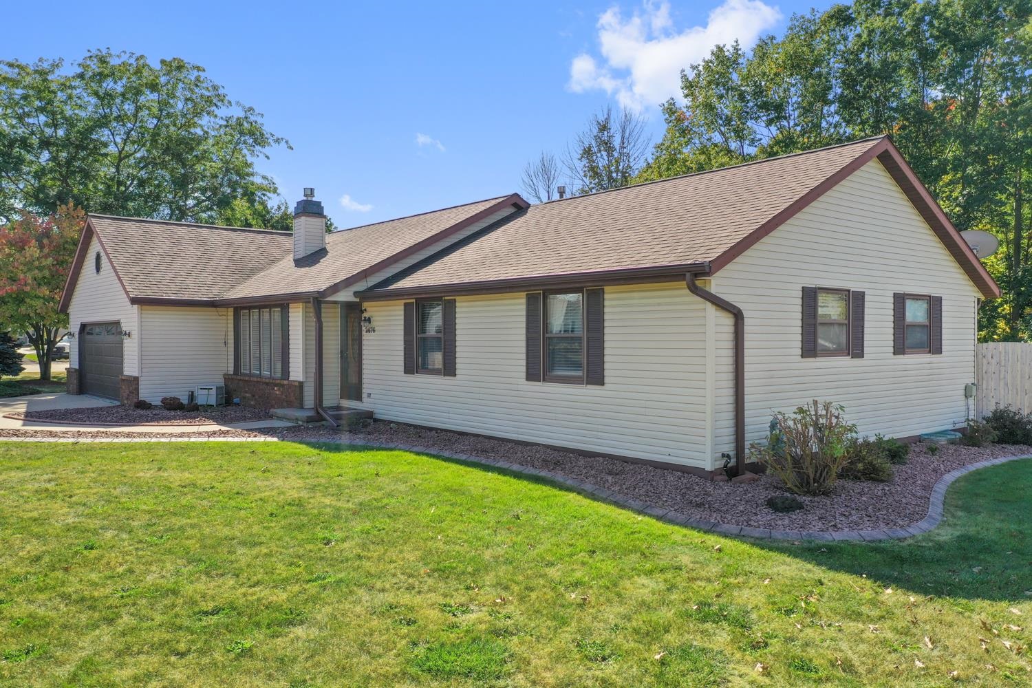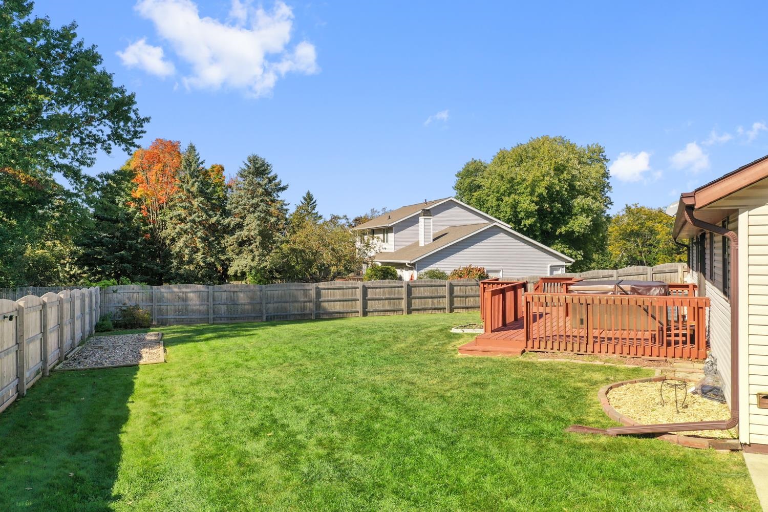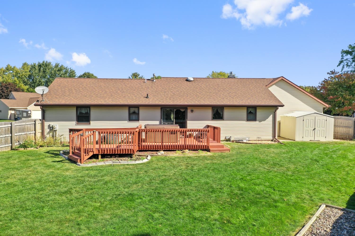 Charming 3BR/2.5BA ranch home on a nicely landscaped corner lot greets w/ sunken LR, cathedral knotty-pine ceiling & gas fireplace! Fully-equipped kitchen w/ suite of stainless-steel appliances, ample cabinetry, granite counters w/ buffet & pantry. Half-bath w/ 1st floor laundry includes washer+dryer! Sliding door opens from dining area to deck w/ hot-tub, fully-fenced yard w/ double swing gate ('24), shed, autumn blaze maple trees ('23) and bonus patio in side-yard. Primary bedroom w/ twin closets. Lower level offers 750+sqft of add'l finished space composed of a large fam-room, office, and 2nd full bath. WH 2025, central A/C serviced 2024. Offers due 10/5/25 at 8 pm; Reviewed 10/6/25.