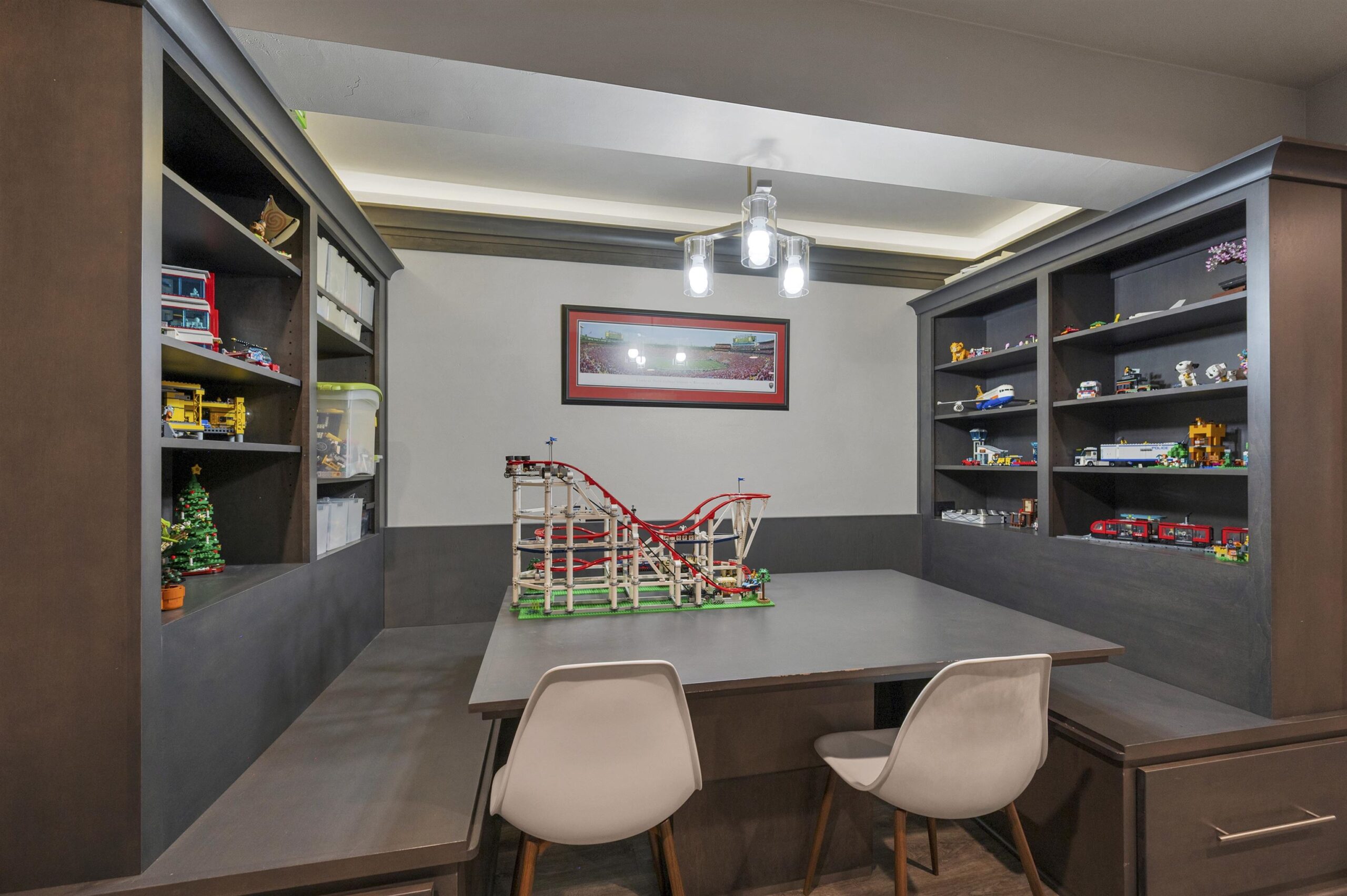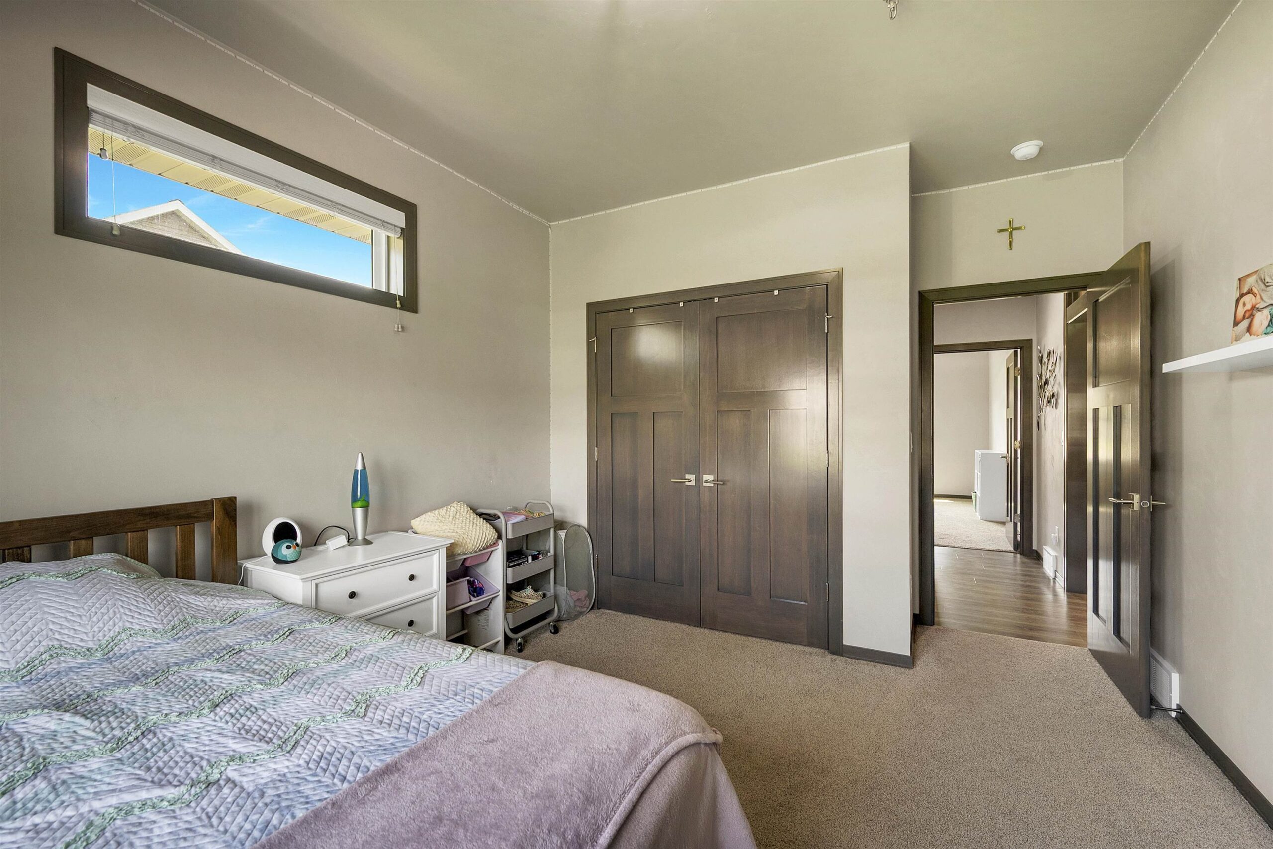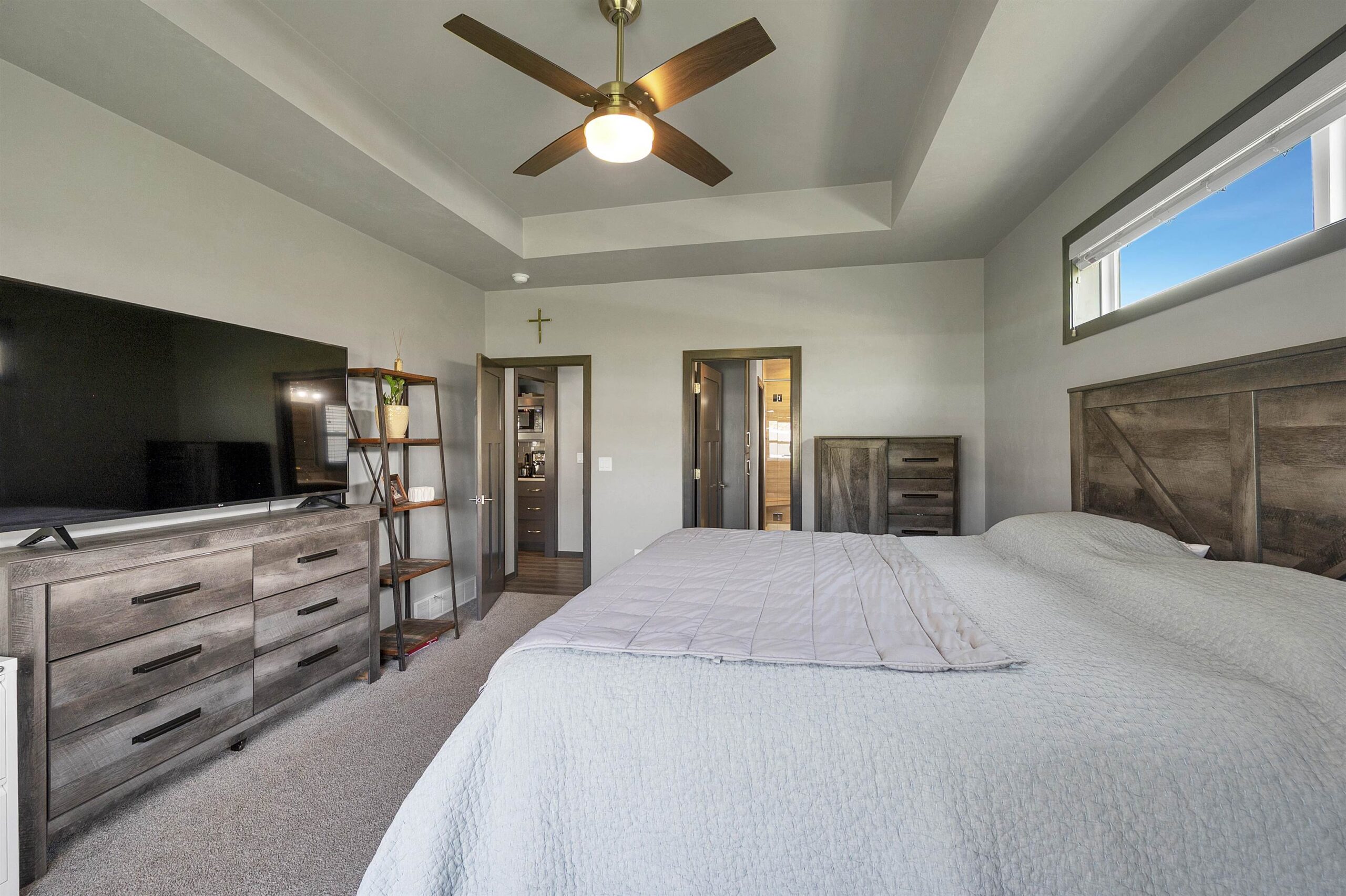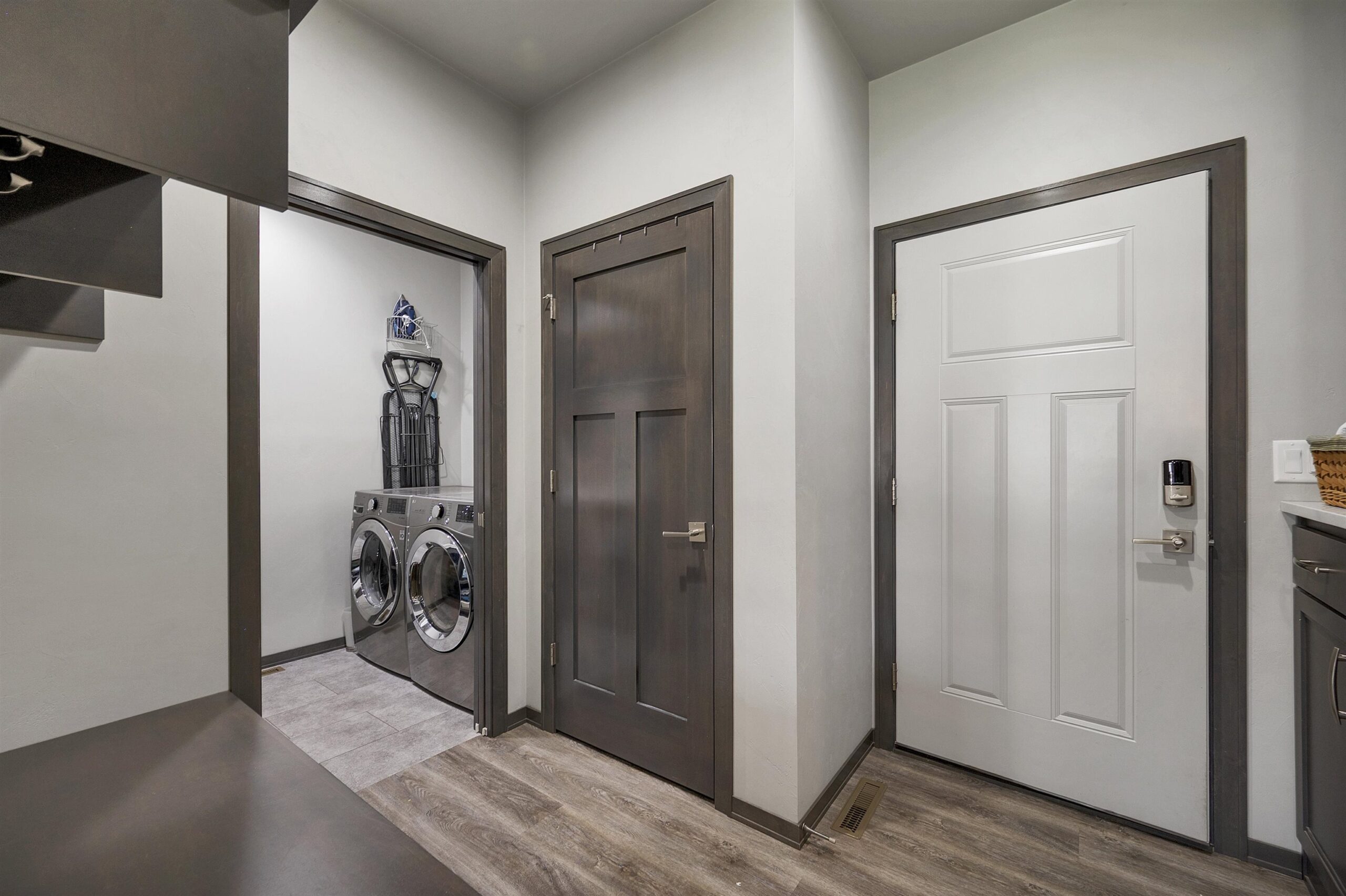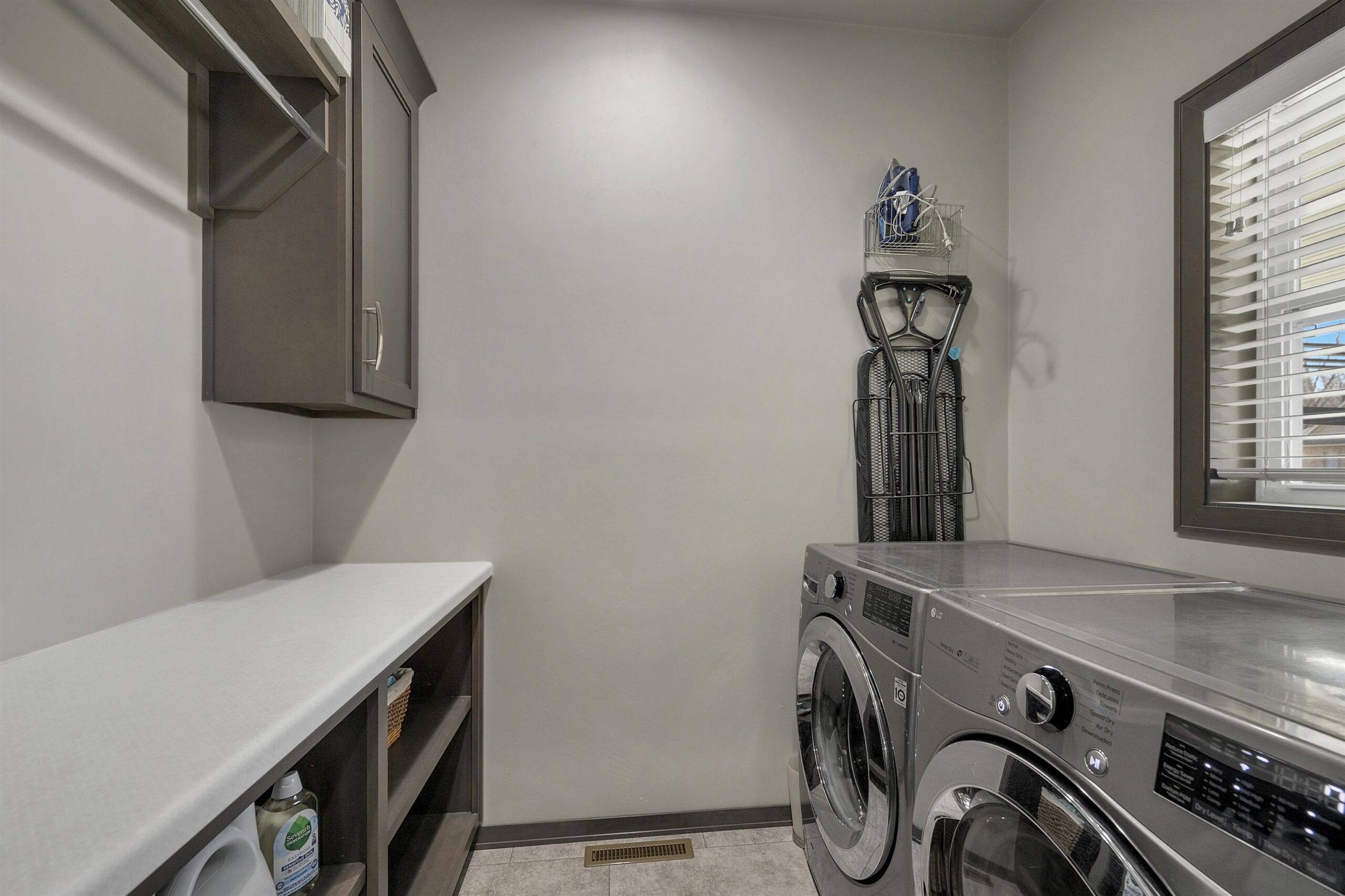 washer, dryer, refrigerator, stove, microwave, ceiling-attached storage in garage, Murphy bed and wardrobe in lower bed, blinds, security cameras