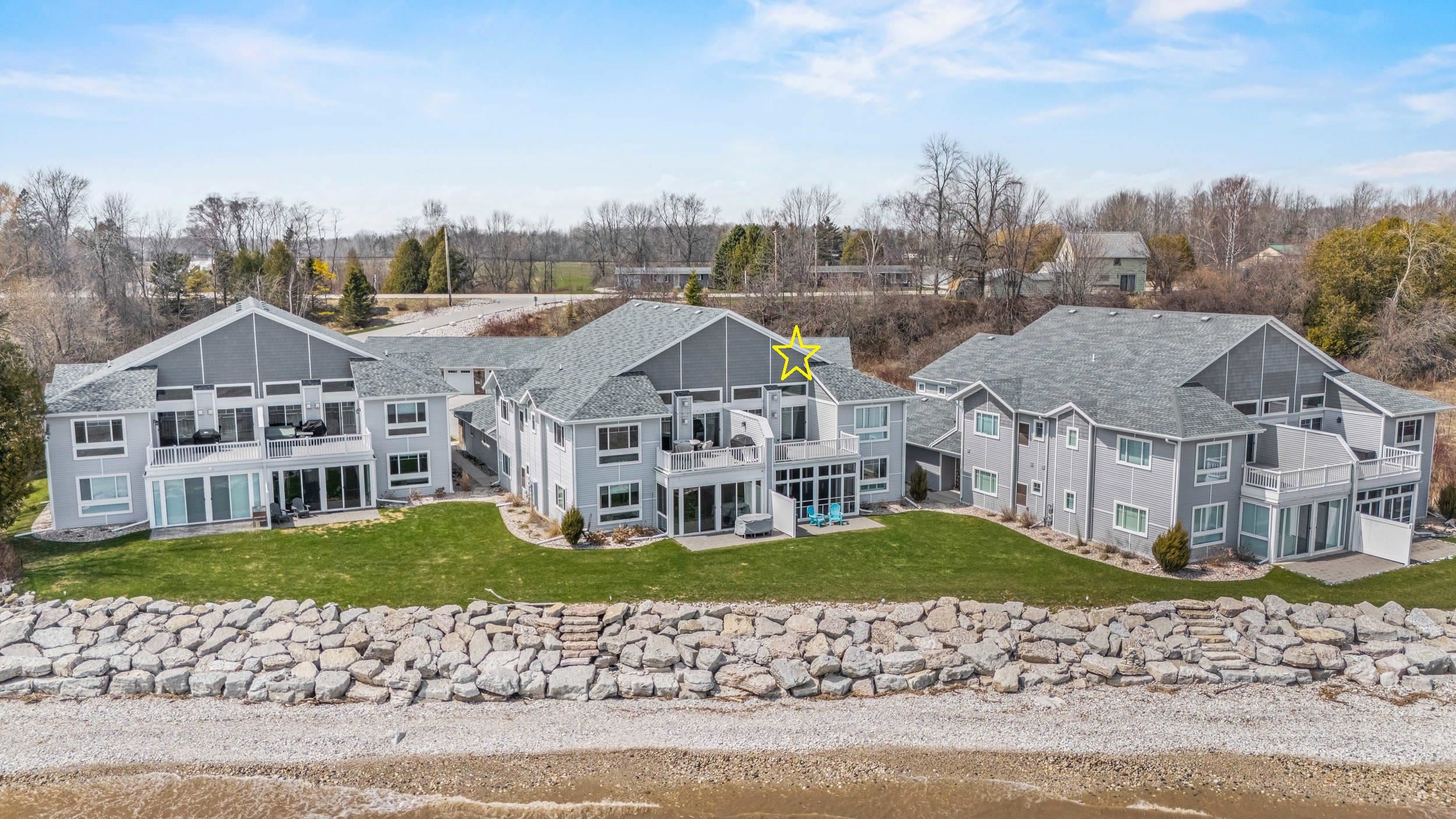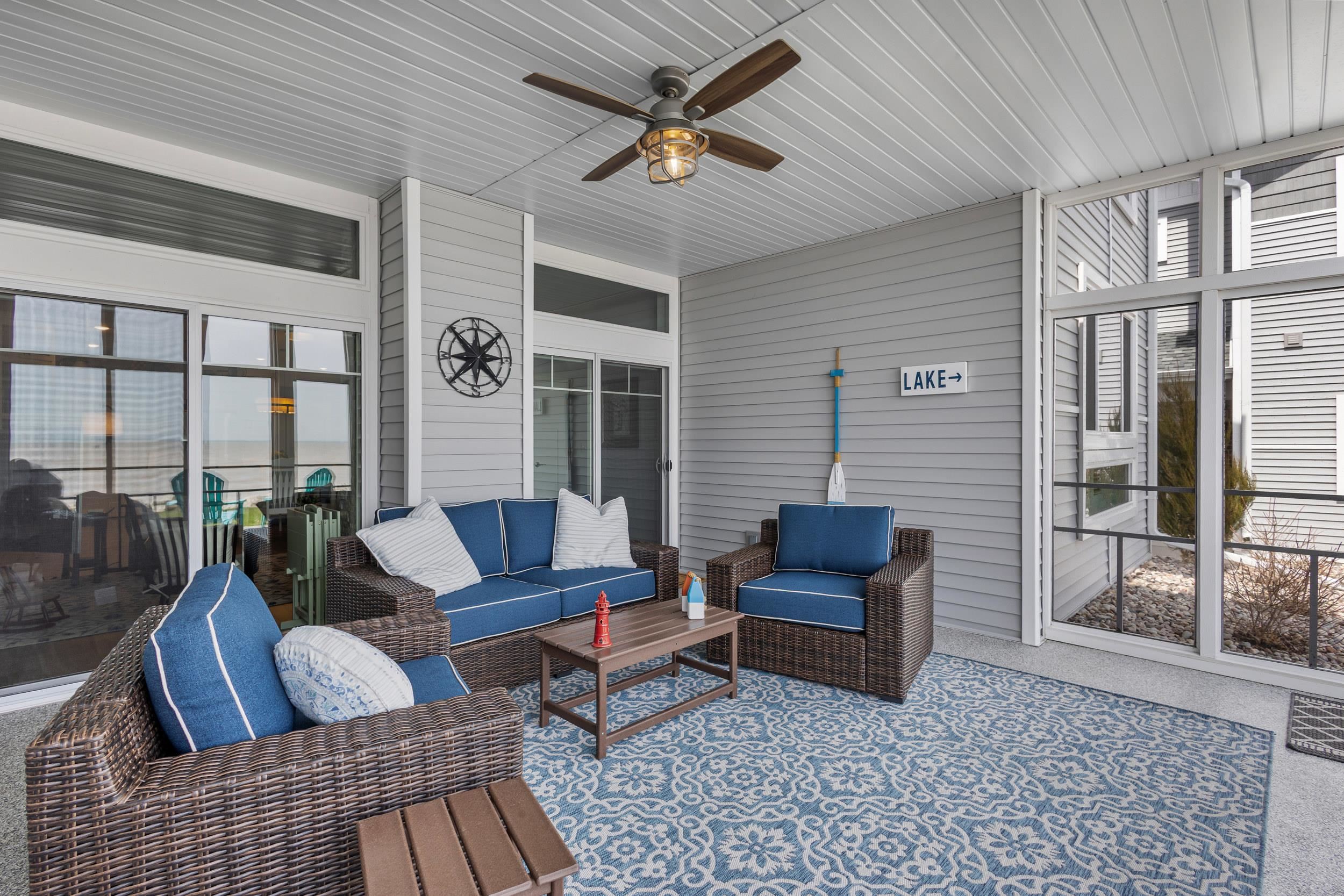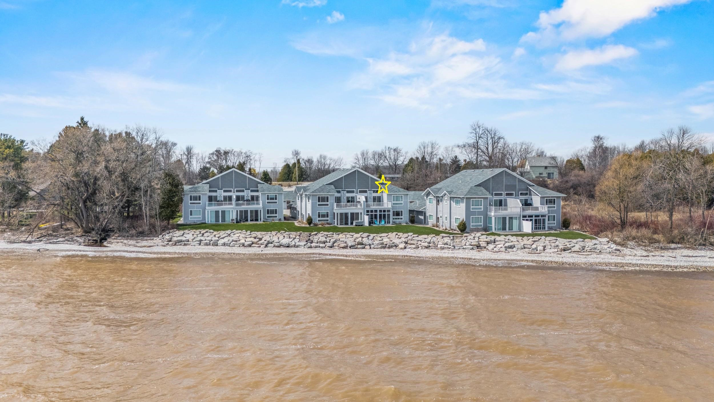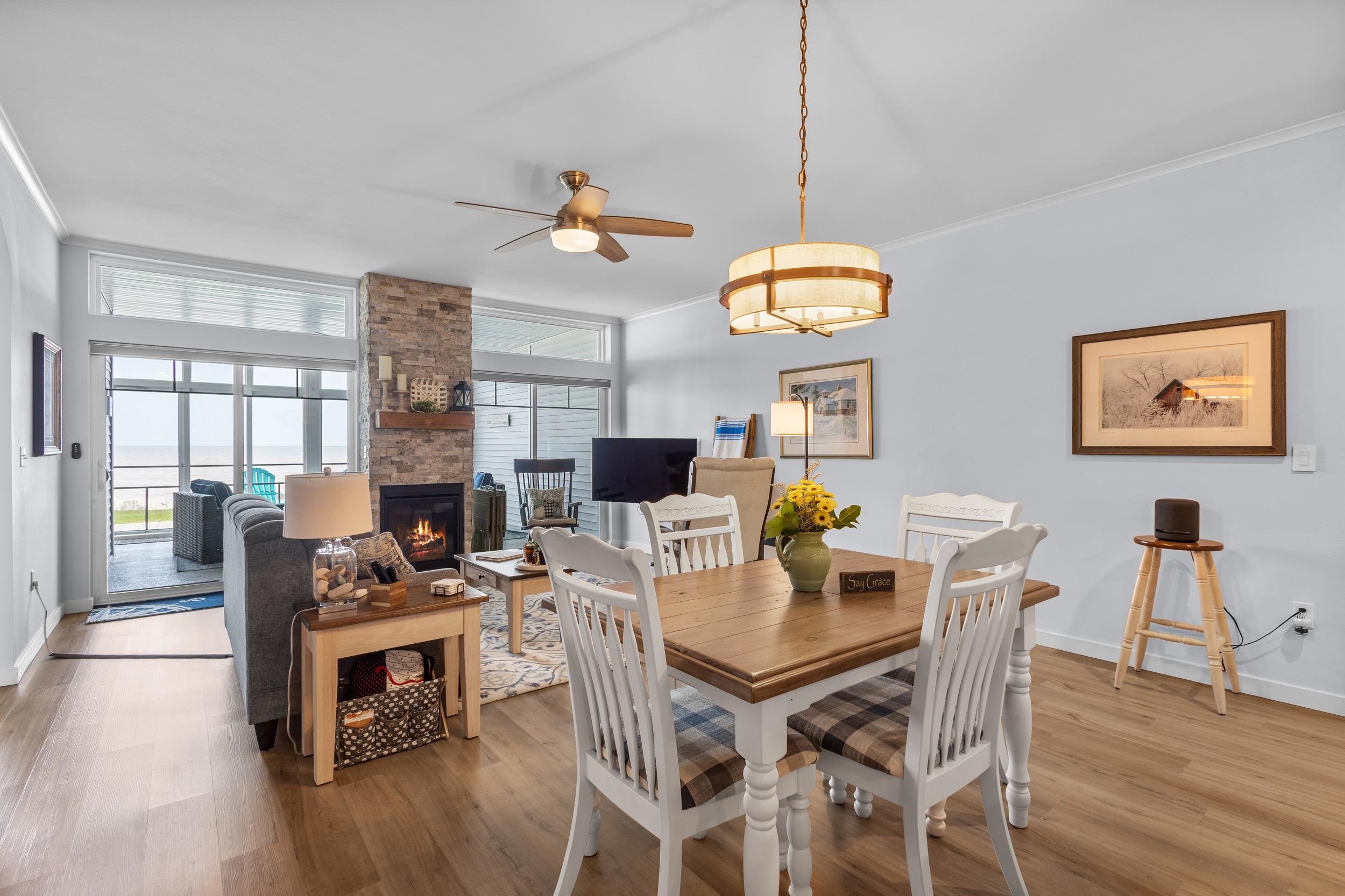 Welcome to The Waterfront Nantucket Nook on the shores of Lake Michigan! Sunrise, sand beach, stroll to the Historic Downtown Wine venues. Kick back in this chill condo & lounge on the breezy screened-in porch. Whip up meals in the custom kitchen with an island perfect for noshing & hosting. Cozy up by the fire for those blissful, warm nights. The Owner's Suite features a grand picture window, a walk-in closet big enough for a car , dual sinks, fog-free mirrors for the perfect selfie, a walk-in shower, & a private throne room. This 2-bed, 2-bath home is all on one level, with a tandem garage, a laundry room, & a foyer closet. Plus, the first garage stall is ready to flex into whatever you dream up! Furry friends welcome. No rentals. Sellers need a short rent-back and to close by 6/5/2026.