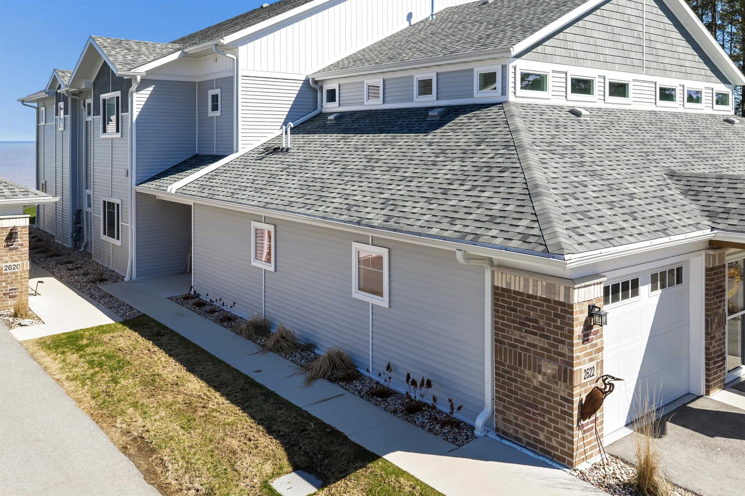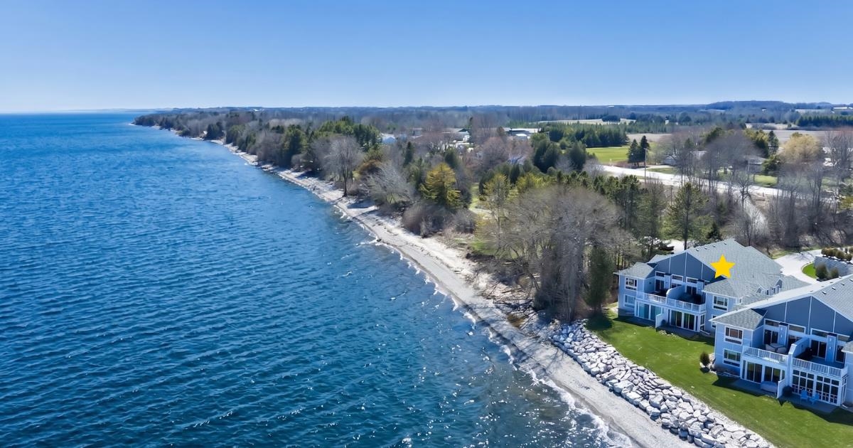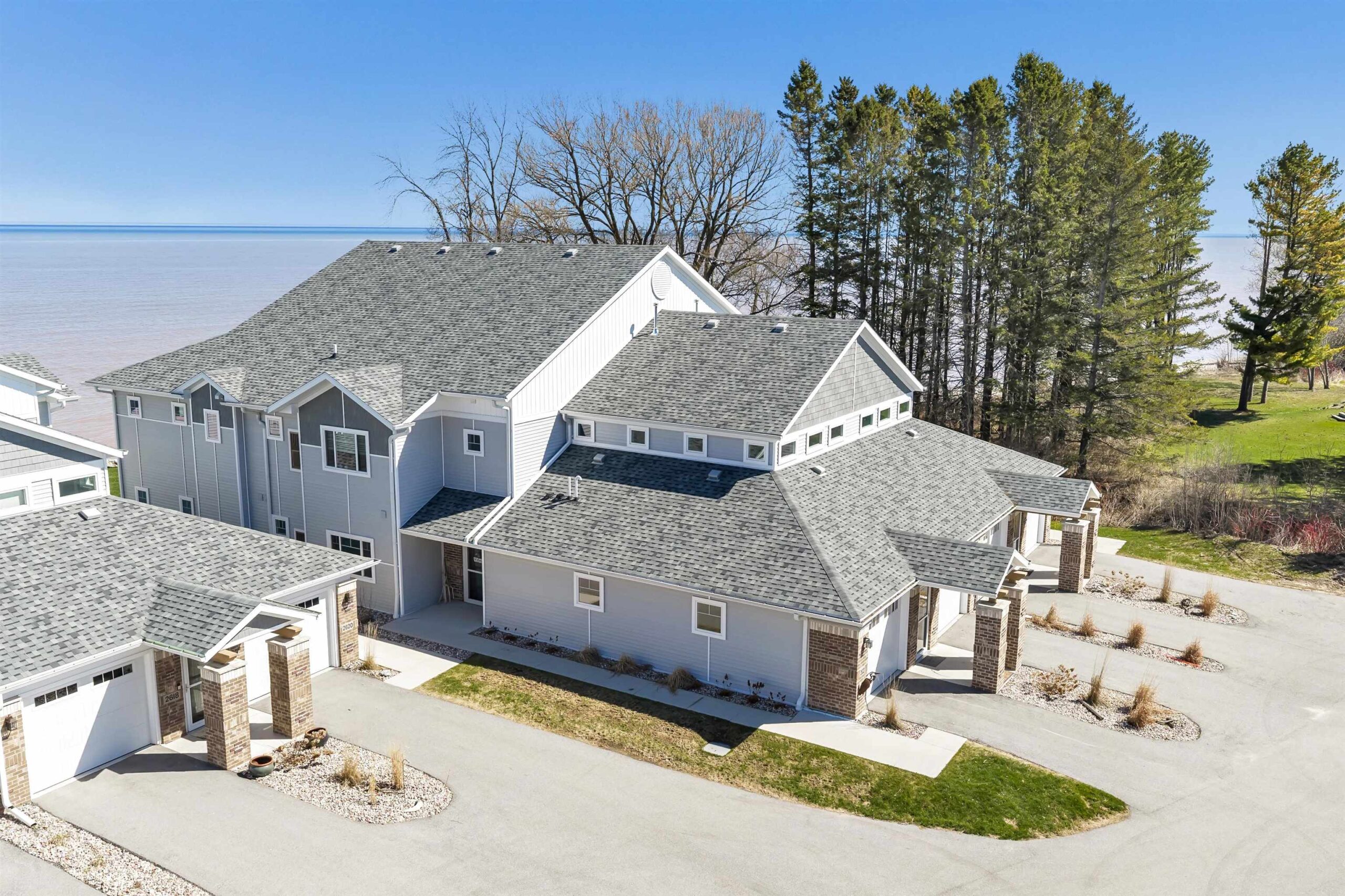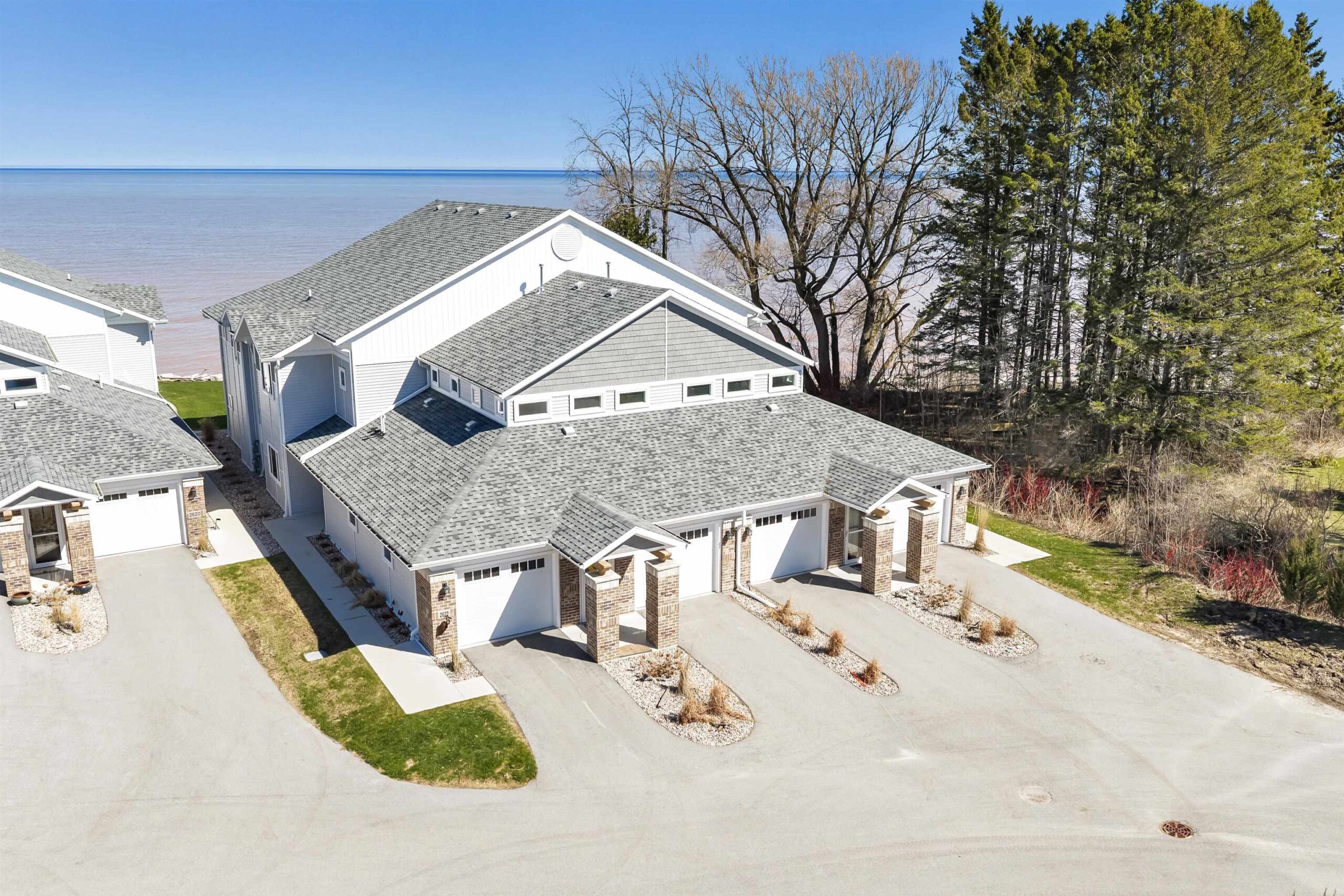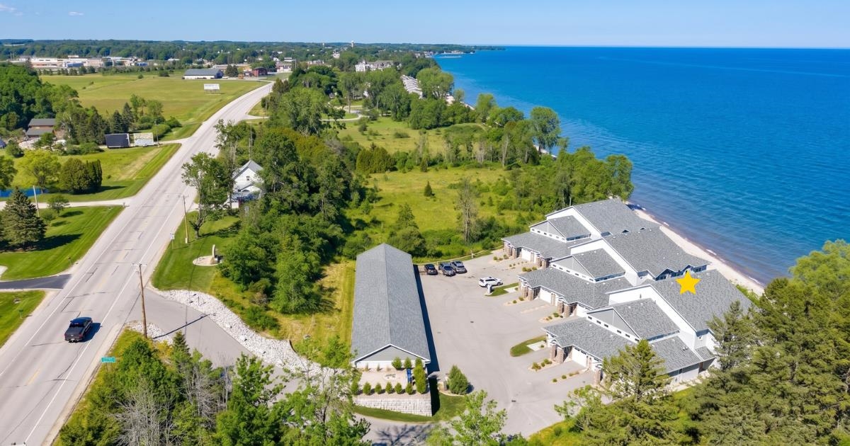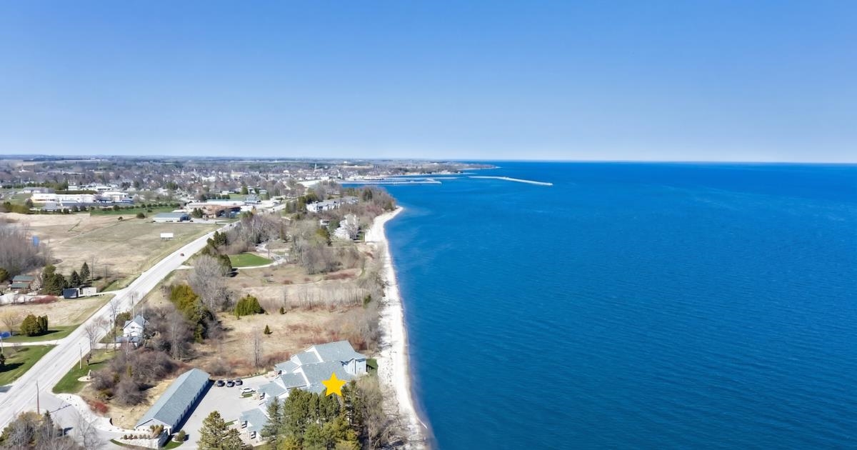 Experience tranquil lakefront luxury at Bell Harbour! This rare 2022 Showcase unit is just 50ft from Lake Michigan. Spanning 1800+ sq ft of one-level luxury living, it offers a generous 3 beds, 2 baths, vaulted ceilings, maple cabinetry & in-floor radiant heat to keep your toes toasty. The open-concept living area features a stone-faced gas fireplace. The gourmet kitchen is dreamy w/ high-end finishes, quartz counters, gas stove & w/in butler’s pantry. Relax in panoramic water views from the gorgeous 4-season room or walk to sandy Algoma beach & lighthouse. Includes an attached garage plus a 2-stall tandem detached garage, ideal for boats & gear. Enjoy the maintenance-free, "lock & leave" condo lifestyle! A great getaway or year-round home just 20 miles from Sturgeon Bay! Virtual coloring.