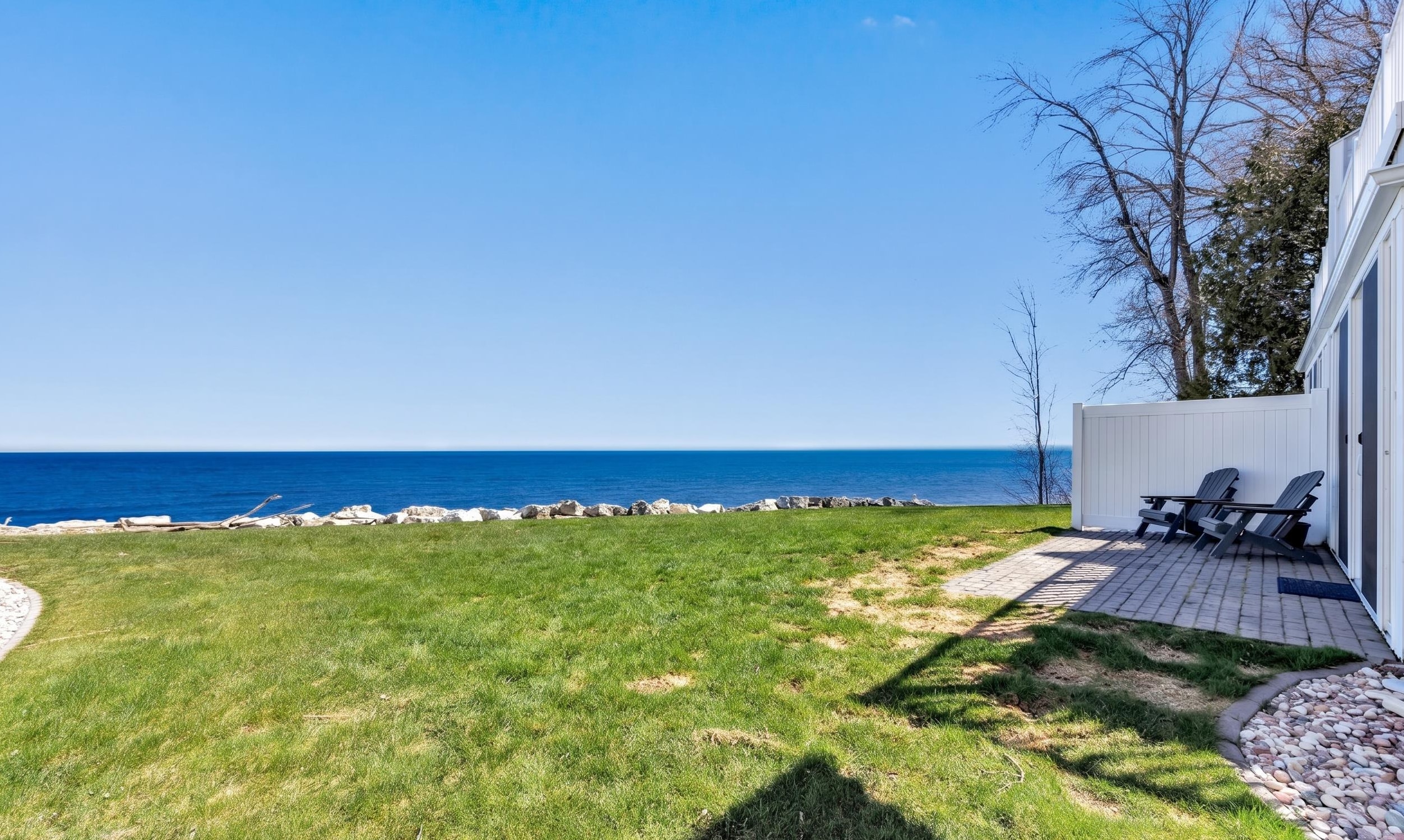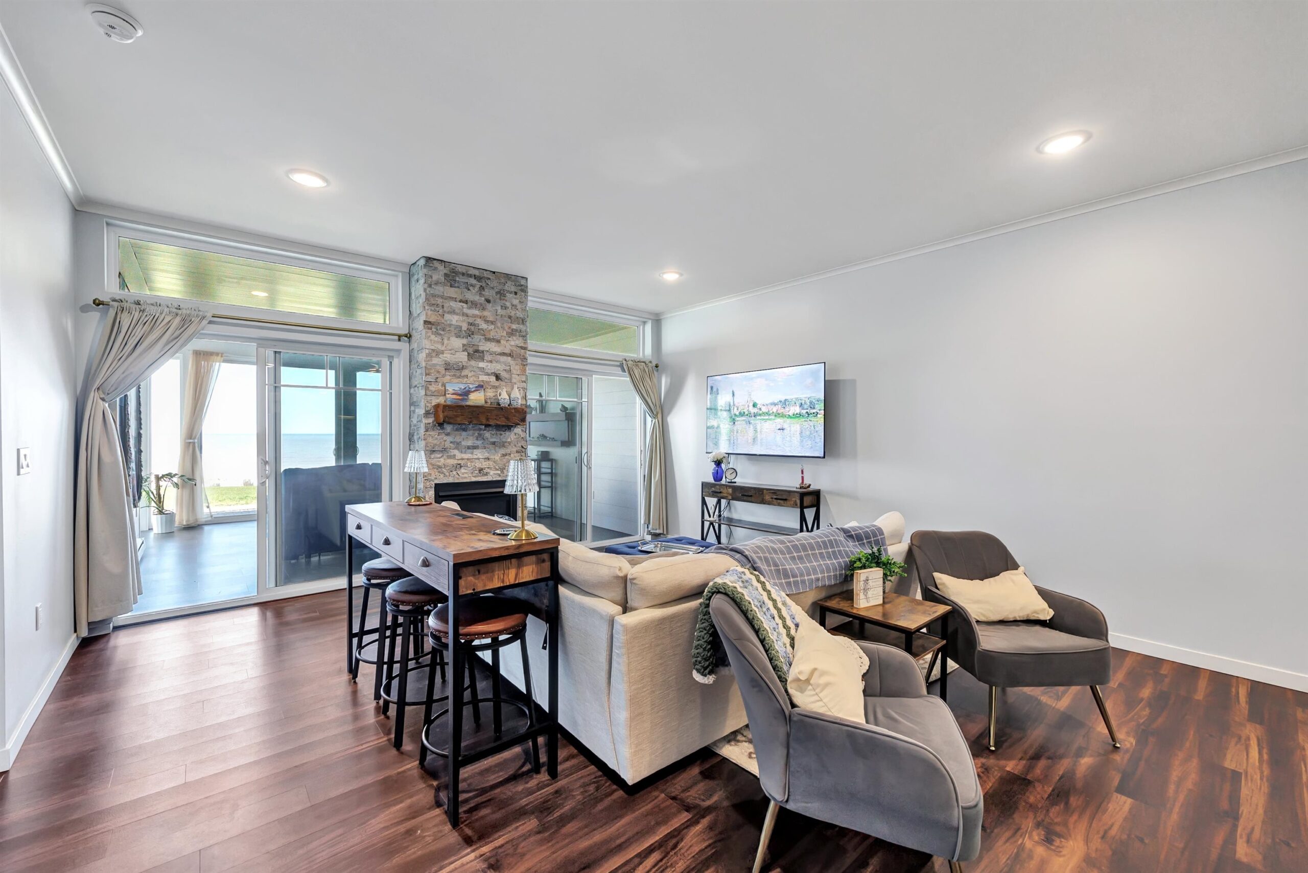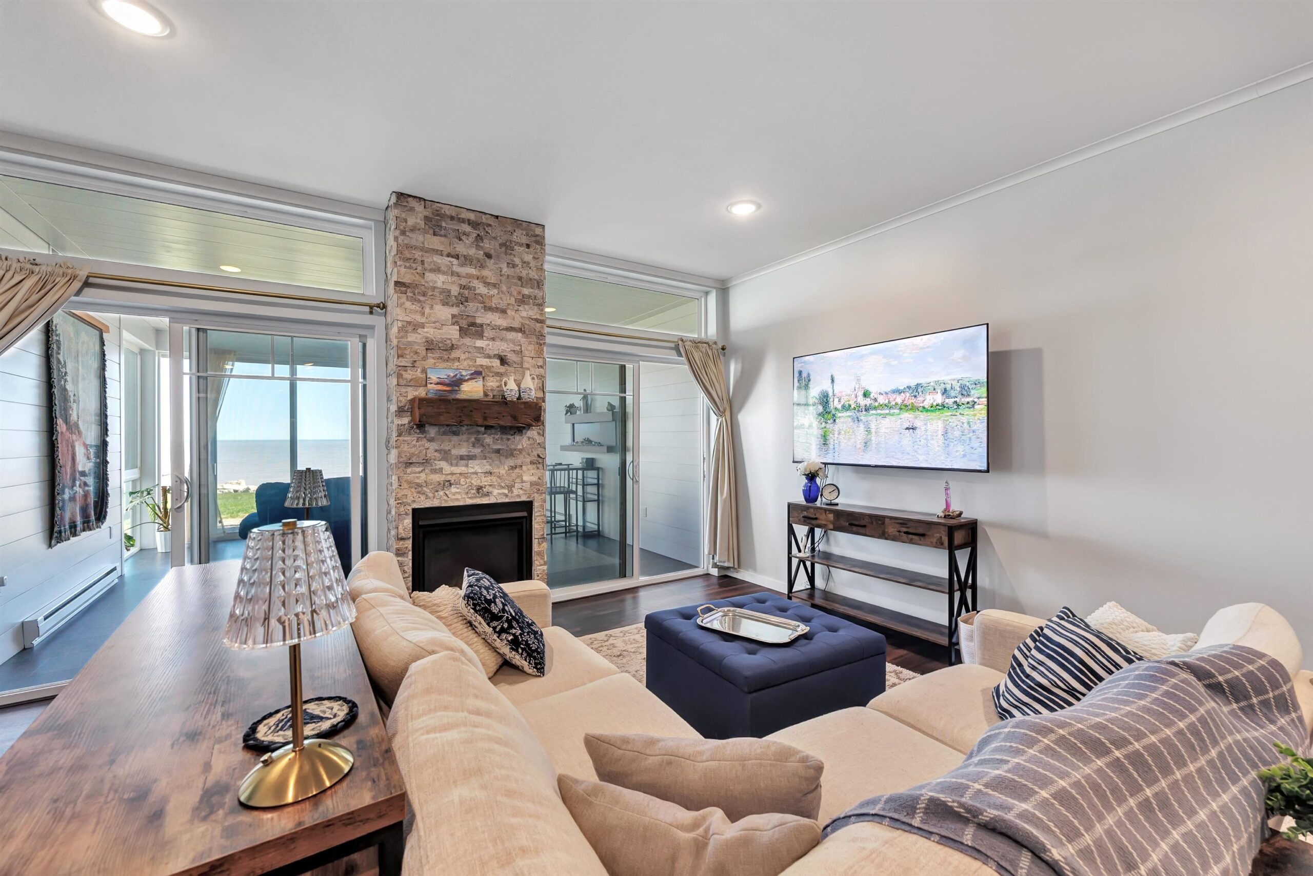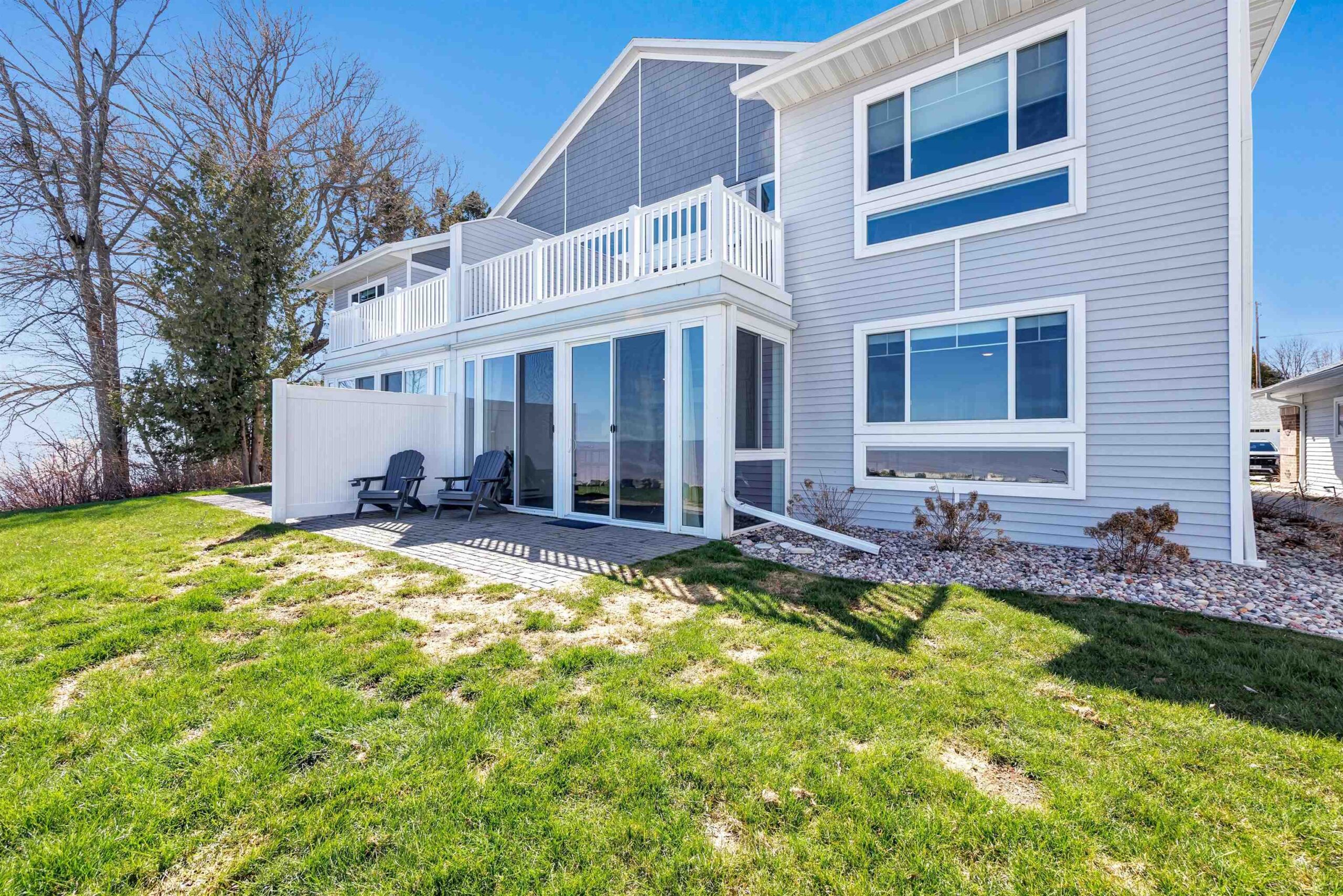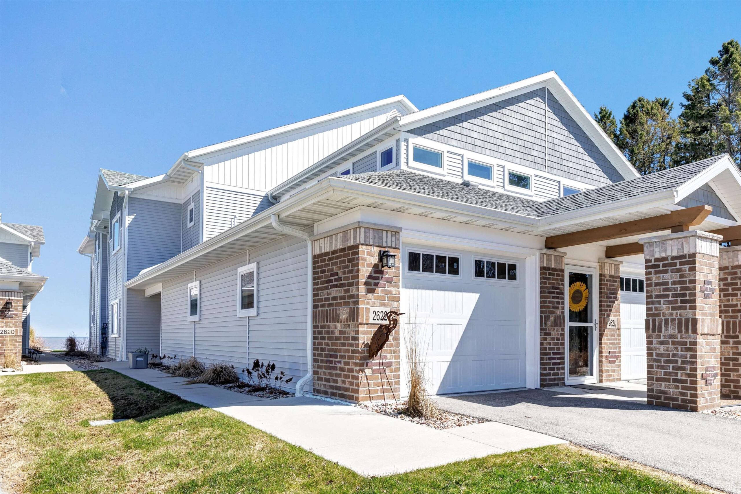 Experience tranquil lakefront luxury at Bell Harbour! This rare 2022 Showcase unit is just 50ft from Lake Michigan. Spanning 1800+ sq ft of one-level luxury living, it offers a generous 3 beds, 2 baths, vaulted ceilings, maple cabinetry & in-floor radiant heat to keep your toes toasty. The open-concept living area features a stone-faced gas fireplace. The gourmet kitchen is dreamy w/ high-end finishes, quartz counters, gas stove & w/in butler’s pantry. Relax in panoramic water views from the gorgeous 4-season room or walk to sandy Algoma beach & lighthouse. Includes an attached garage plus a 2-stall tandem detached garage, ideal for boats & gear. Enjoy the maintenance-free, "lock & leave" condo lifestyle! A great getaway or year-round home just 20 miles from Sturgeon Bay! Virtual coloring.