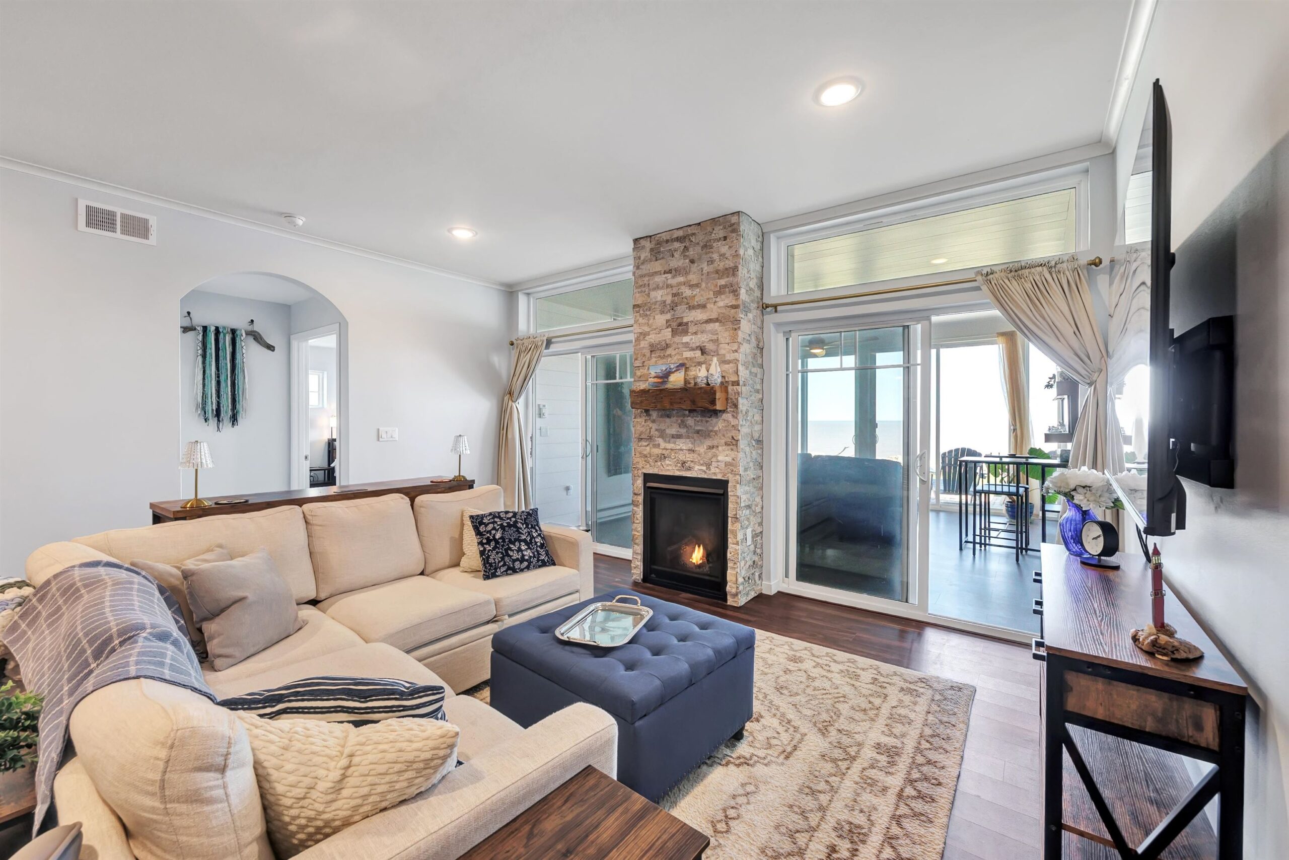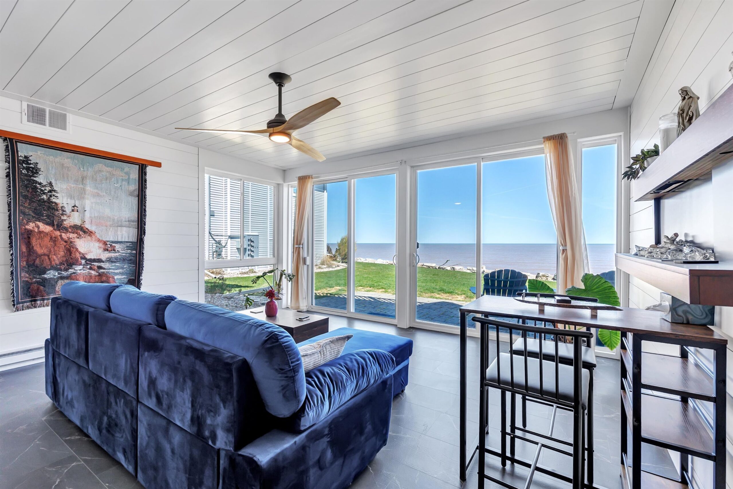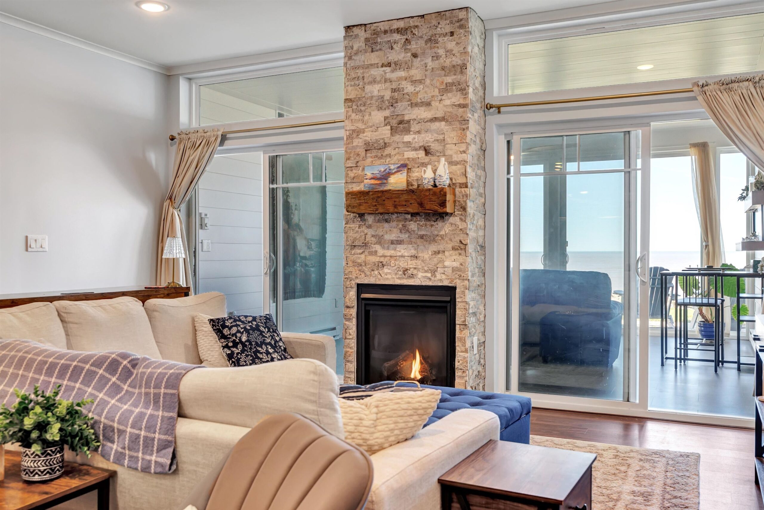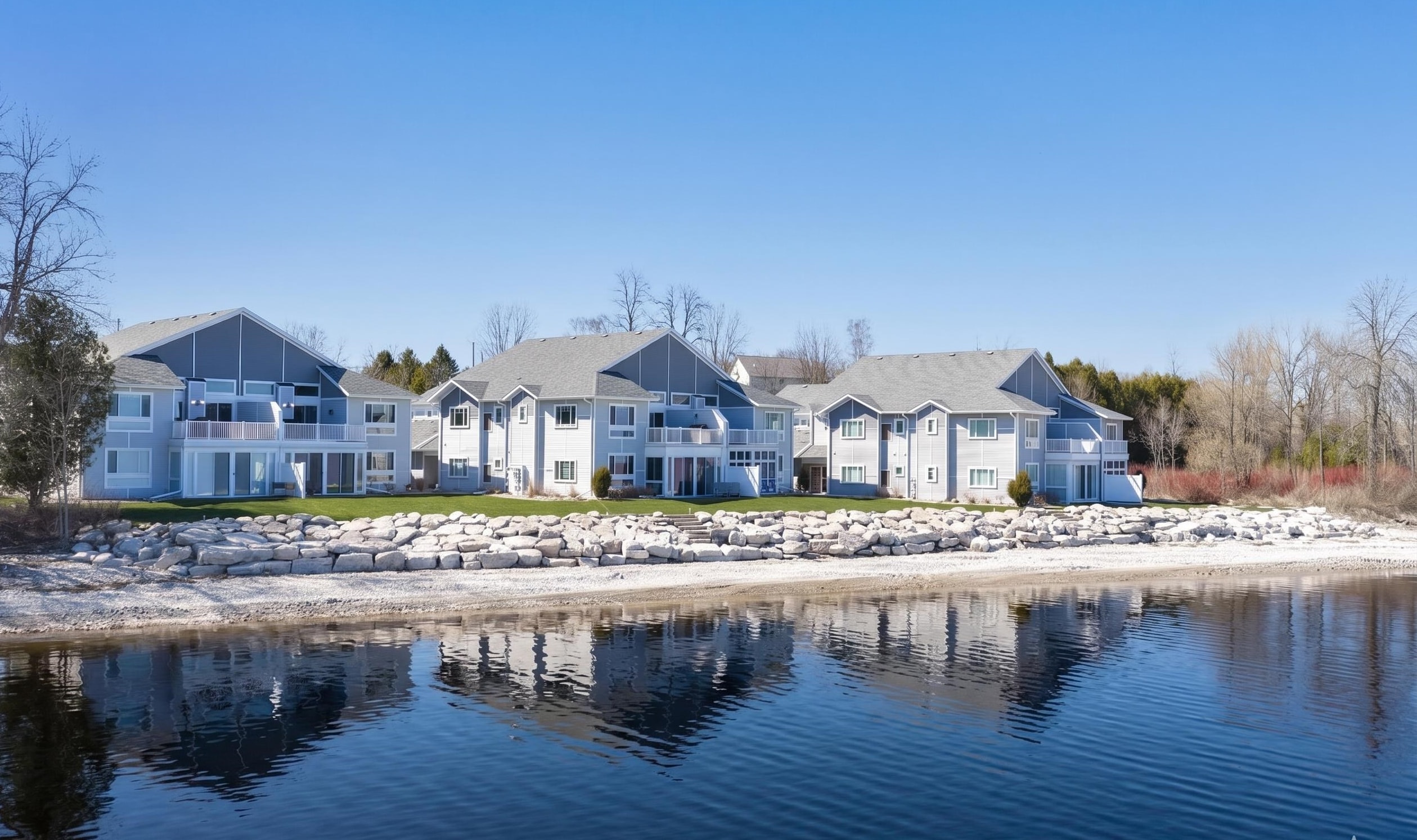 Experience tranquil lakefront luxury at Bell Harbour! This rare 2022 Showcase unit is just 50ft from Lake Michigan. Spanning 1800+ sq ft of one-level luxury living, it offers a generous 3 beds, 2 baths, vaulted ceilings, maple cabinetry & in-floor radiant heat to keep your toes toasty. The open-concept living area features a stone-faced gas fireplace. The gourmet kitchen is dreamy w/ high-end finishes, quartz counters, gas stove & w/in butler’s pantry. Relax in panoramic water views from the gorgeous 4-season room or walk to sandy Algoma beach & lighthouse. Includes an attached garage plus a 2-stall tandem detached garage, ideal for boats & gear. Enjoy the maintenance-free, "lock & leave" condo lifestyle! A great getaway or year-round home just 20 miles from Sturgeon Bay! Virtual coloring.