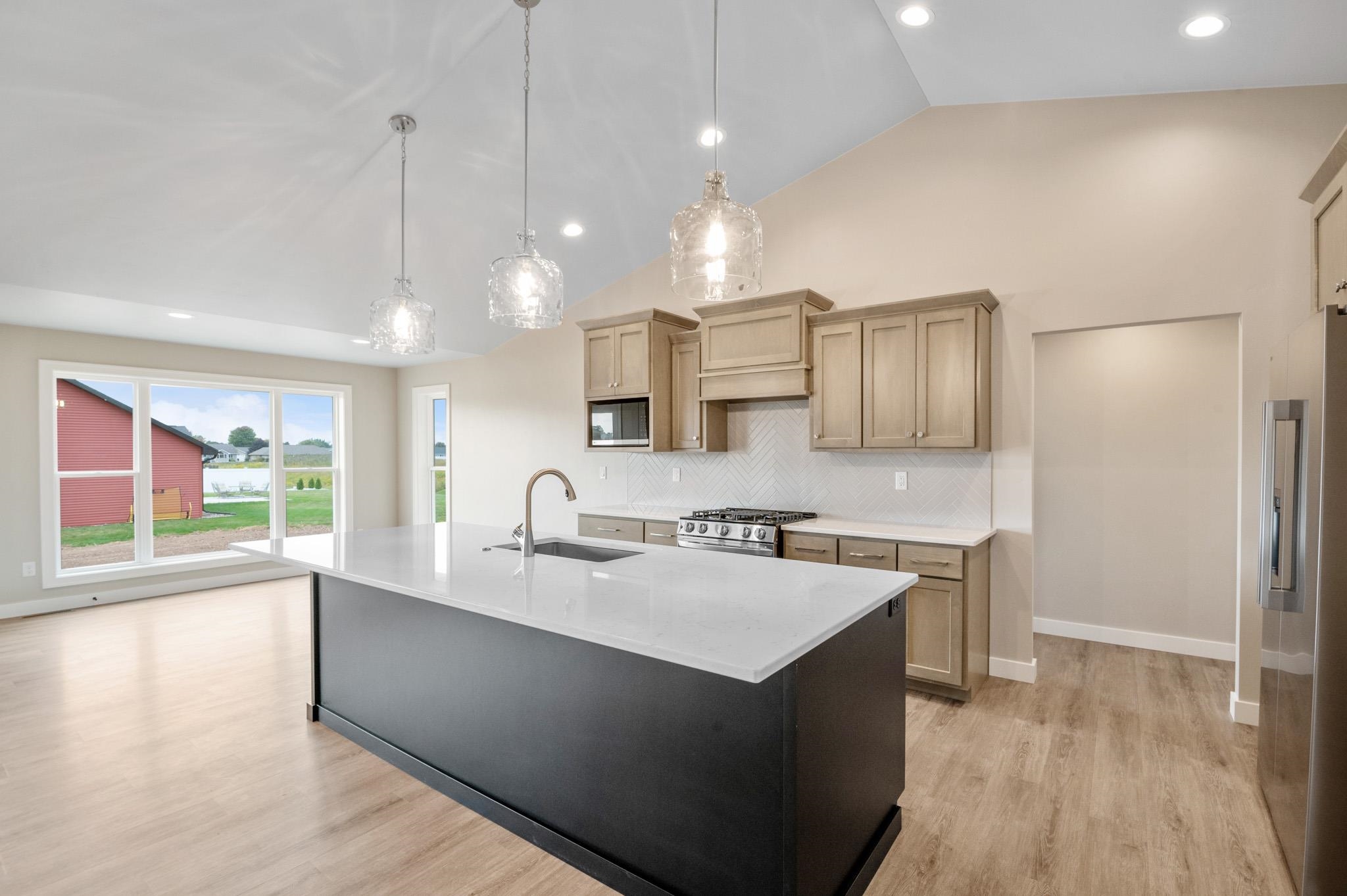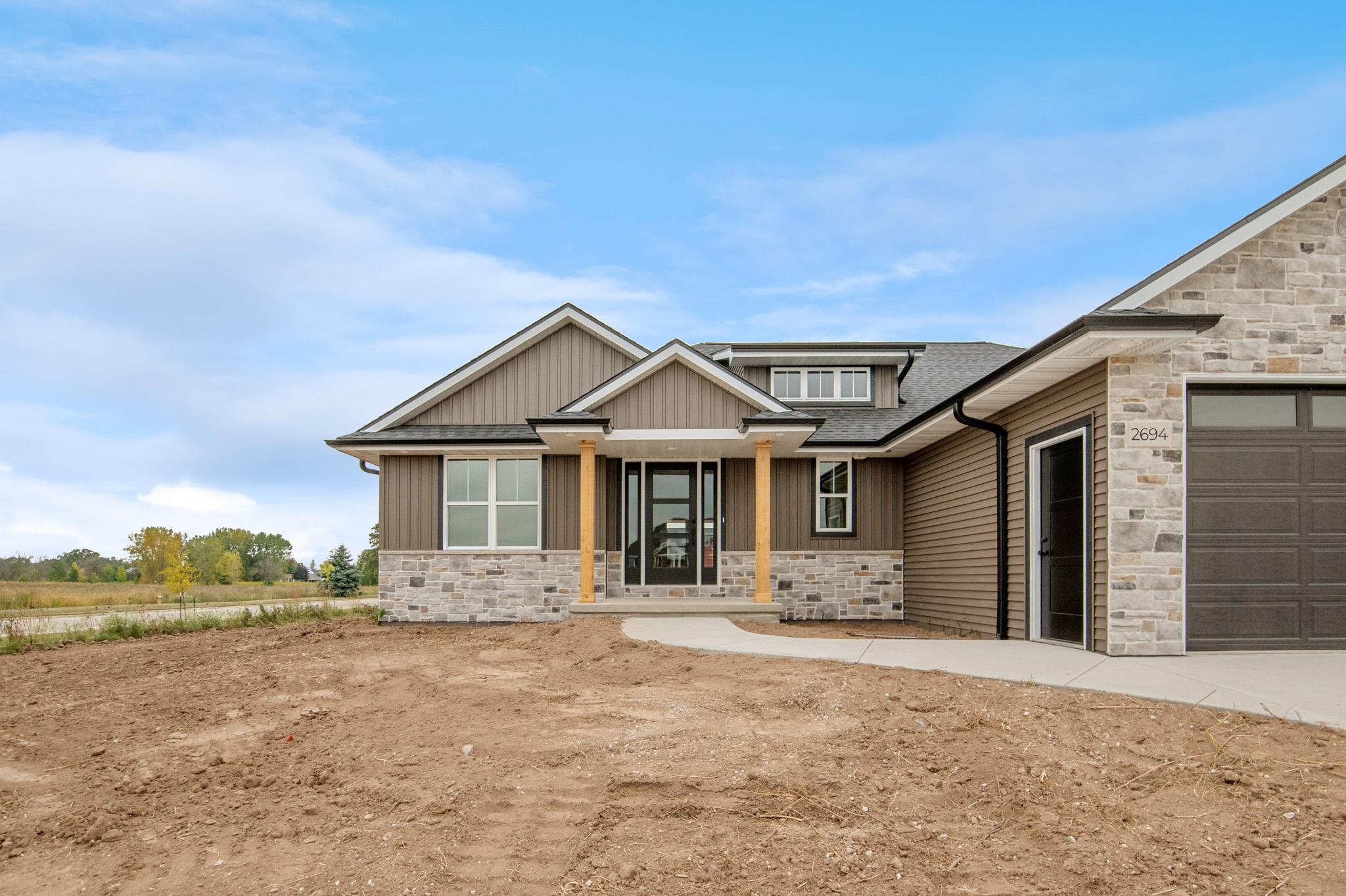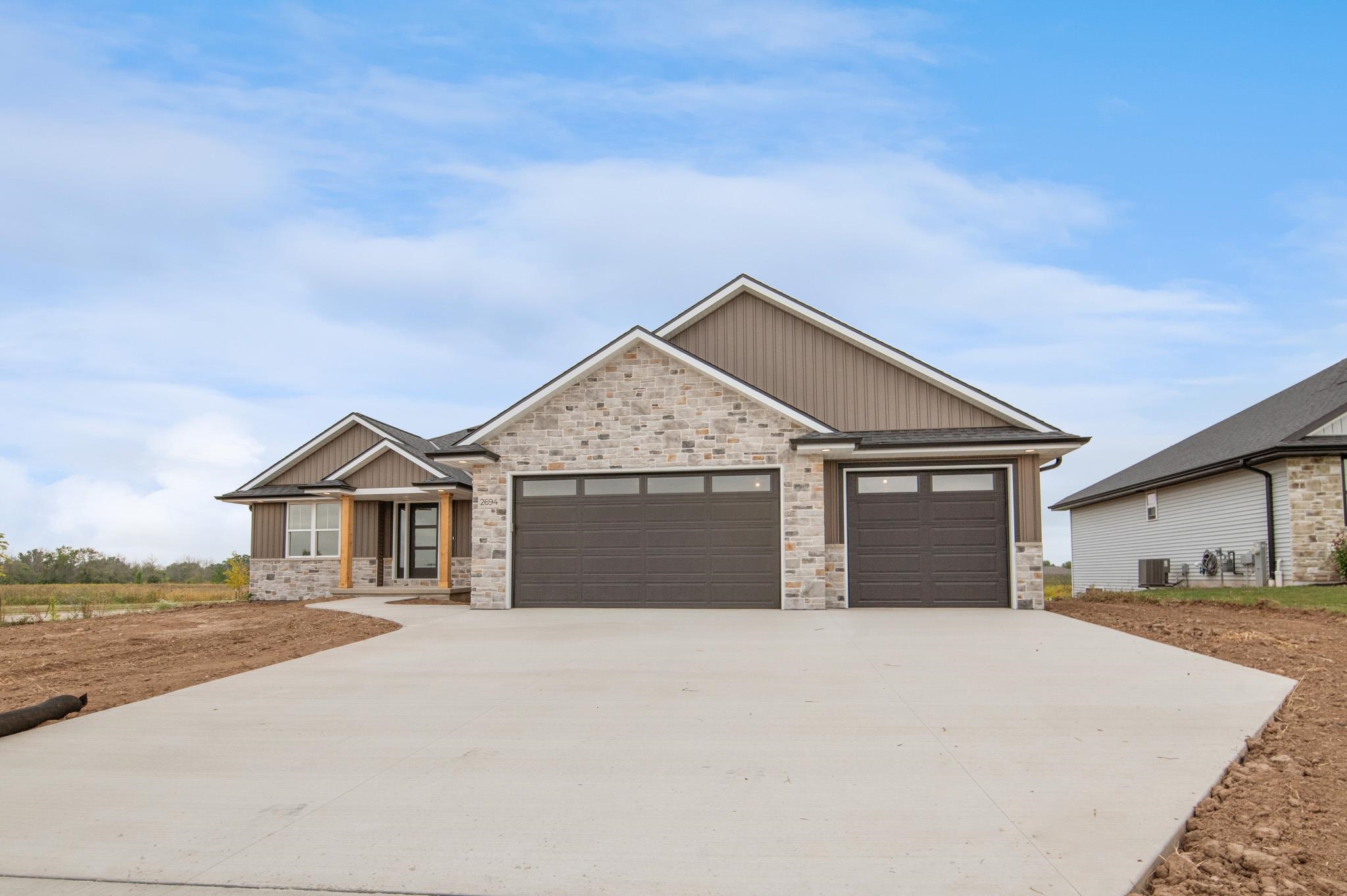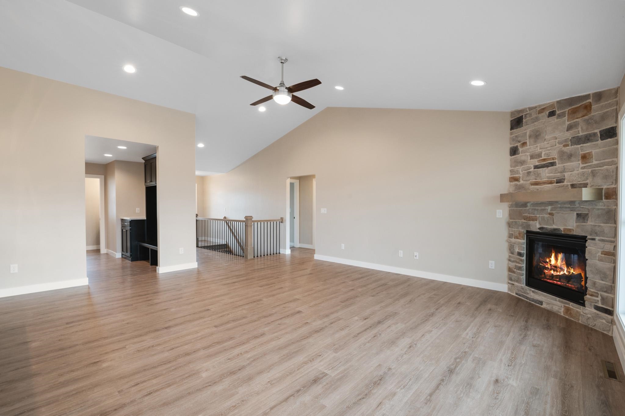 Welcome to the beautifully designed Oakdale Model! Step inside to an open concept layout filled with natural light, highlighted by large windows, a cozy gas fireplace, and a designated dining area that flows seamlessly into the living space. The spacious kitchen boasts high-end finishes including quartz countertops, a sleek tile backsplash, and a generous 6x8 walk-in pantry ideal for storage. Thoughtfully designed with a split-bedroom layout, this home includes a convenient locker system, laundry room, and a half bath with direct access to the oversized 3-stall garage. The luxurious primary suite features custom tile shower and walk-in closet. The lower level is prepped for future expansion with plumbing for a full bath and an egress window. 12x12 composite deck included!