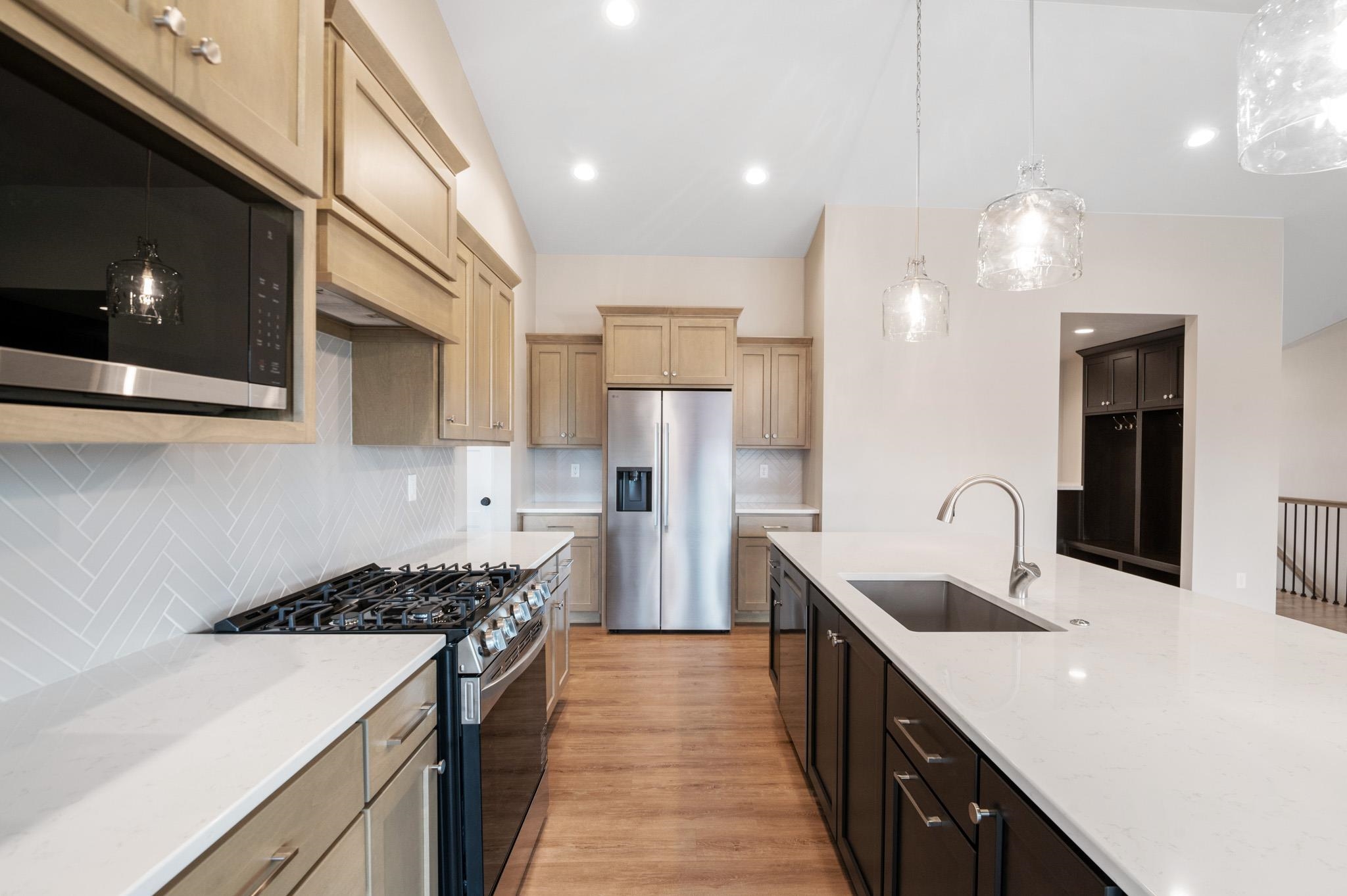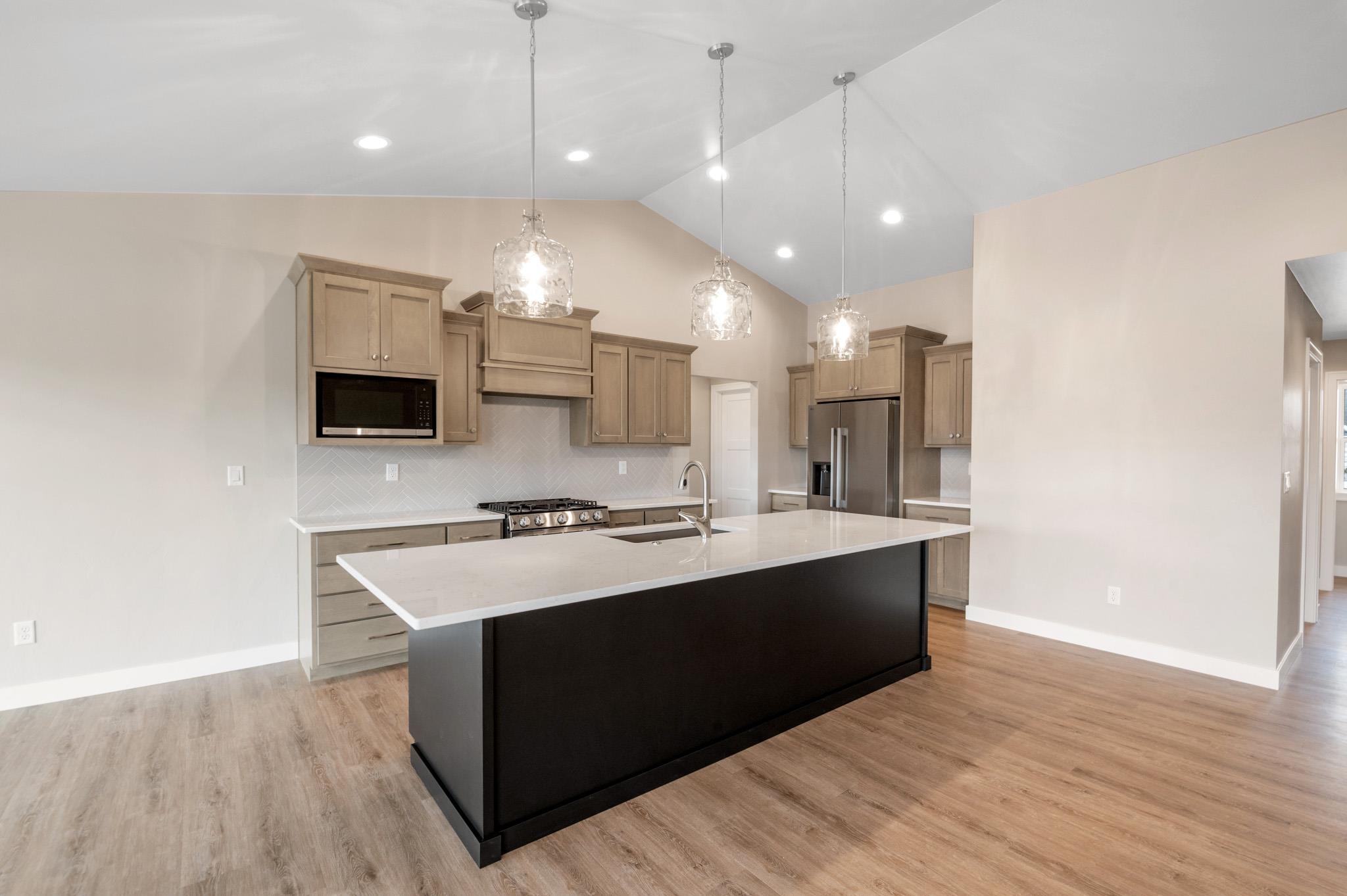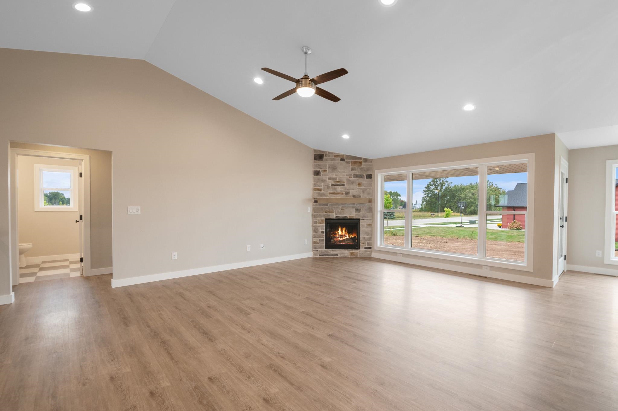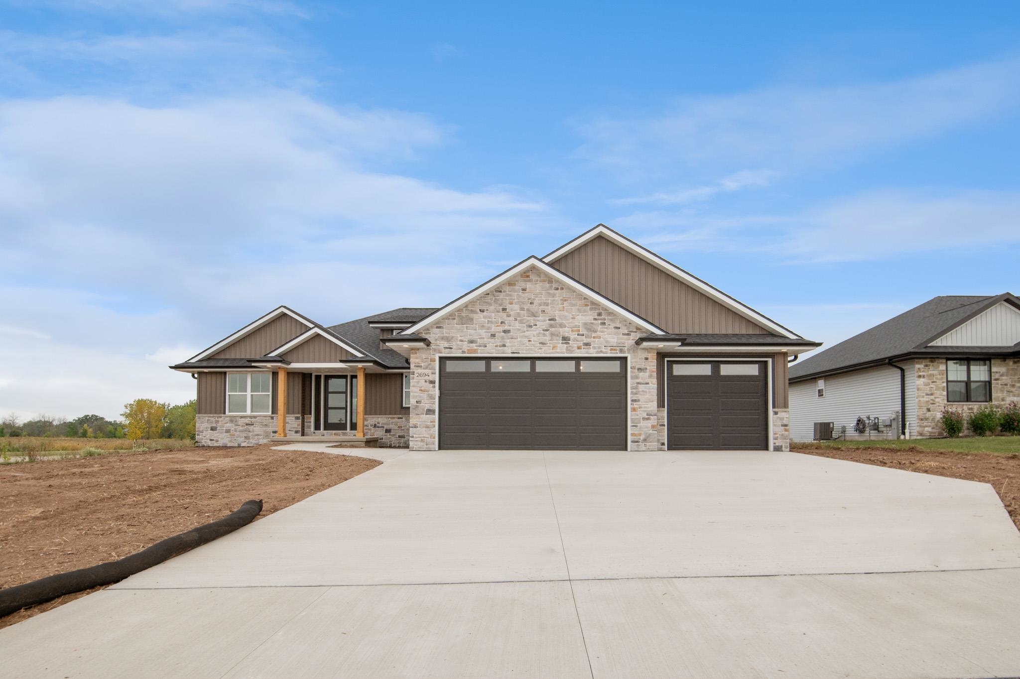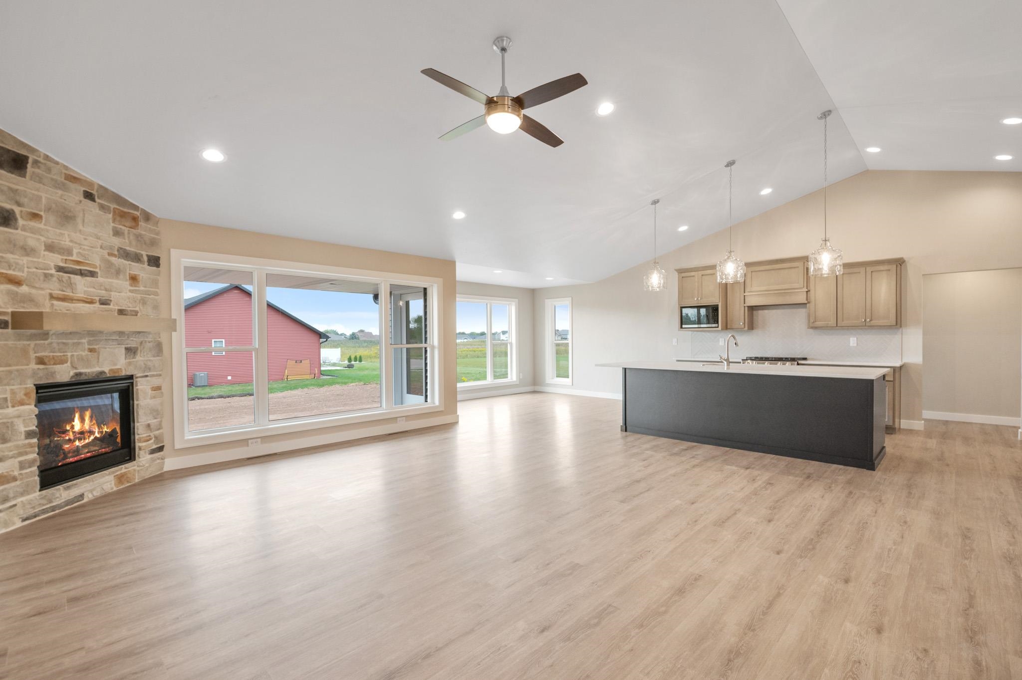 Welcome to the beautifully designed Oakdale Model! Step inside to an open concept layout filled with natural light, highlighted by large windows, a cozy gas fireplace, and a designated dining area that flows seamlessly into the living space. The spacious kitchen boasts high-end finishes including quartz countertops, a sleek tile backsplash, and a generous 6x8 walk-in pantry ideal for storage. Thoughtfully designed with a split-bedroom layout, this home includes a convenient locker system, laundry room, and a half bath with direct access to the oversized 3-stall garage. The luxurious primary suite features custom tile shower and walk-in closet. The lower level is prepped for future expansion with plumbing for a full bath and an egress window. 12x12 composite deck included!