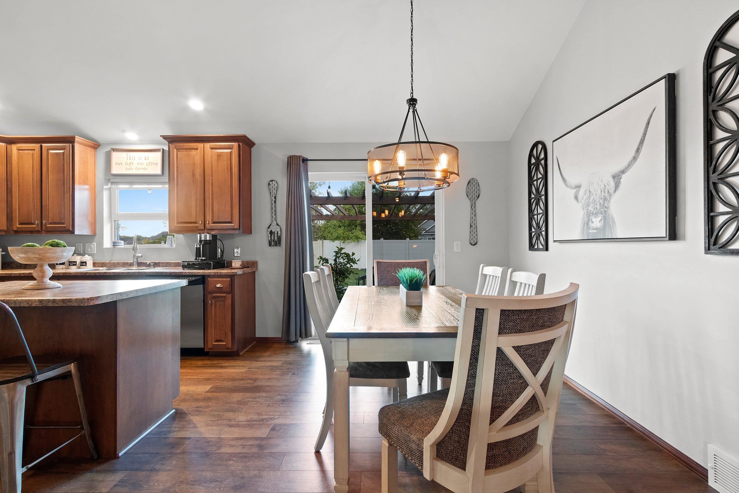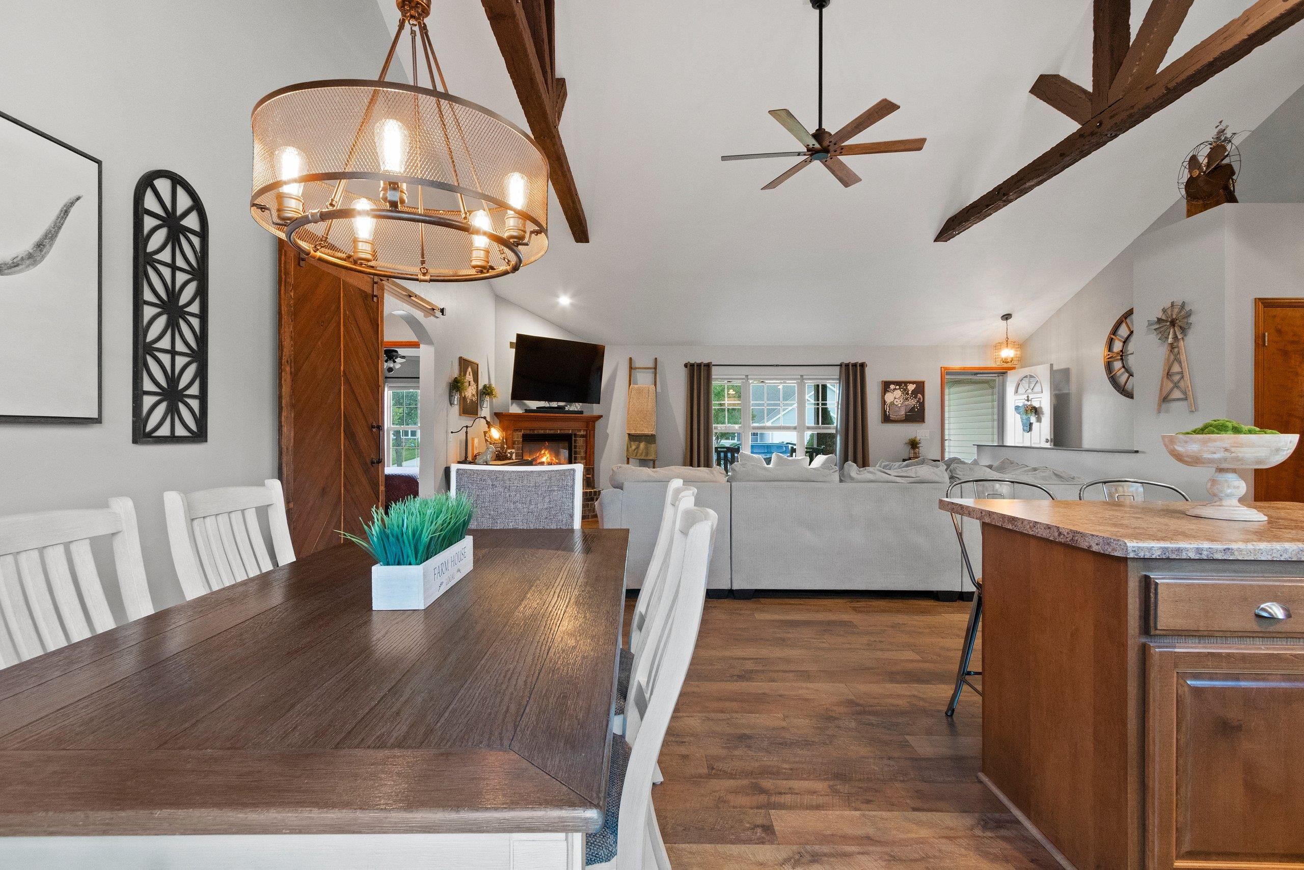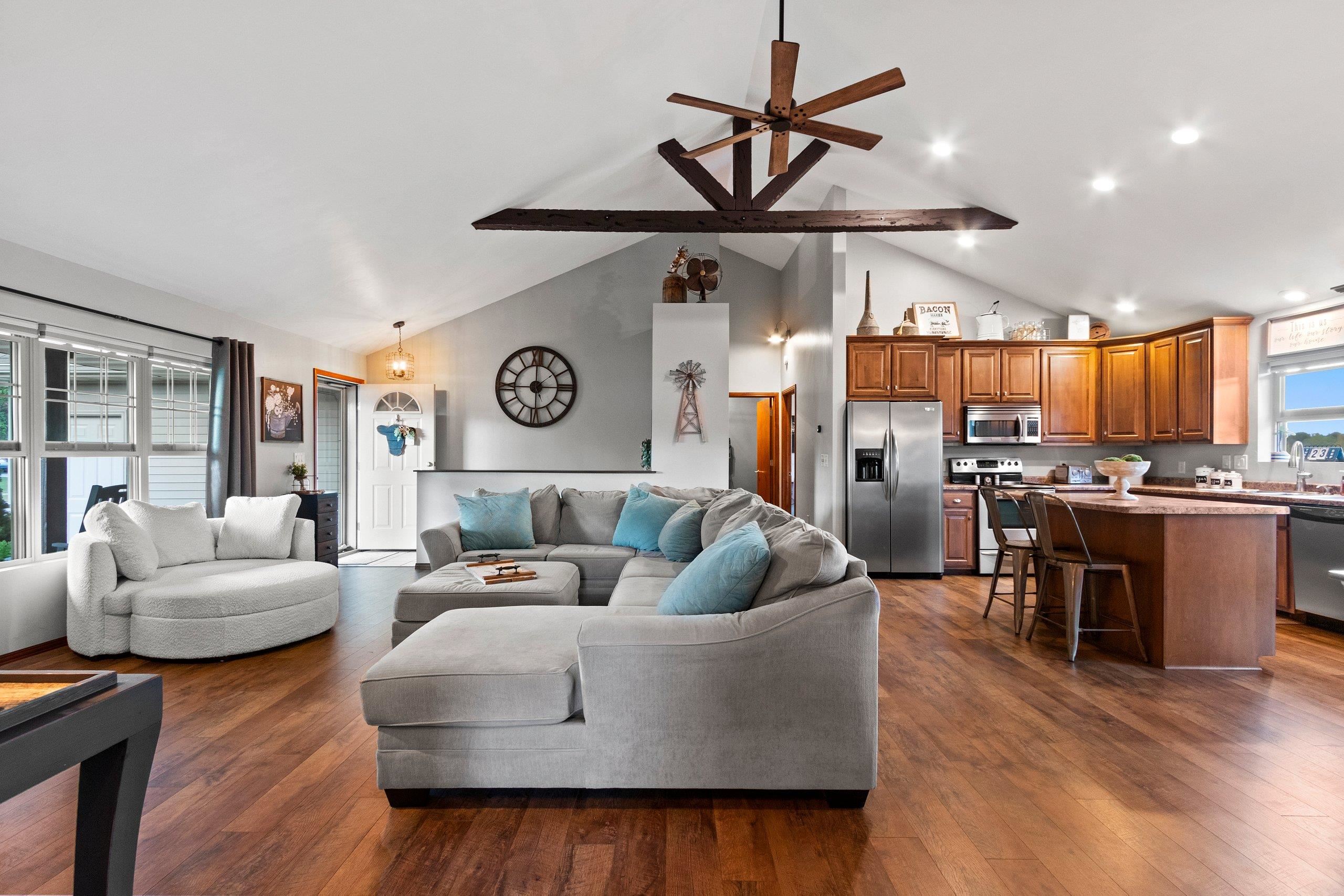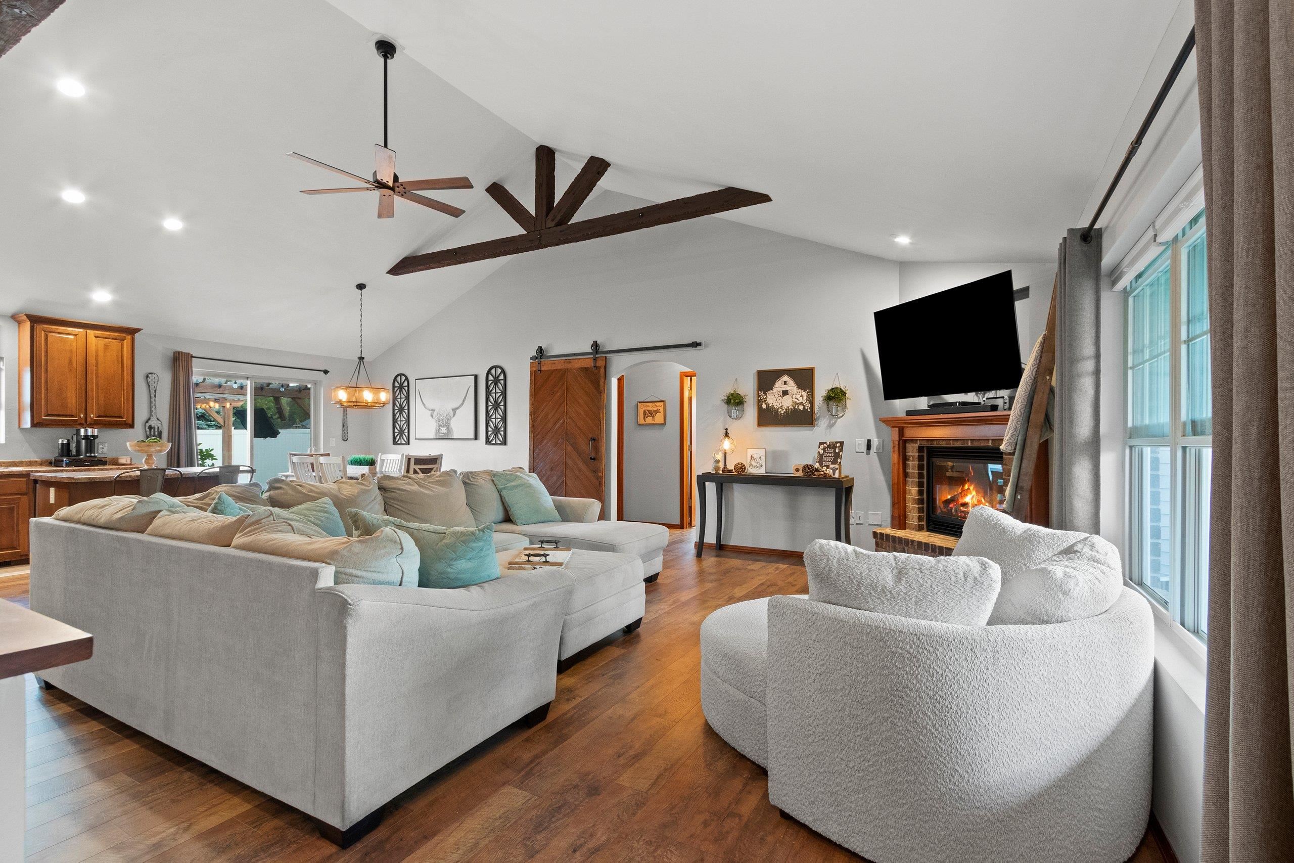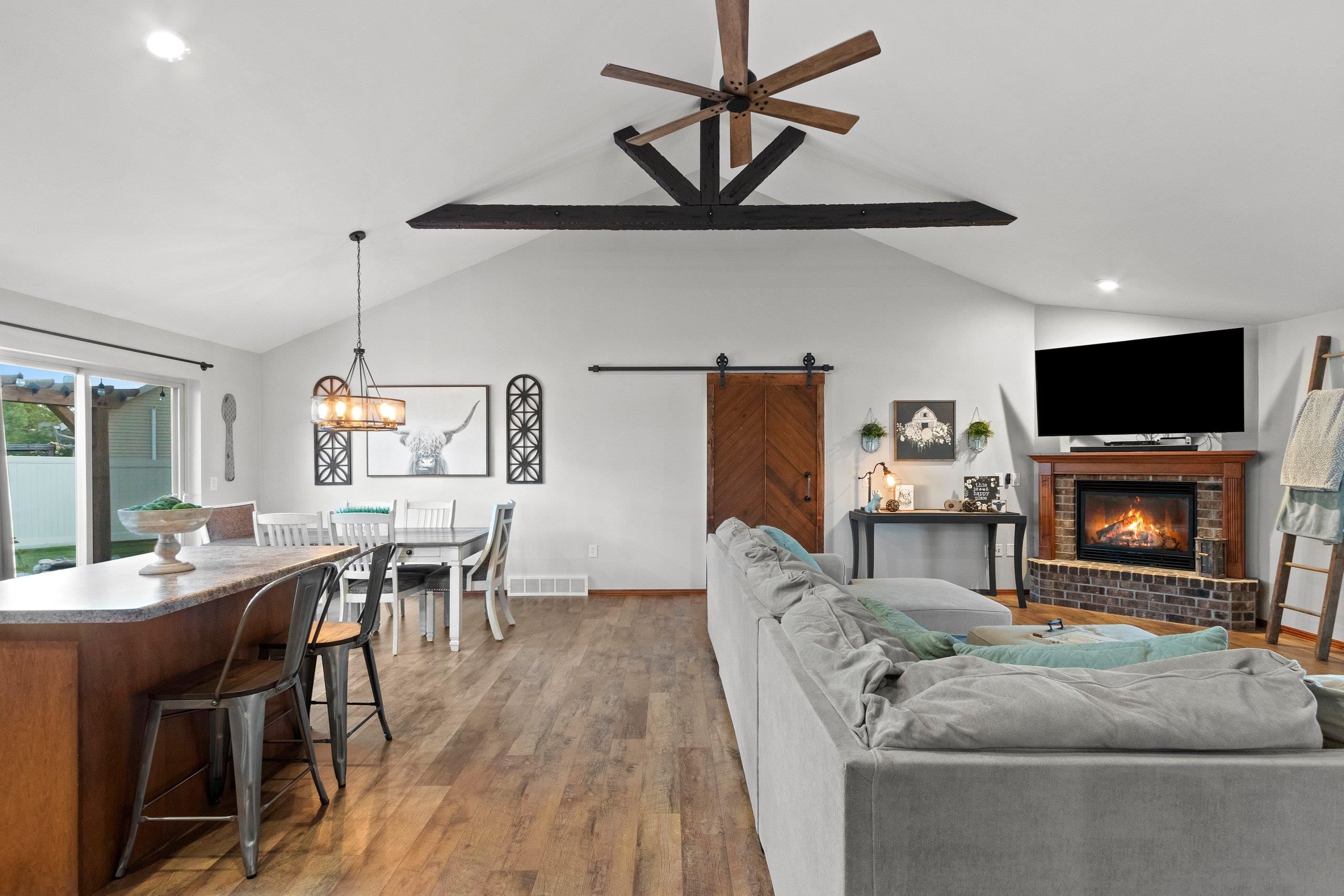Welcome to this fabulous 3-bedroom, 2-bathroom ranch home located in a desirable neighborhood! This well-designed home features a spacious split-bedroom layout, first-floor laundry, and a cozy gas fireplace. The living room showcases stunning custom wood beams and a stylish barn door. Enjoy hard-surface flooring throughout and a fully fenced backyard—perfect for privacy. The lower level offers plenty of room to expand. Recent updates include plumbing, light fixtures, flooring, and fencing. Don’t miss the opportunity to own this beautifully maintained home with modern touches and timeless charm! Showings start 9/25/25...offers to be presented on 9/28/25