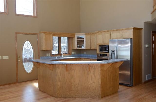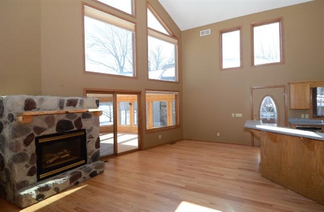 Gorgeous waterfront home! 50 ft of frontage/level lot! Floor to ceiling windows. 25 ft cathedral ceiling in great room! Open floor plan. Beautiful stone fireplace solid surface counter tops hardwood floors (newly refinished) Master bedroom suite w/ study. Lovely porch overlooks lake, pier included. Great location just minutes from downtown! close to restaurants, bike path, ski trails. Goodland Park is just a few hundred yards away! Perfect home, Perfect Price! Hurry!