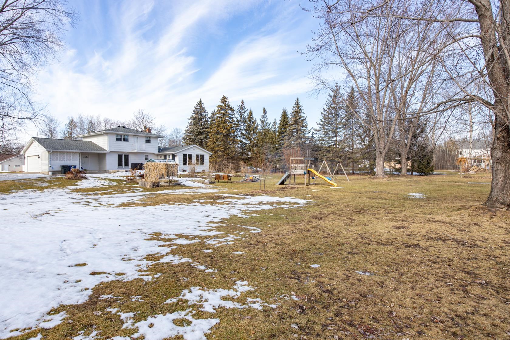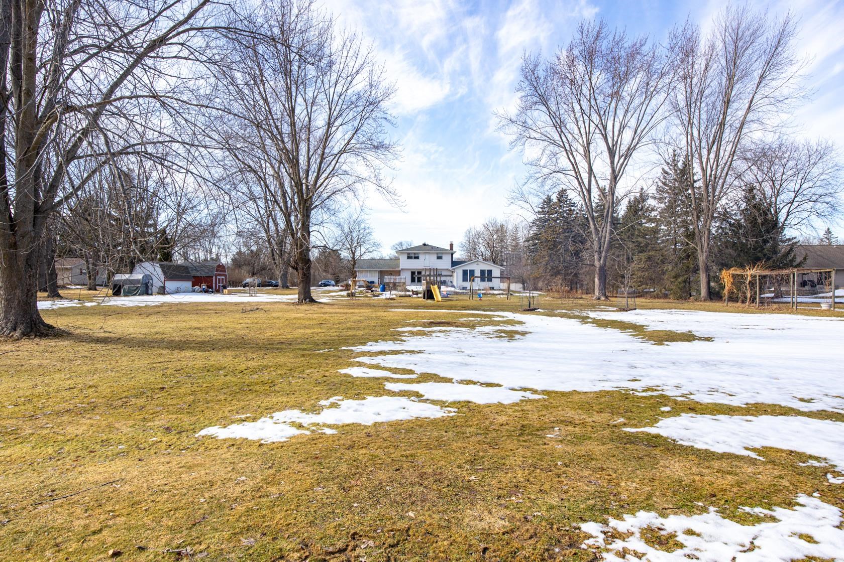 Location, Location, Location. This spacious 2-story with primary bedroom, partially finished lower level, expansive kitchen with center island on just under 2 acres is ready for you! There is a greenhouse on the property along with 2 storage sheds and a dog house. Fruit trees including, pear, plum, peach, apple; grapes too. Updates include: boiler (2025), water heater (2023). The roof, gutters, gutter guards and upstairs bath tub surround is approx. 2 years old. Some photos are virtually staged.