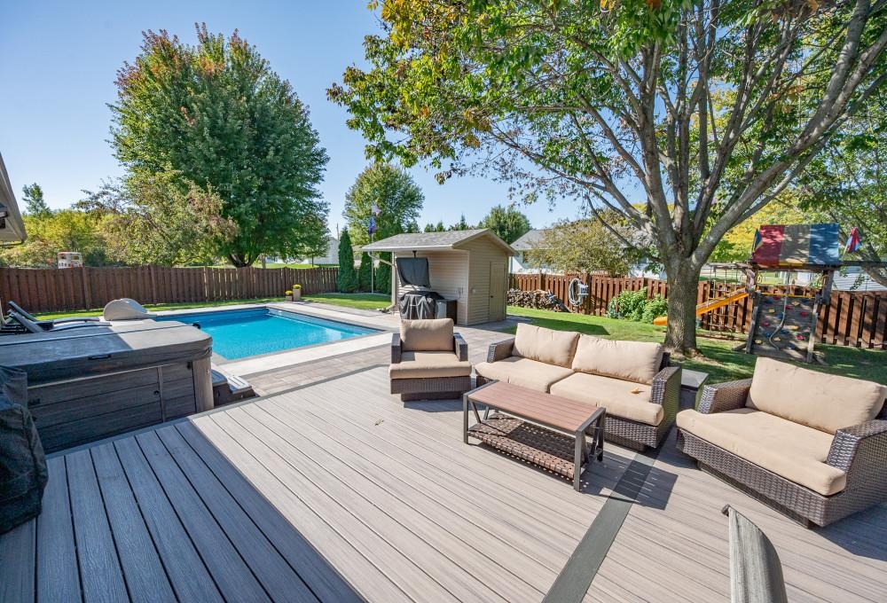 Former Showcase of home spacious 5 Bedroom, 3.5 bath ranch home in the heart of Howard. This home features over 3,300 square feet of finished living space with a split bedroom design including 3 bedrooms on the main floor and two bedrooms with egress windows in the basement. A beautiful backyard oasis, including an inground pool with auto cover, hardscape patio, pool shed, Trex Deck, and fenced in yard. Some special features include: 2 gas fireplaces, cathedral ceilings, brick front, and granite throughout. Updates galore including new garage doors, newly finished basement including a workout space and ample storage, master bathroom renovation, garage heater and roof replaced in 2013. This home is in a quiet area in the Howard-Suamico school district and within 1 mile of all of the