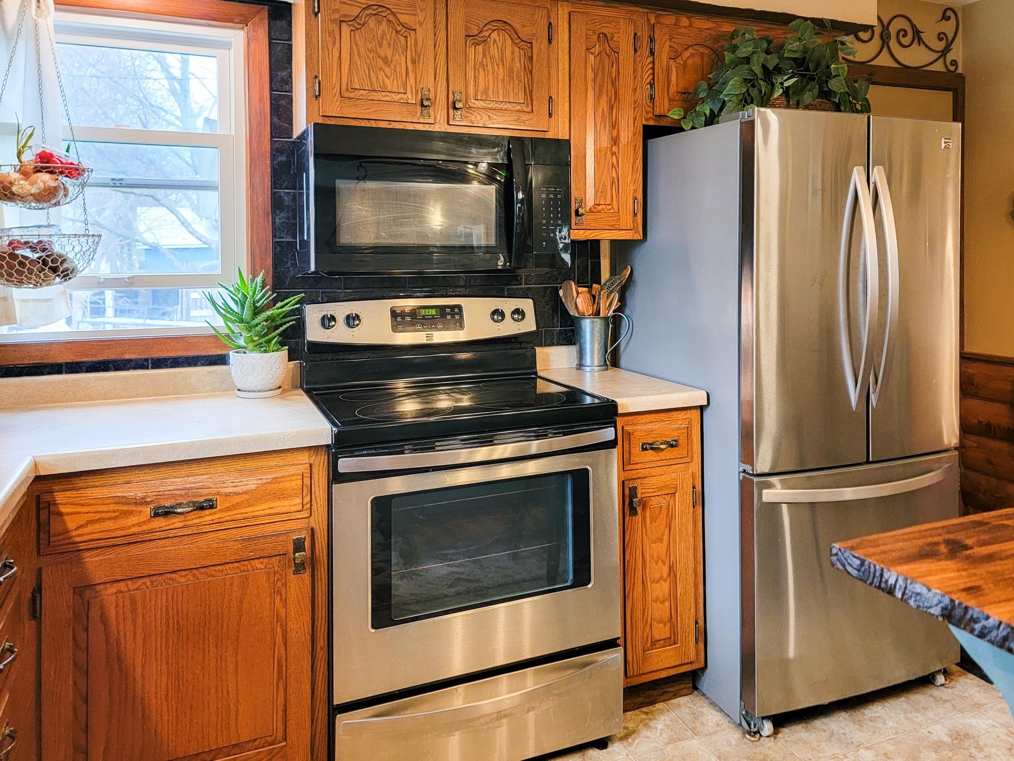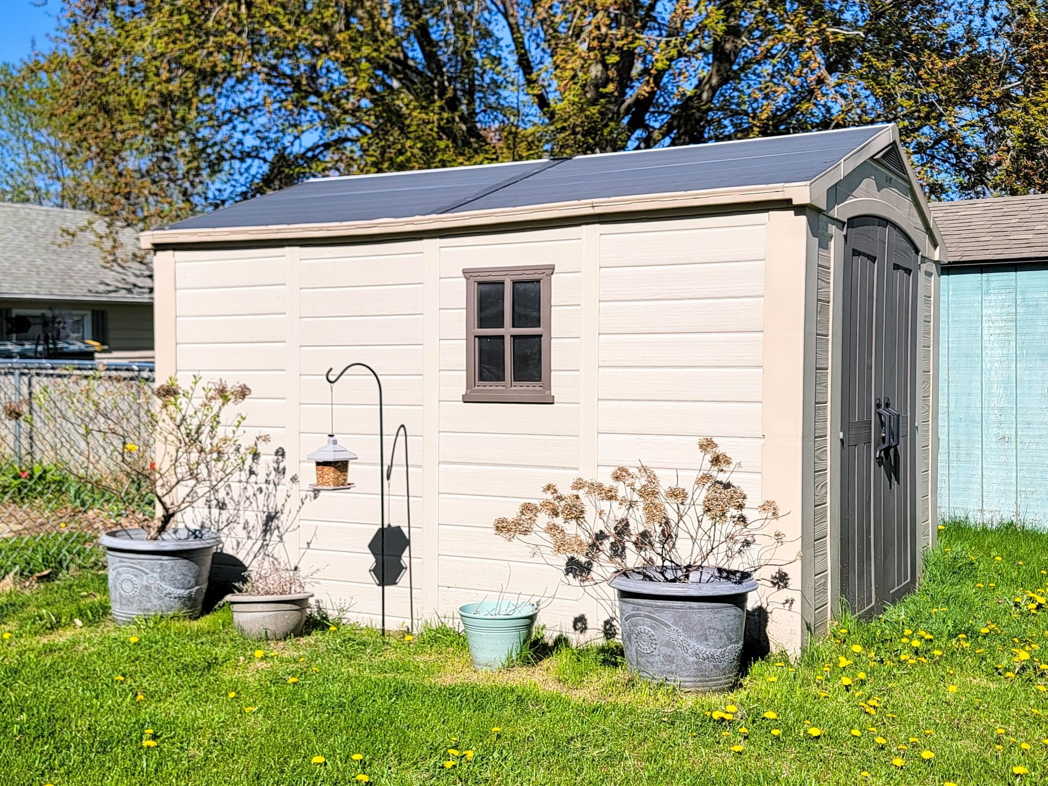 refrigerator, stove/range, microwave, washer, dryer, moveable kitchen island, smart locks/handles, storage shed