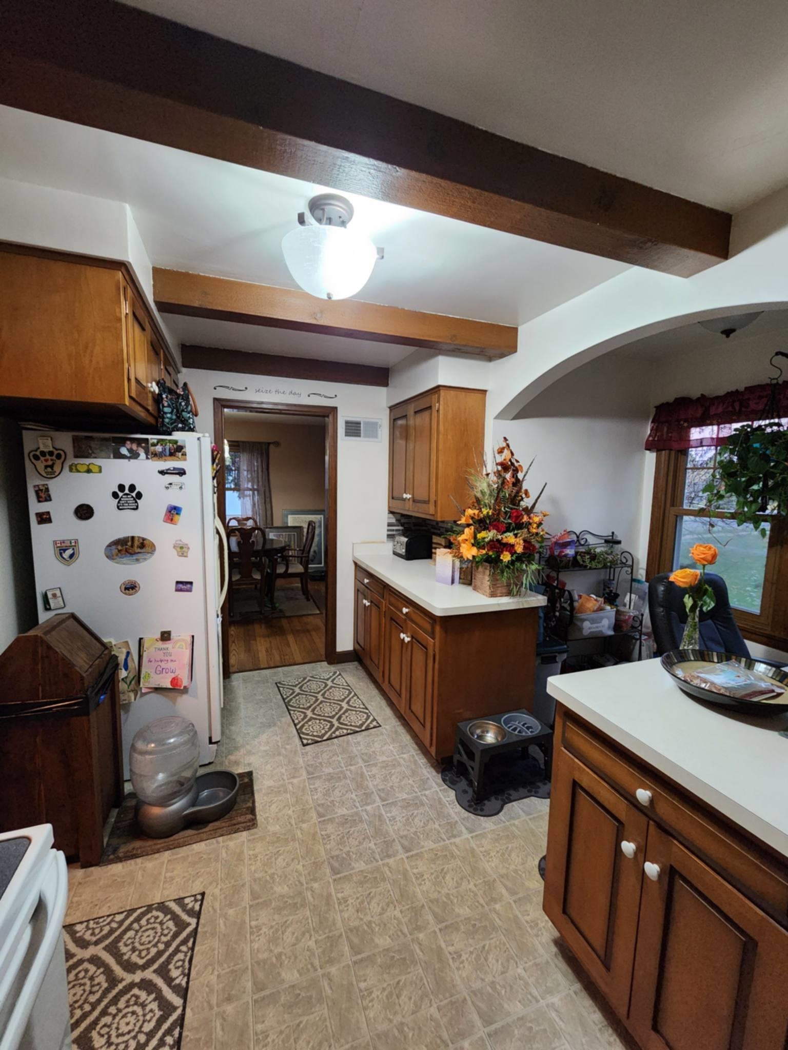 Charming 3 bedroom 1.5 bath home featuring an attached heated 3.5-car garage situated on a beautifully landscaped .525 acre level corner lot. Enjoy outdoor living with a spacious deck, patio, decorative stone flower bed filled with stunning perennials and a welcoming covered front porch. Inside, the living room offers a cozy fireplace with wood pellet insert, while the formal dining room showcases a beautiful antique light fixture. The kitchen includes a small office nook, there is original hardwood flooring throughout, a large breezeway provides additional space with access to the back deck and patio. The finished lower level expands your living space with a rec room and kitchenette. Additional highlights include updated windows, concrete driveway and garden shed with electricity.