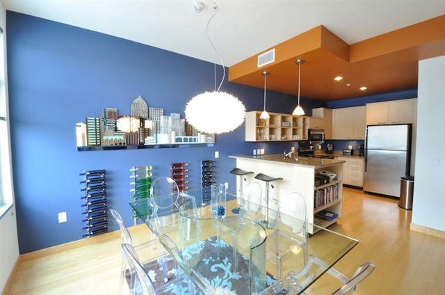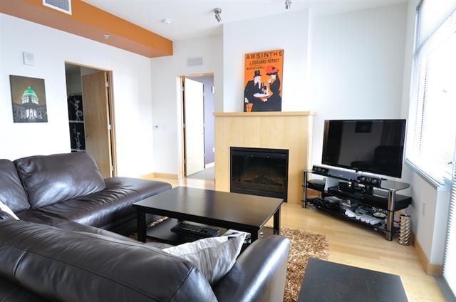 Clean modern design only 2 blocks from the Square! 5th floor end-unit condo offers appealing views & amazing natural light w/many windows. Tasteful finishes incl open layout, high ceilings, FP, lrg balcony, attractive paint colors, upgraded light fixtures & WIC w/built-ins. Kitchen features maple cabinetry, pantry, brkfst bar, quartz ctrs & SS appliances. On-floor strg incl! Bldg offers mgr, fitness & business ctrs. $25.60/mo prkg & $16.50/mo strg condo fees. Seller holds WI real estate broker license.