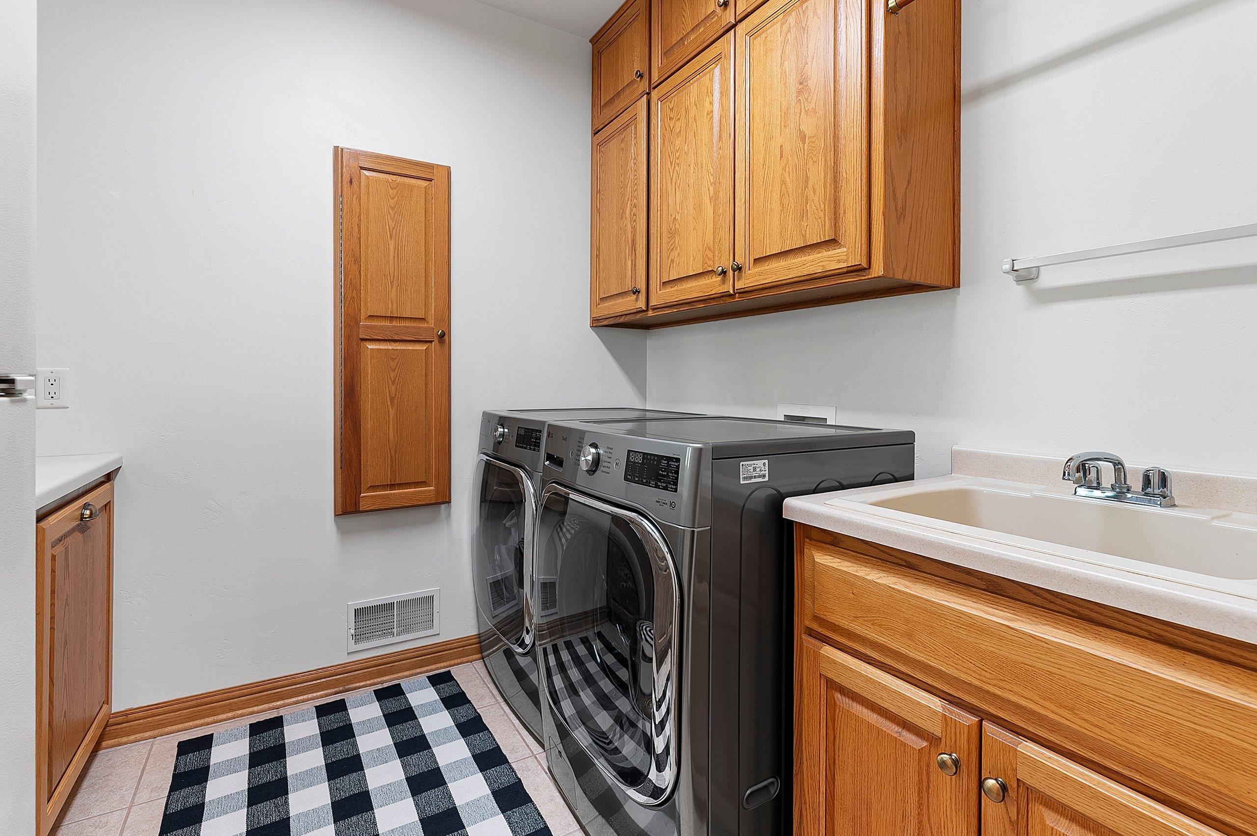 washer, dryer, green Winchester gun safe in basement, fire pit bowl, bird bath, copper bird feeder holder, sellers' personal property
