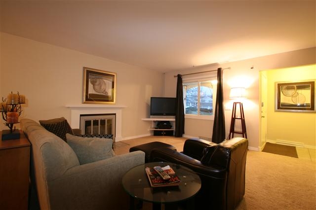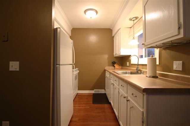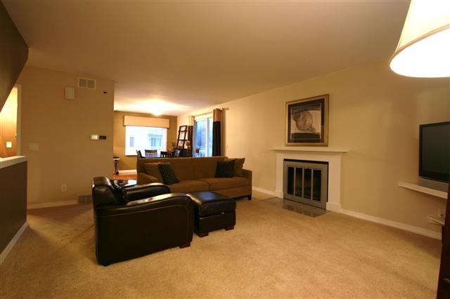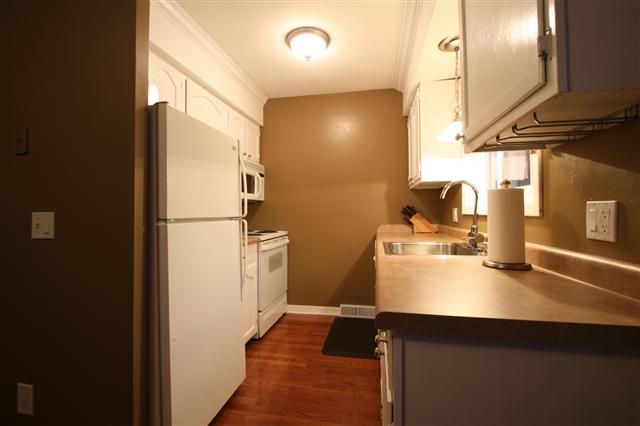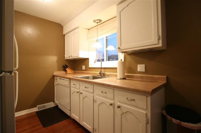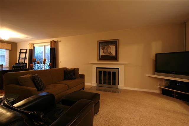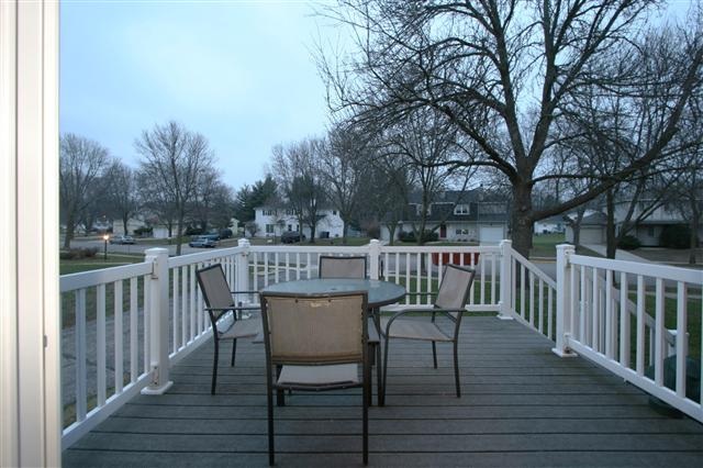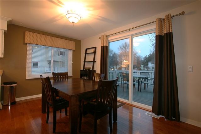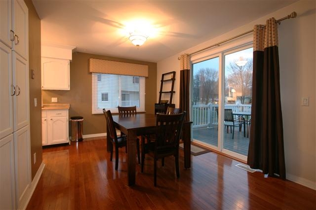 Move right in to this spacious, updated end unit near park & schools featuring gorgeous hardwood flooring in the kitchen and dining room, new patio door leading to the huge, maintenance-free deck with patio! All three bedrooms and an over-sized full bath upstairs. Cozy living room with wood-burning fireplace! Lower level laundry/storage/mud room leads to attached compact 2 car garage. Building has all new siding and roof. Unit has newer windows, newer furnace and water heater, and custom window treatments.