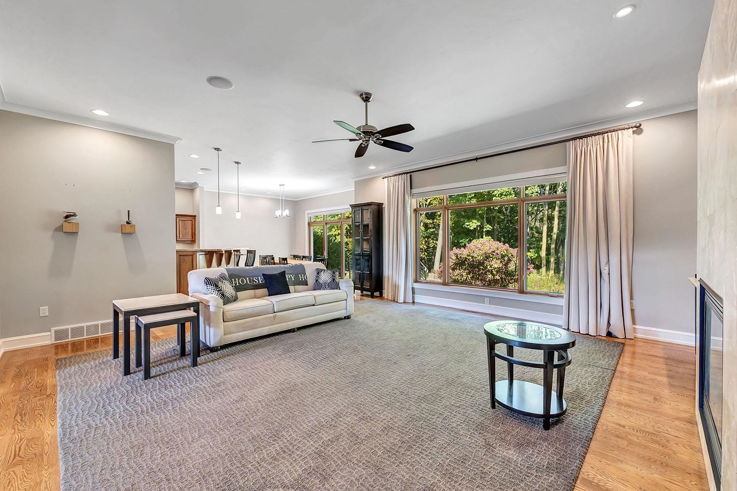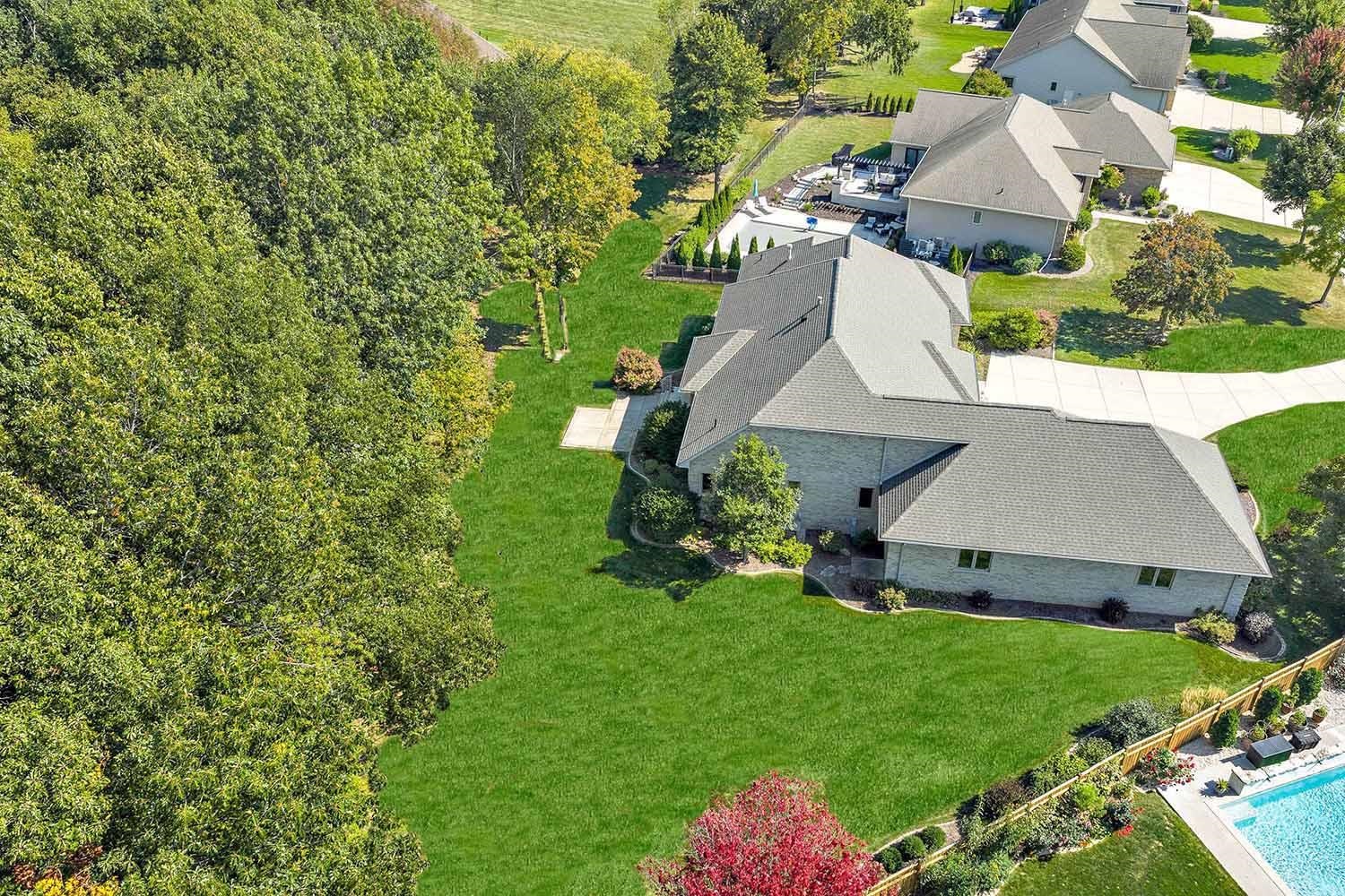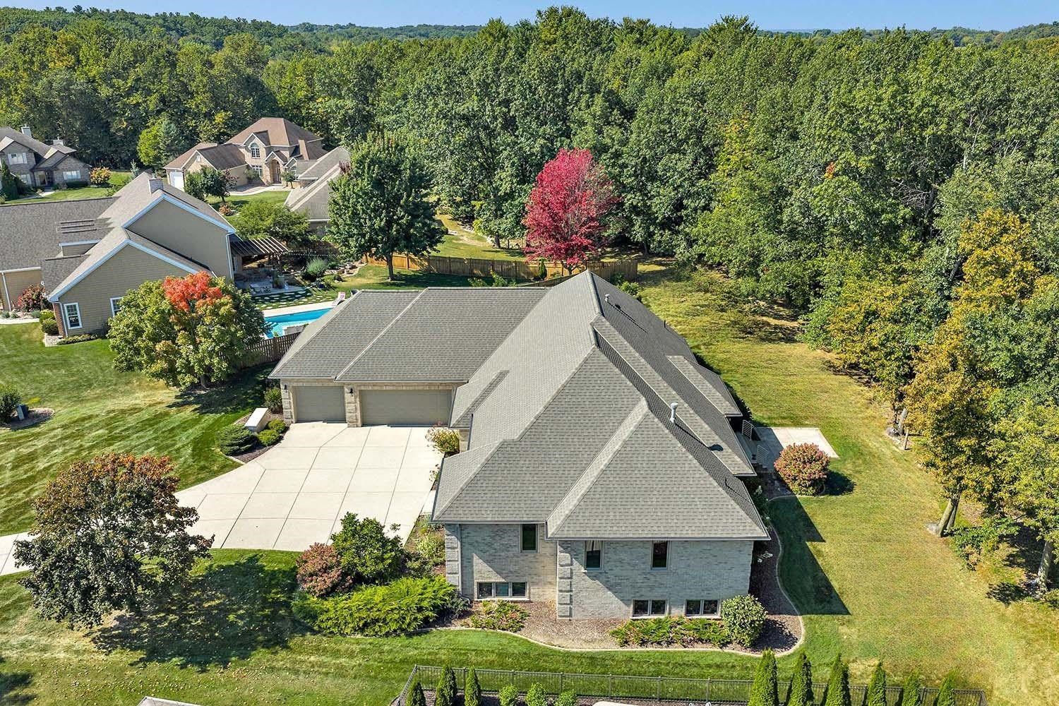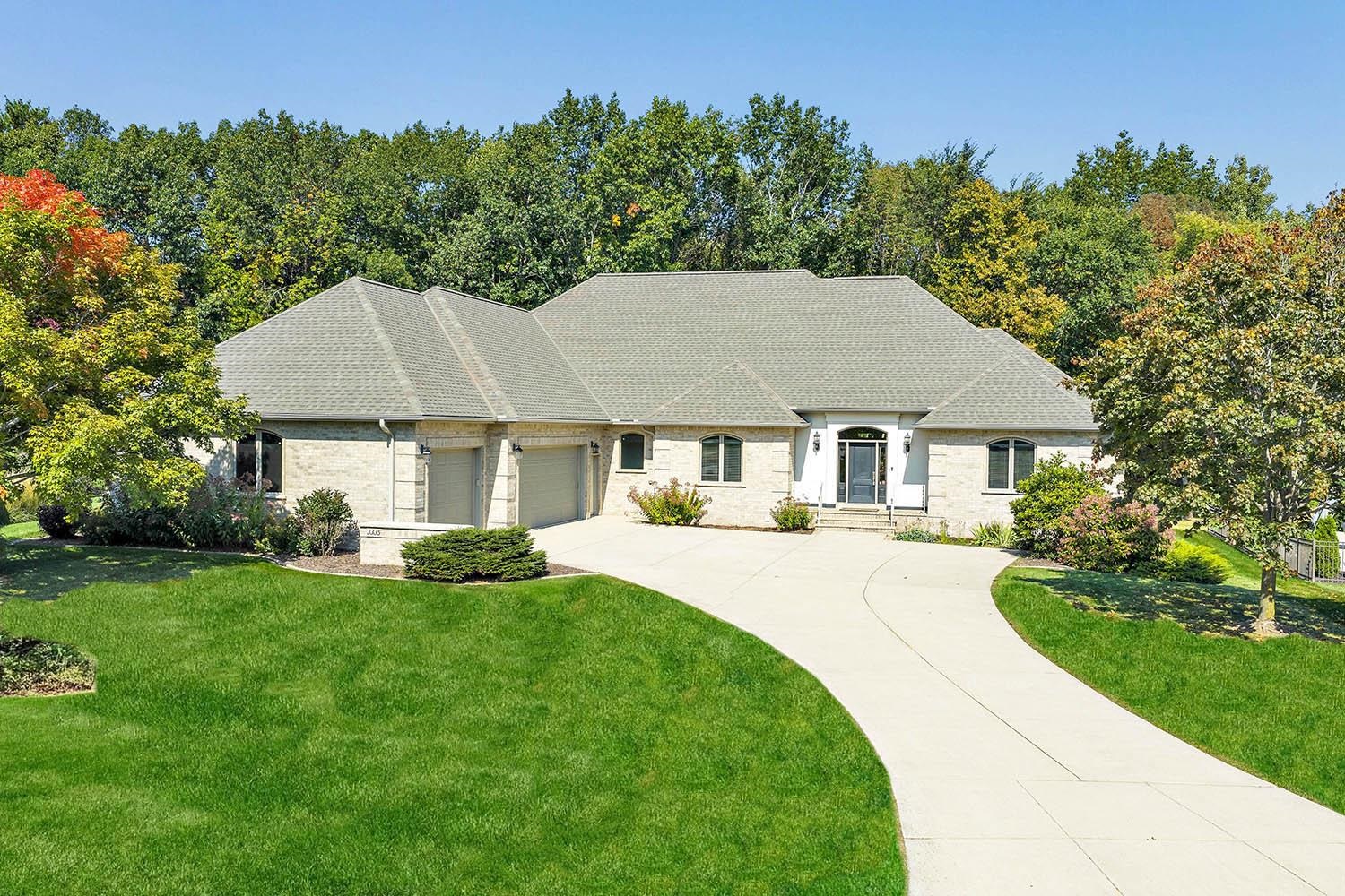 Spacious ranch nestled on a beautifully landscaped lot bordering Baird Creek. Open concept with hardwood floors, crown molding and fireplace framed by lit wall niches & expansive windows showcasing serene wooded views. Kitchen offers abundant cabinetry, granite counters, walk-in pantry and stainless-steel appliances including a Viking cooktop and dual ovens. Glass doors off dining open to a peaceful patio overlooking the wooded backdrop. Split-bedroom layout with 2 main-level bedrooms. The primary suite includes oversized closet and walk-in shower. Main floor also hosts a spacious office and laundry room. Finished lower boasts family room with daylight windows, rec area, another bedroom and bath. Expansive bright insulated garage with tall ceilings and exceptional storage capability.