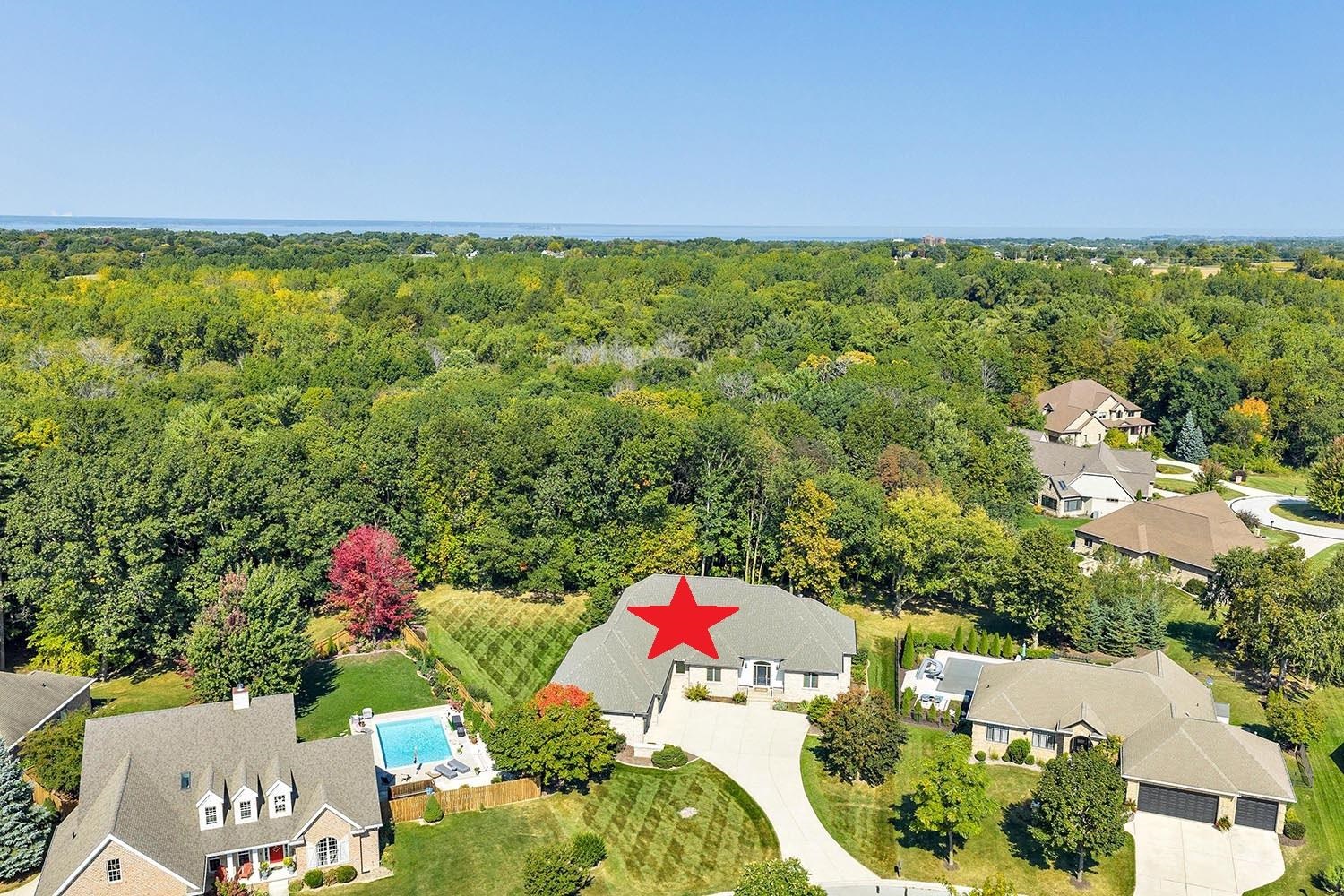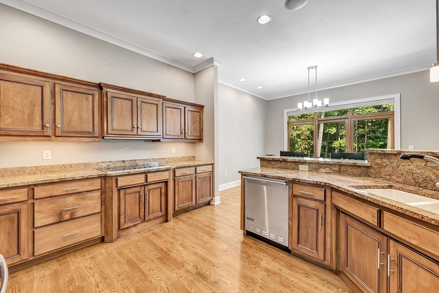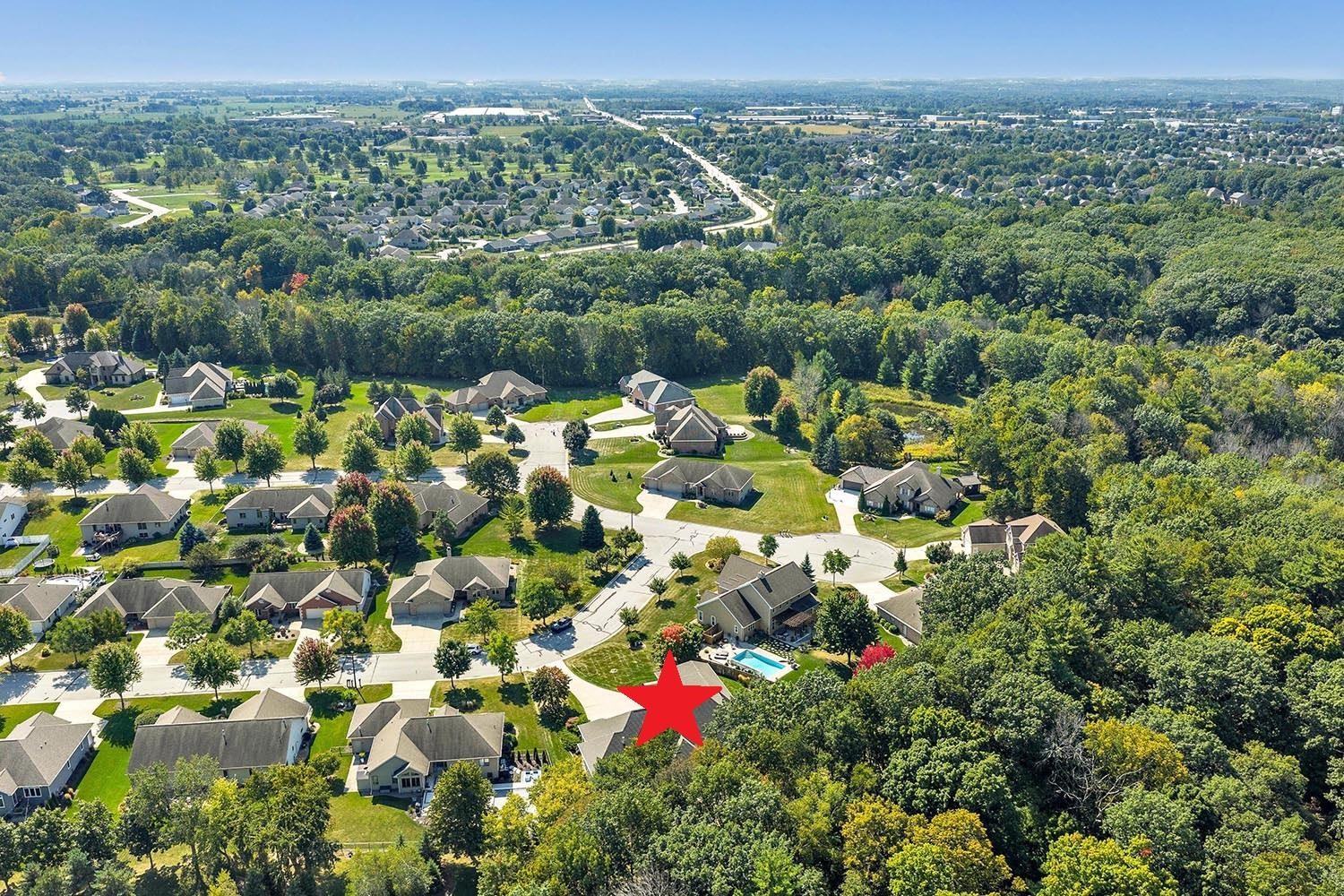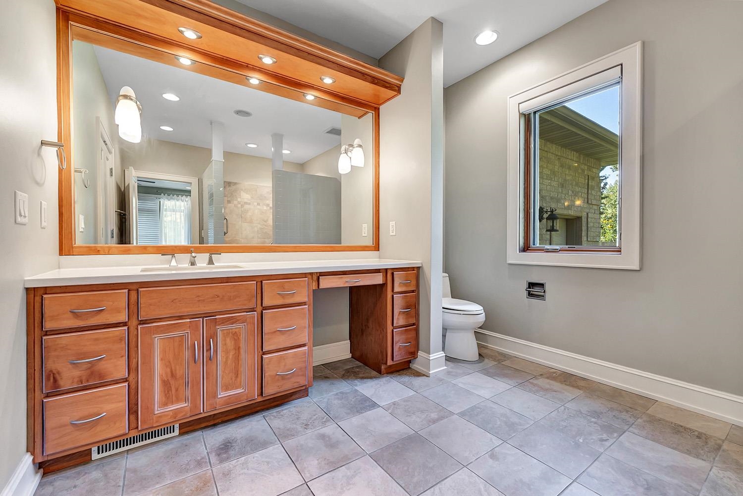 Spacious ranch nestled on a beautifully landscaped lot bordering Baird Creek. Open concept with hardwood floors, crown molding and fireplace framed by lit wall niches & expansive windows showcasing serene wooded views. Kitchen offers abundant cabinetry, granite counters, walk-in pantry and stainless-steel appliances including a Viking cooktop and dual ovens. Glass doors off dining open to a peaceful patio overlooking the wooded backdrop. Split-bedroom layout with 2 main-level bedrooms. The primary suite includes oversized closet and walk-in shower. Main floor also hosts a spacious office and laundry room. Finished lower boasts family room with daylight windows, rec area, another bedroom and bath. Expansive bright insulated garage with tall ceilings and exceptional storage capability.