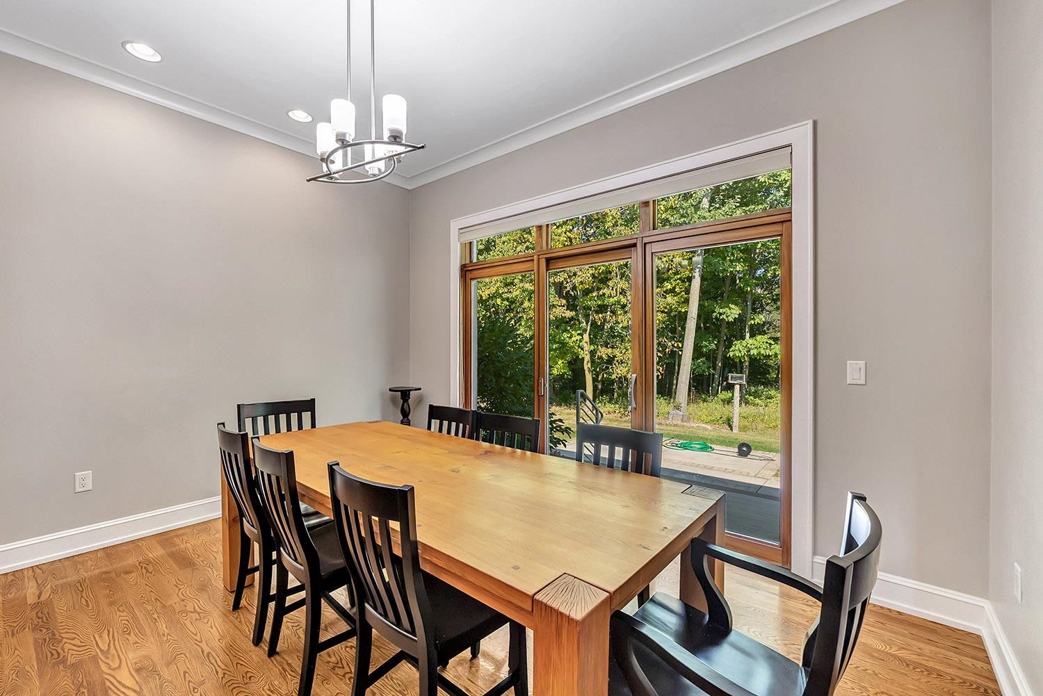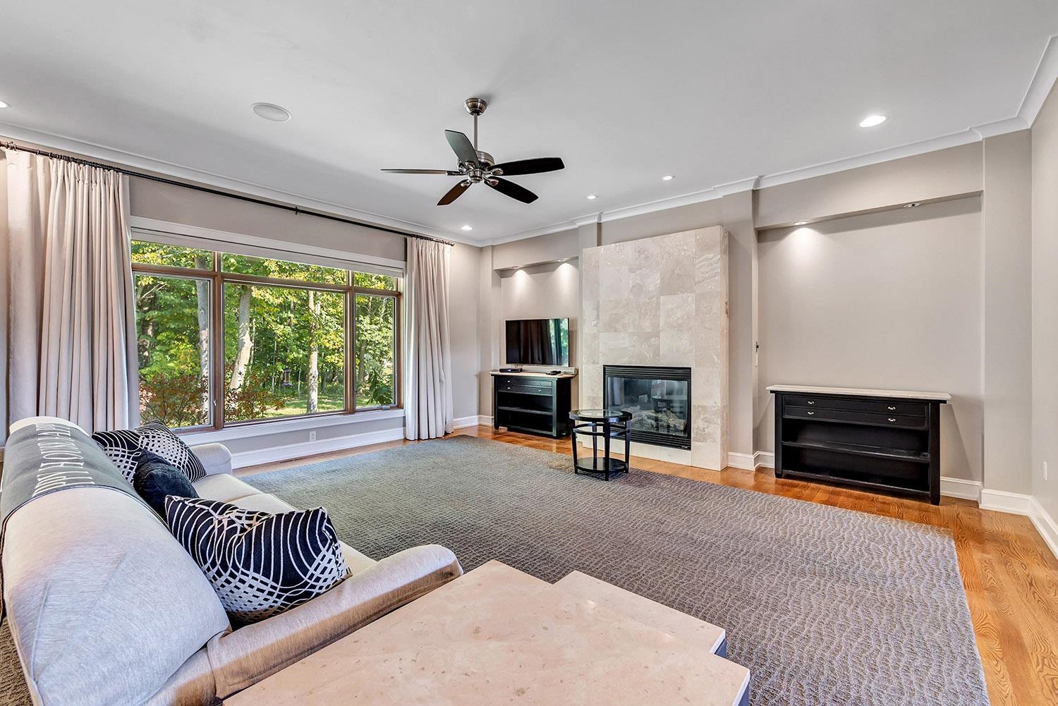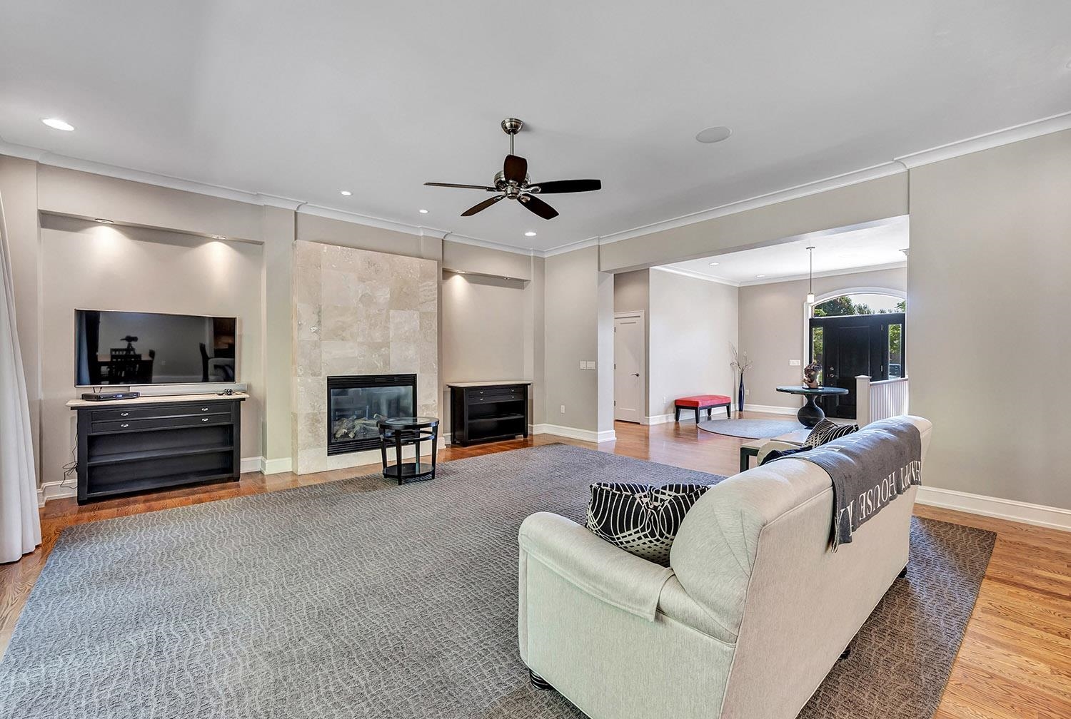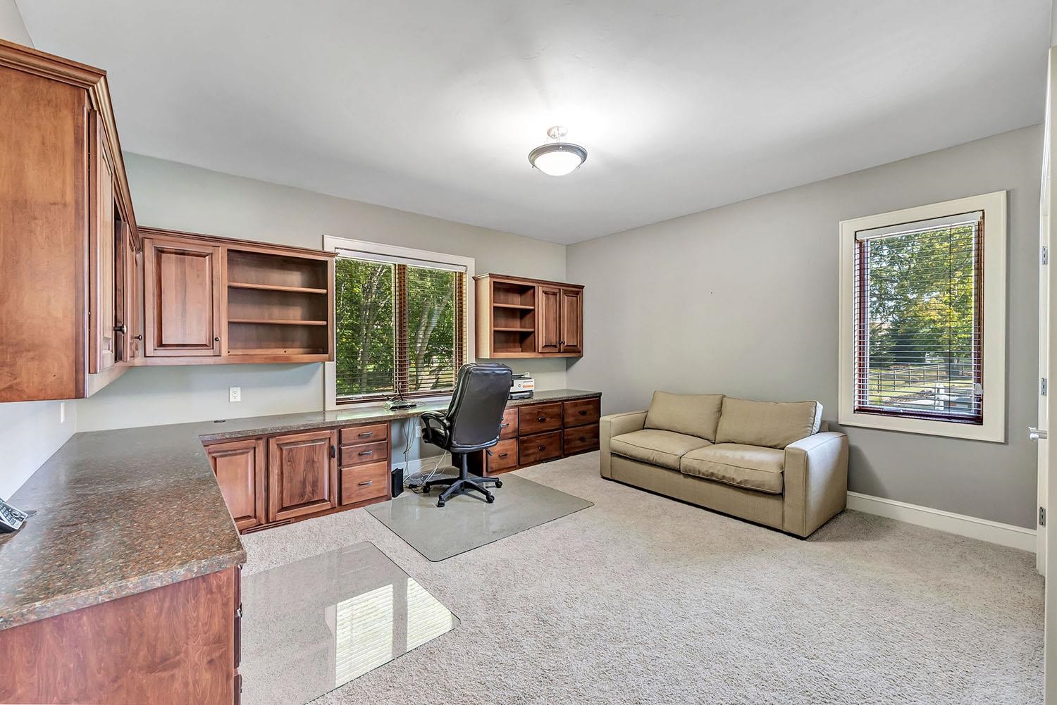 Spacious ranch nestled on a beautifully landscaped lot bordering Baird Creek. Open concept with hardwood floors, crown molding and fireplace framed by lit wall niches & expansive windows showcasing serene wooded views. Kitchen offers abundant cabinetry, granite counters, walk-in pantry and stainless-steel appliances including a Viking cooktop and dual ovens. Glass doors off dining open to a peaceful patio overlooking the wooded backdrop. Split-bedroom layout with 2 main-level bedrooms. The primary suite includes oversized closet and walk-in shower. Main floor also hosts a spacious office and laundry room. Finished lower boasts family room with daylight windows, rec area, another bedroom and bath. Expansive bright insulated garage with tall ceilings and exceptional storage capability.