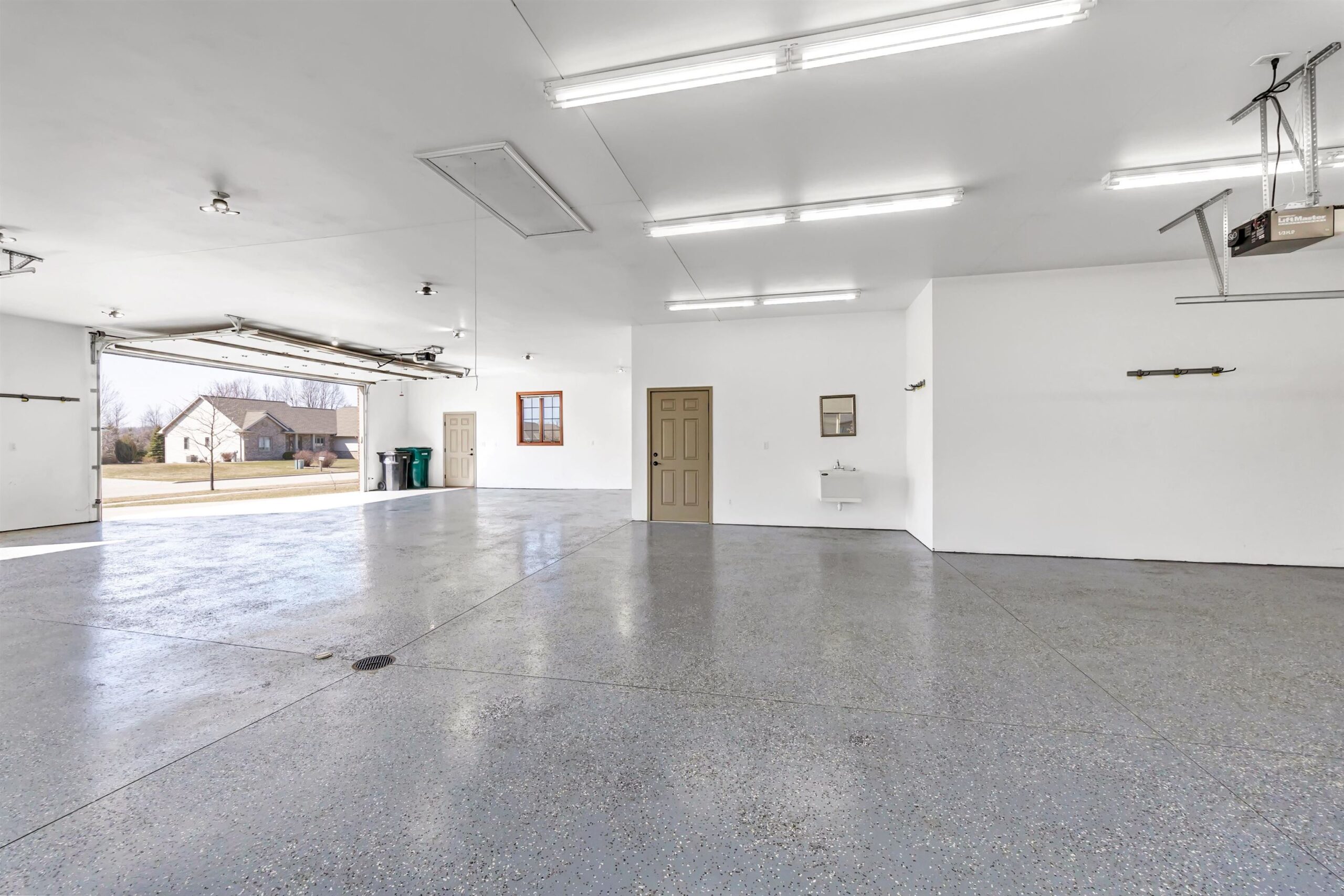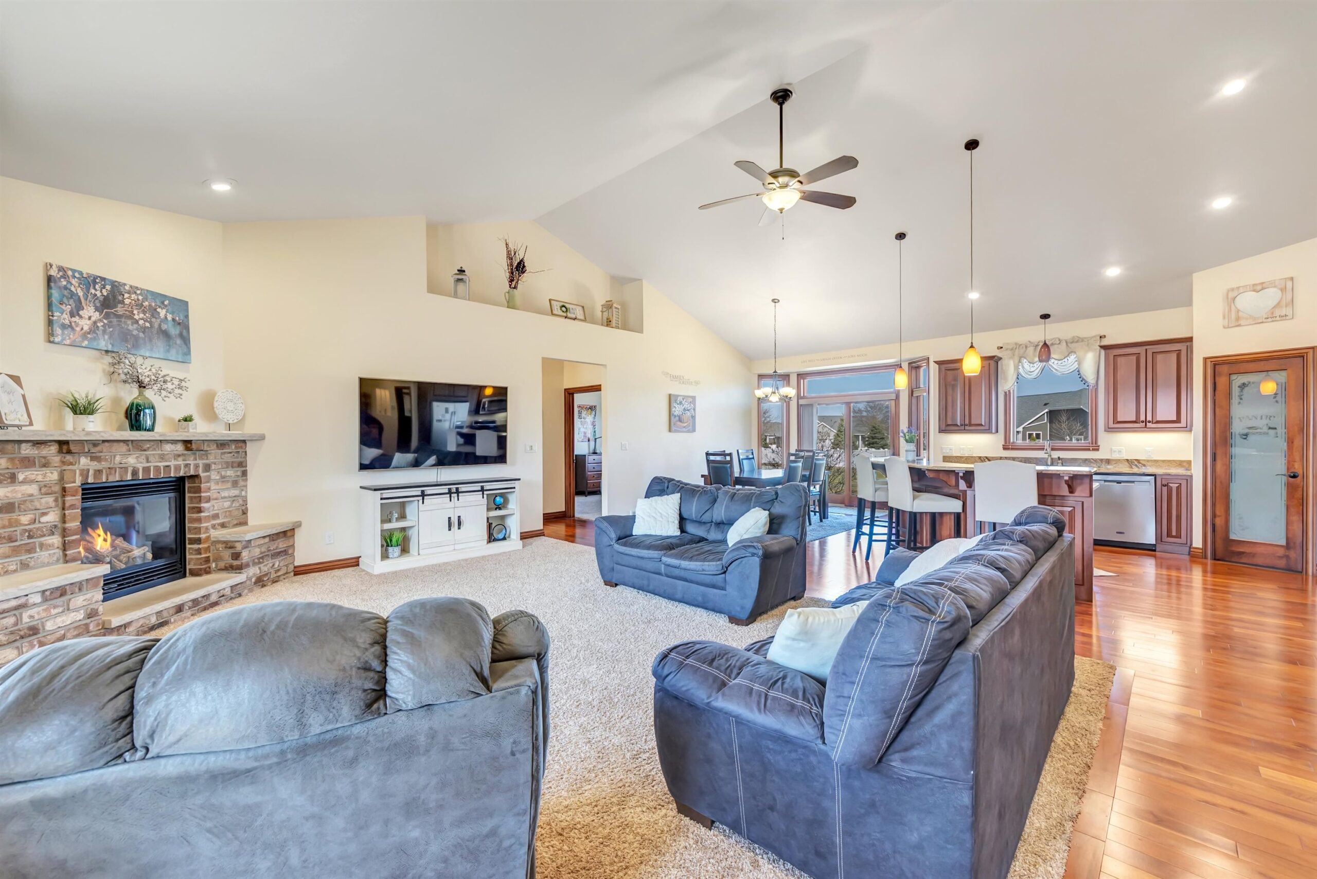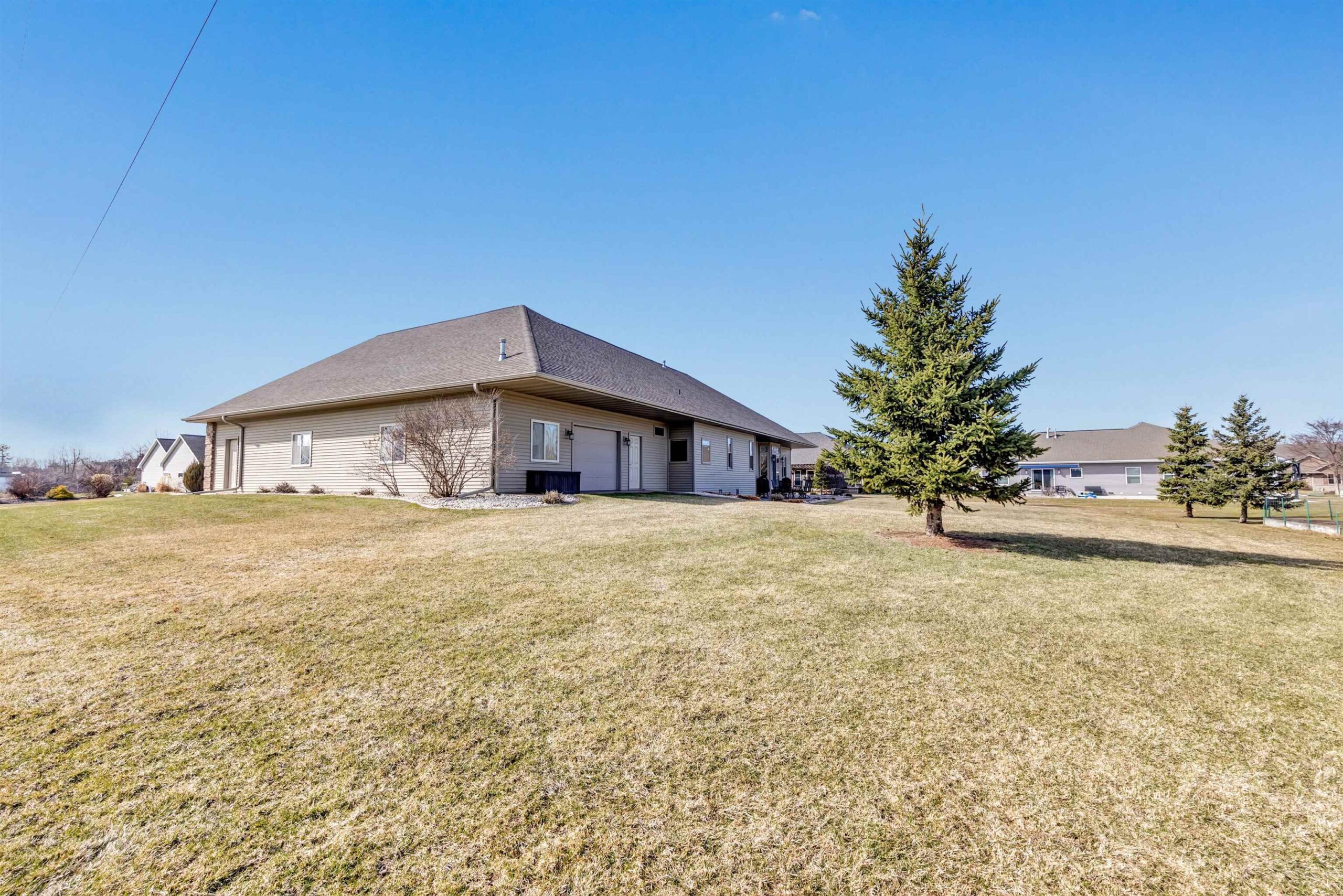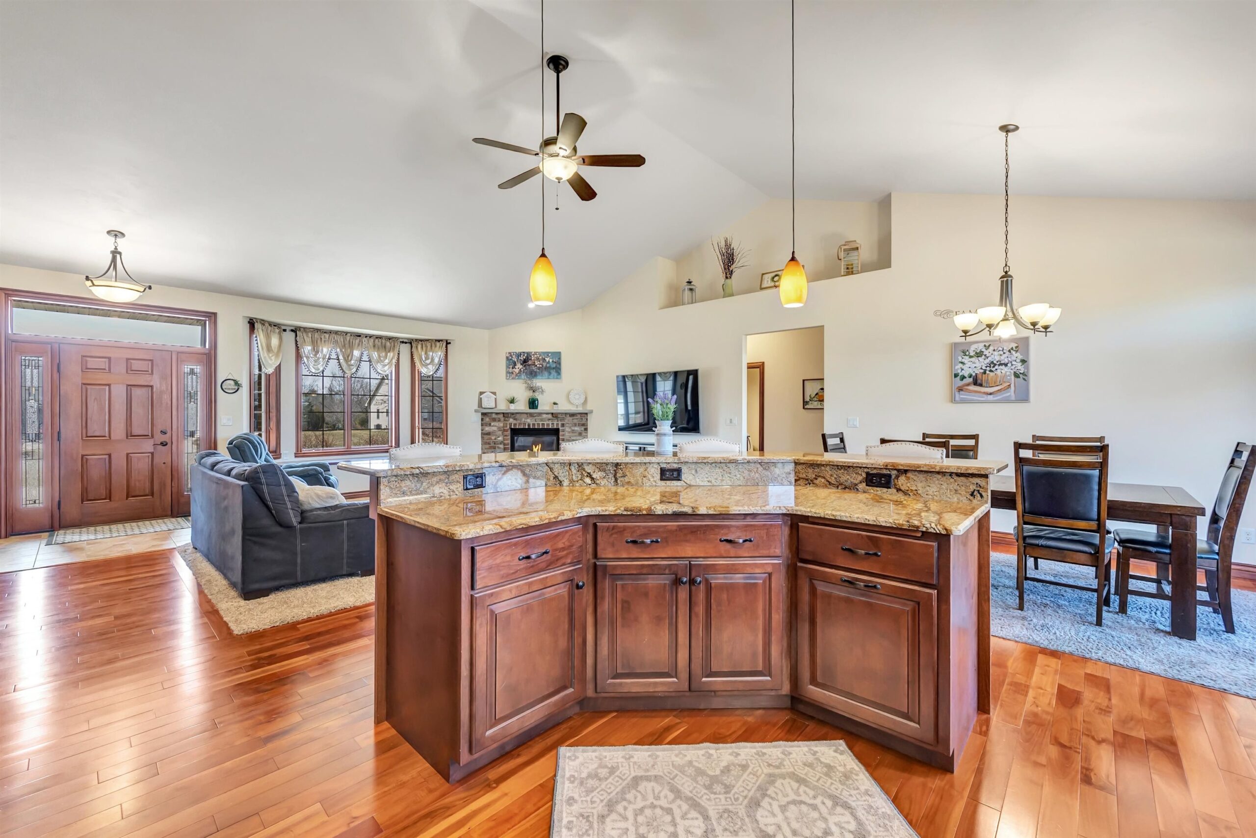 Welcome to this custom-built, one-owner Howard home on a quiet cul-de-sac. Zero-step entry from the front and garage doors welcome you into this 4 bed, 3.5 bath open-concept home with cathedral ceilings, granite throughout main level and rich hardwood floors. The kitchen offers ample storage, a walk in pantry and a large tiered island flowing to the dining room and living room with gas fireplace. The primary suite features split vanities, jetted tub, large tile shower and a spacious L shaped walk-in closet. Convenient first-floor laundry with locker system. Finished lower level includes a bedroom, full bath, wet bar and egress windows. Don't miss the impressive 2,088 sq ft heated, finished garage with epoxy floors, floor drains, 240v outlets, 9' tall garage doors, and attic storage!