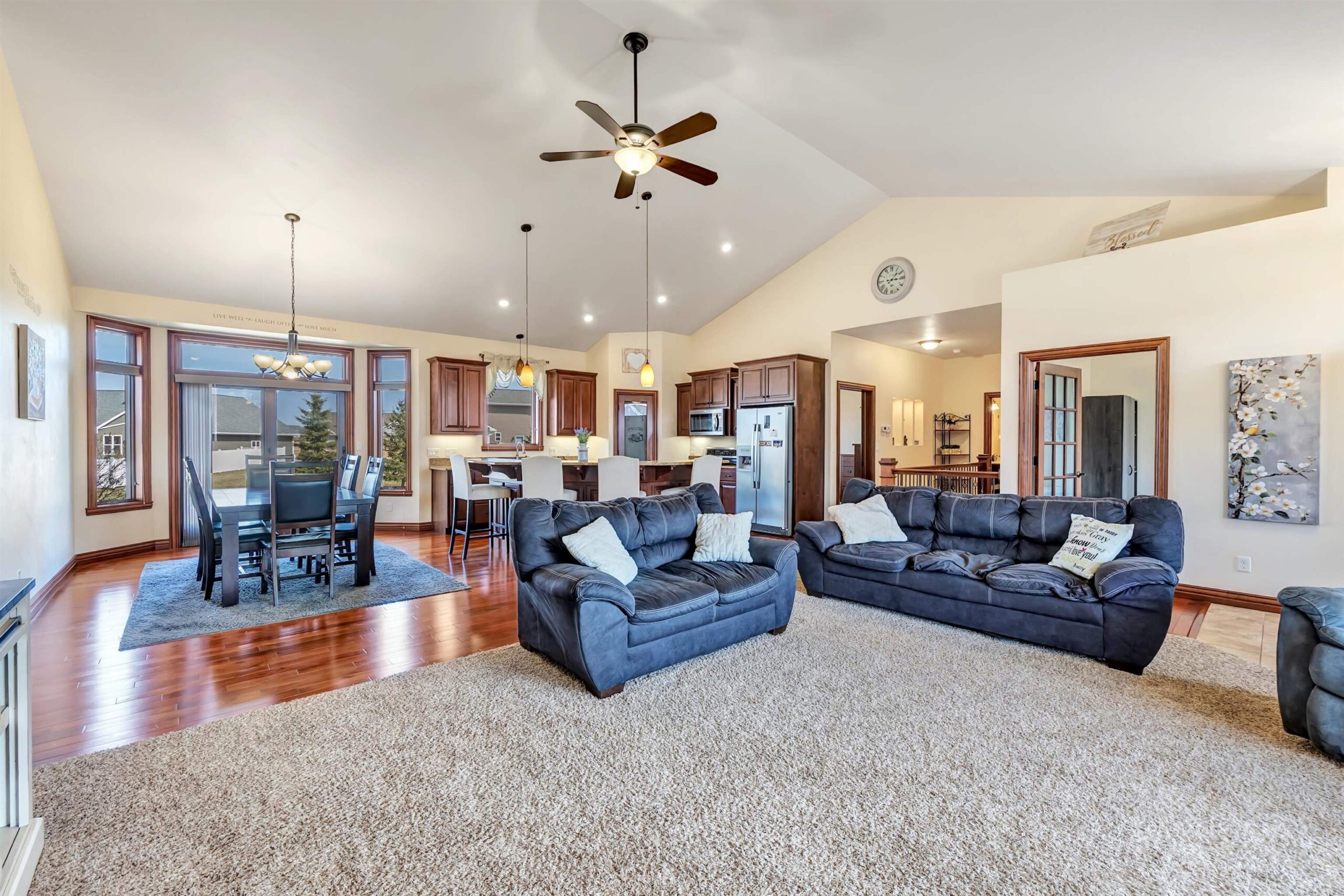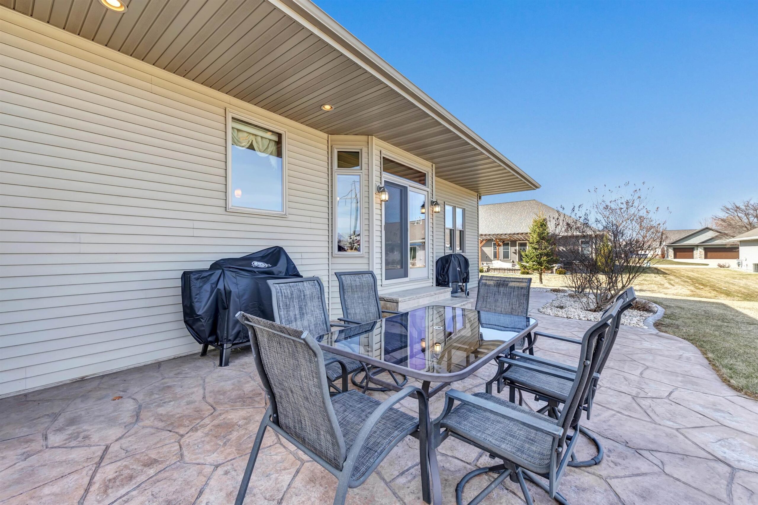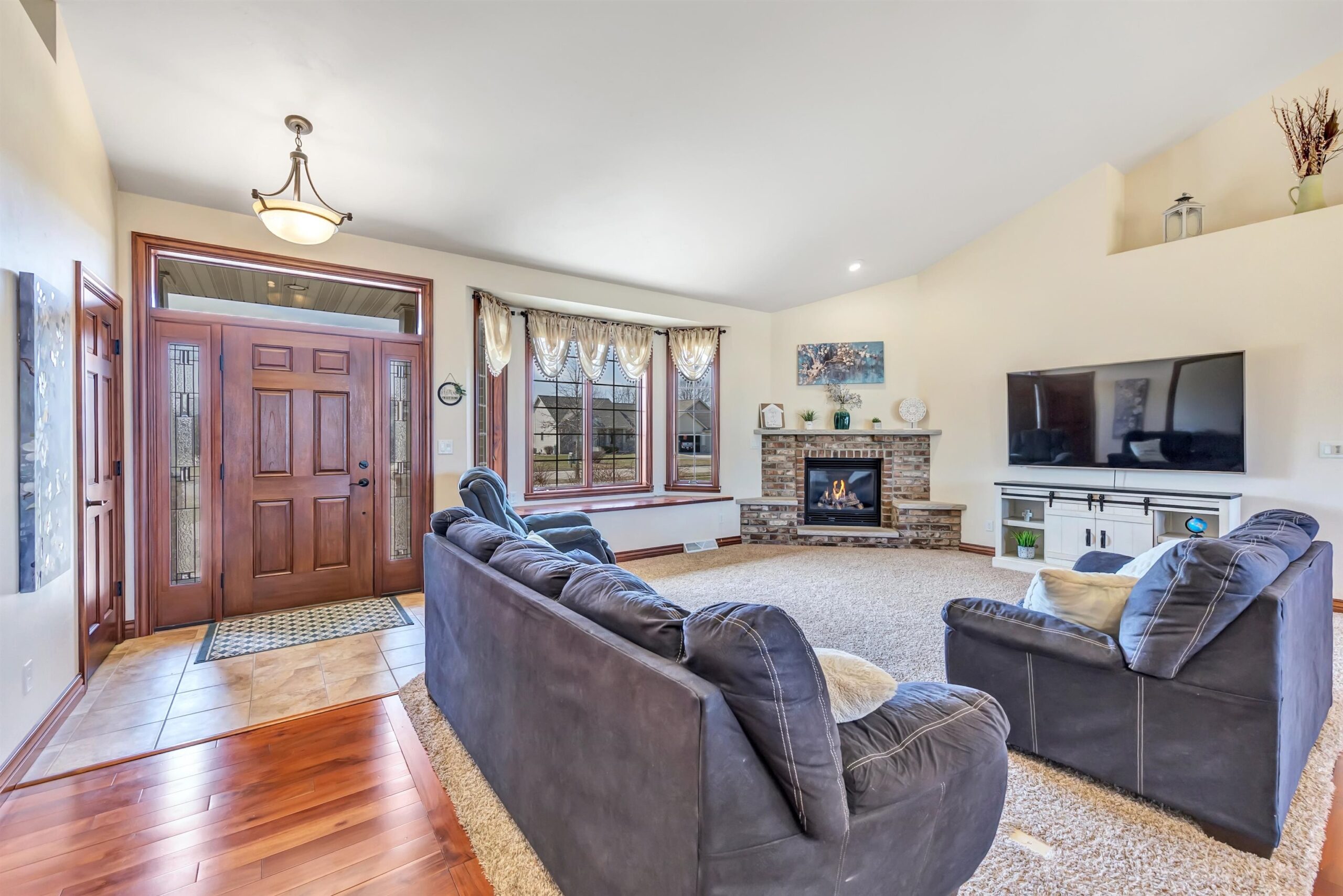 Welcome to this custom-built, one-owner Howard home on a quiet cul-de-sac. Zero-step entry from the front and garage doors welcome you into this 4 bed, 3.5 bath open-concept home with cathedral ceilings, granite throughout main level and rich hardwood floors. The kitchen offers ample storage, a walk in pantry and a large tiered island flowing to the dining room and living room with gas fireplace. The primary suite features split vanities, jetted tub, large tile shower and a spacious L shaped walk-in closet. Convenient first-floor laundry with locker system. Finished lower level includes a bedroom, full bath, wet bar and egress windows. Don't miss the impressive 2,088 sq ft heated, finished garage with epoxy floors, floor drains, 240v outlets, 9' tall garage doors, and attic storage!