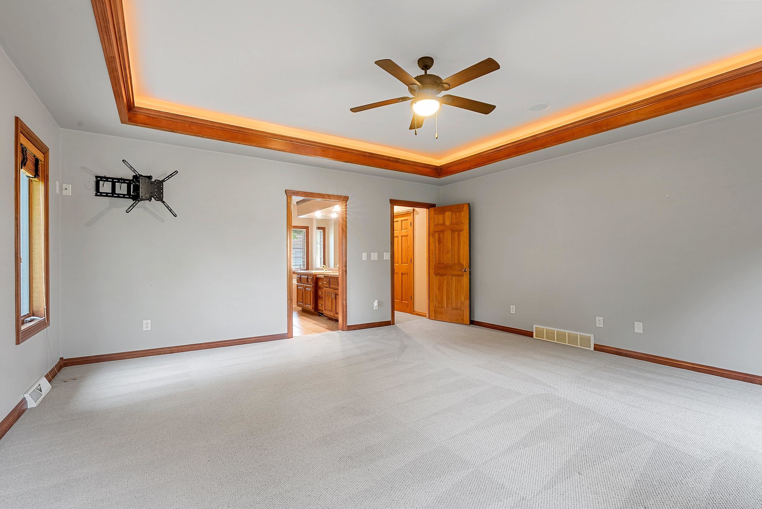 Watch the sunset from your living room! This exceptional custom-built walkout ranch nestled on Lake Largo fills every room with natural light. It offers 5 spacious bedrooms, 3.1 bath home with high ceilings, an open floor plan and gas fireplace. A large master ensuite with whirlpool tub, walk in closet, double vanity and walk in tile shower. Kitchen comes fully equipped with stainless steel appliances & never ending counter space & storage. Finished walk out lower level where you will find 2 of the 5 bedrooms, full bath, family room, wet bar and ample storage. Fantastic for entertaining! Beautifully landscaped yard with a large, covered walkout patio, deck, sprinkler system and private dock included. New furnace & central air. Cedar shake shingle, heated garage. Lake views from every room!
