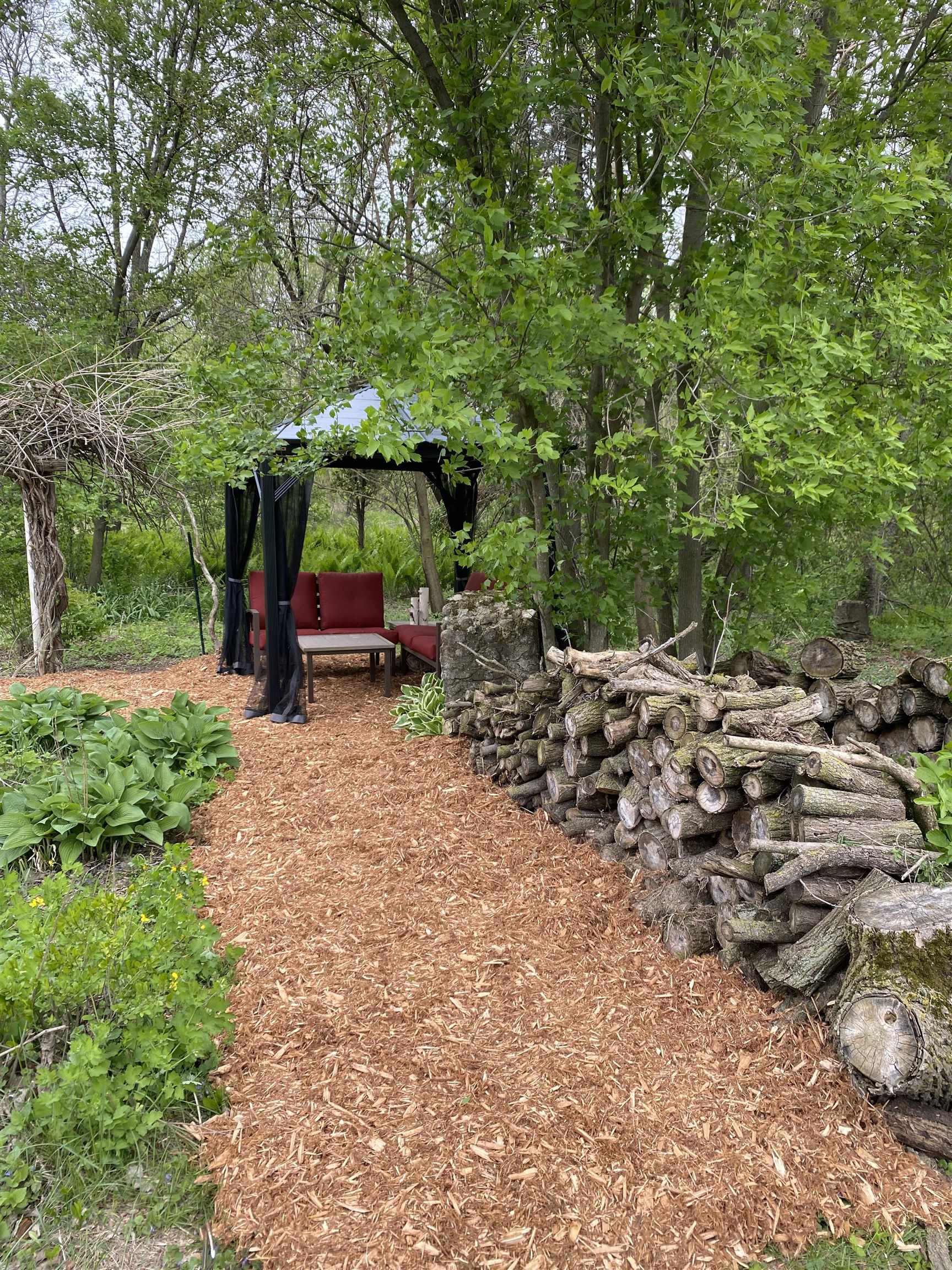 Nestled on 3 beautifully wooded acres just 15 minutes from Green Bay, this charming farmhouse offers privacy and modern updates. Features include hardwood floors, updated electrical with a modern panel, newer septic system and furnace, plus a 30-amp outdoor RV hookup. An attached one-stall garage and two outbuildings provide excellent storage and flexibility. The expansive yard includes gardens, fruit trees, a Magnolia tree, Concord grapes, raspberries, rhubarb, perennial beds, a screened gazebo, and new cedar landscaping with winding paths. Room for animals or a future pole shed or workshop.