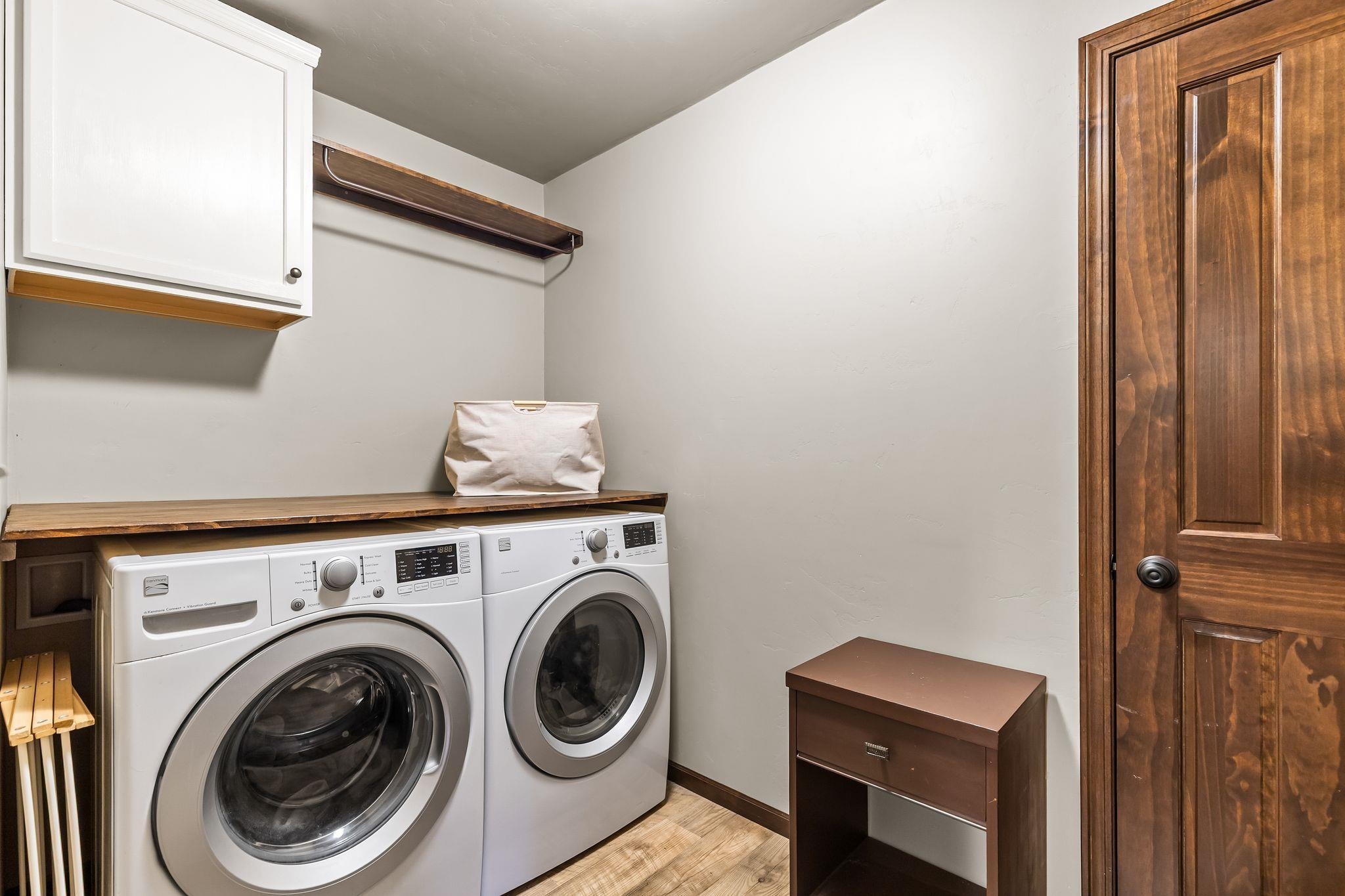 Kitchen refrigerator, dishwasher, microwave, washer & dryer, curtain rods, curtains, garage & closet shelving affixed to wall, front yard irrigation.