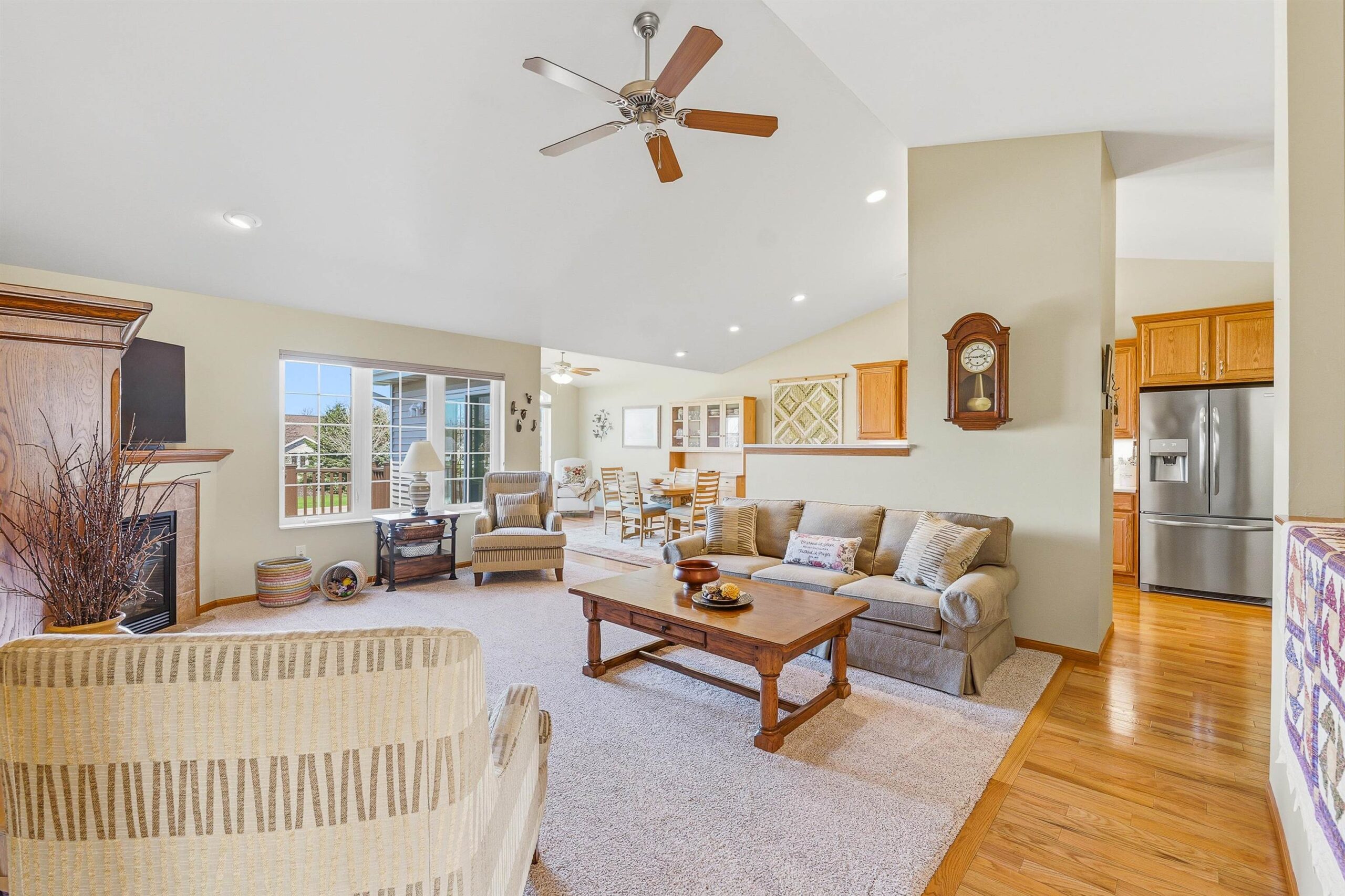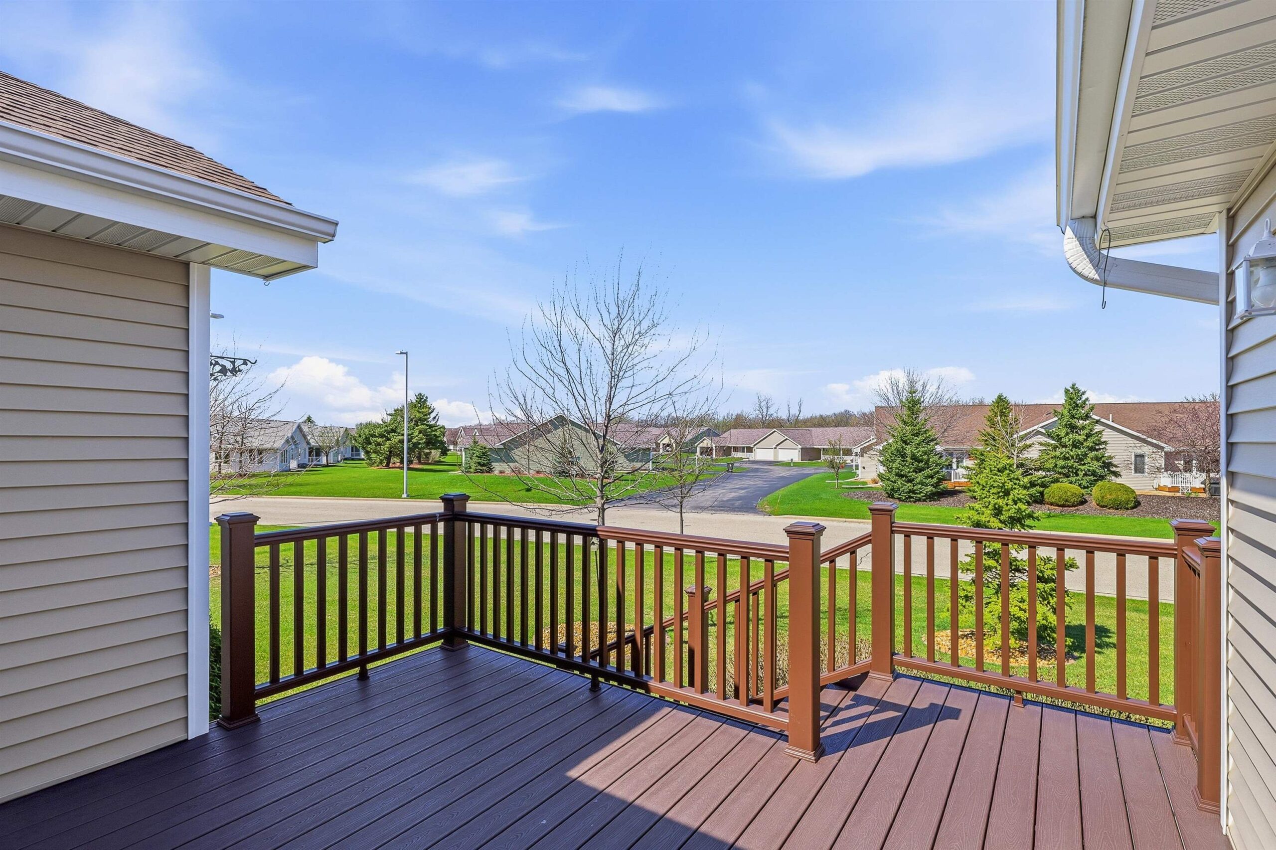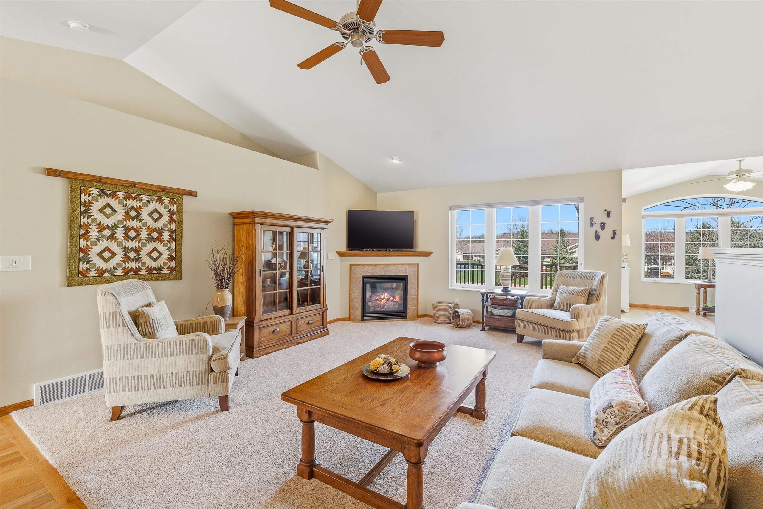 Well maintained open concept 2 bed/3 bath condo with lots of natural light. This sun filled unit has 2600 sq ft of living space with vaulted ceilings, gas fireplace, kitchen with quartz counter top, deluxe pantry and a cheery, cozy sunroom. The lower level has a large family room, exercise room, full bath and another room seller uses as a bedroom. Perfect for guests. Features include zero-entry access, an abundance of storage, first floor laundry and an attached 2 car garage. Enjoy the outdoors on the front porch, relax on the composite deck, or walk the nearby trails around the pond. Measurements are approximate and should be confirmed by buyer if material. Offers to be presented Friday, 04/24/26. Schedule your showing today!
