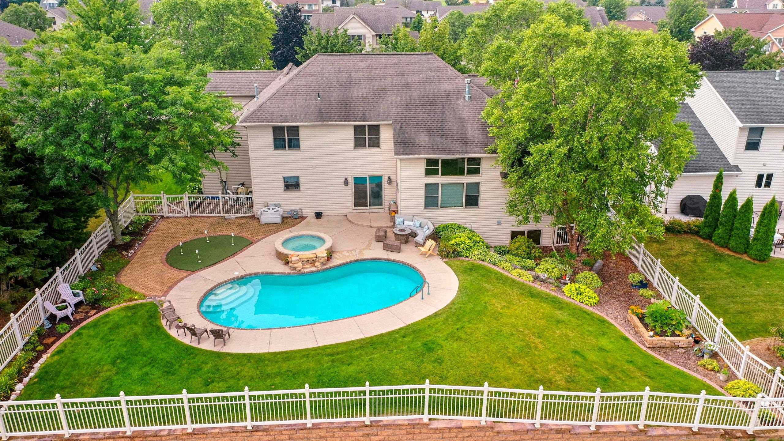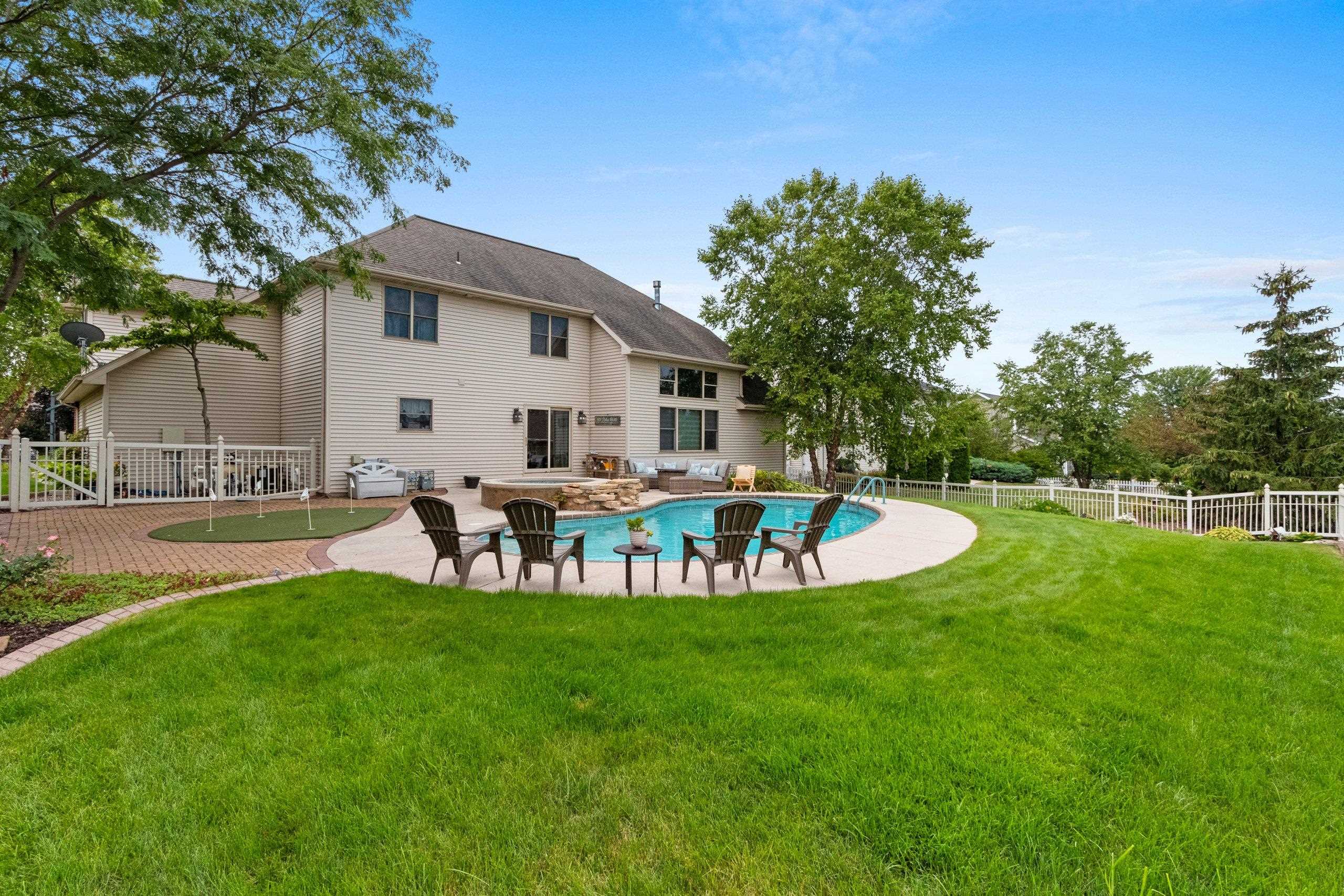 Indulge in ultimate luxury + escape to this stunning 5-bed retreat featuring a breathtaking resort-style backyard with an in-ground pool, elevated hot tub, private putting green, fenced in yard, beautiful landscaping + built-in sprinkler system - a dream setting for endless relaxation. From soaring ceilings+ a convenient split layout to a grand 3-floor elevator, no detail was overlooked. The main-level primary suite features a luxurious spa-like ensuite with a jetted tub, walk-in shower + spacious walk-in closet designed for comfort + style. The finished lower level is an entertainer's dream, complete with in-floor heating, a family room + half bath for added convenience. Enjoy new carpeting upstairs (9/24).