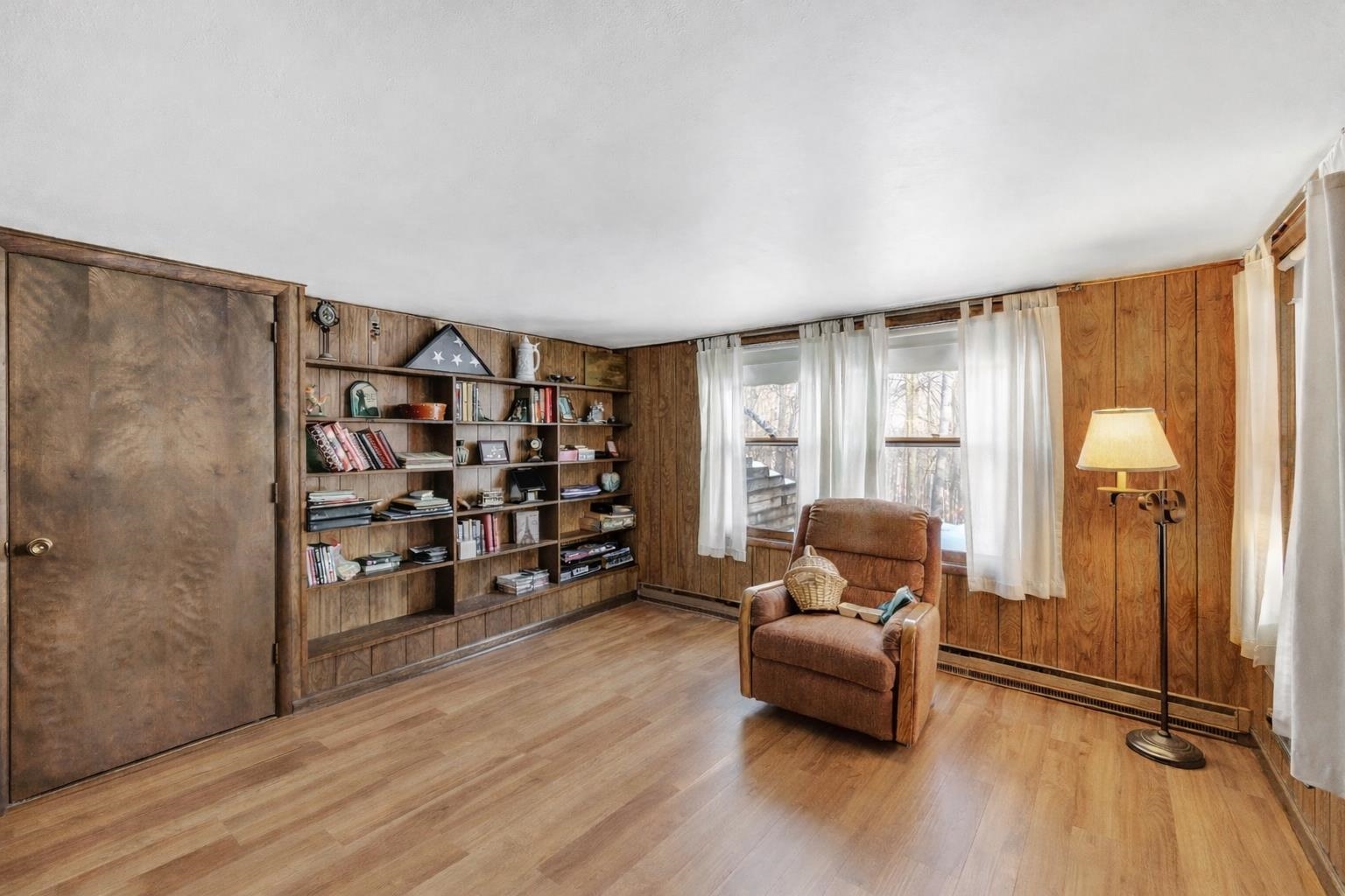 Nestled on 2.72 serene acres on a quiet dead-end road, this charming 3-bedroom, 2-full-bath walk-out ranch offers the perfect blend of character & modern updates. Step inside to discover beautiful rustic hickory floors flowing throughout the home, complemented by Pella windows with convenient built-in blinds. The inviting living room showcases panoramic views of the wooded backdrop, a cozy wood-burning fireplace, & elegant french doors. Kitchen features granite countertops, stainless steel appliances, & custom cabinetry. The spacious primary suite offers a walk-in closet & updated shower. Set back on a wooded ravine lot, this home provides exceptional privacy, natural beauty, & timeless charm! Electric heat in LL.