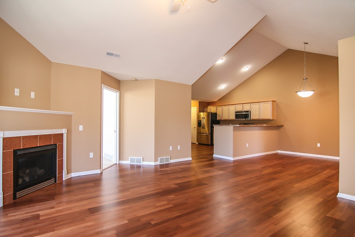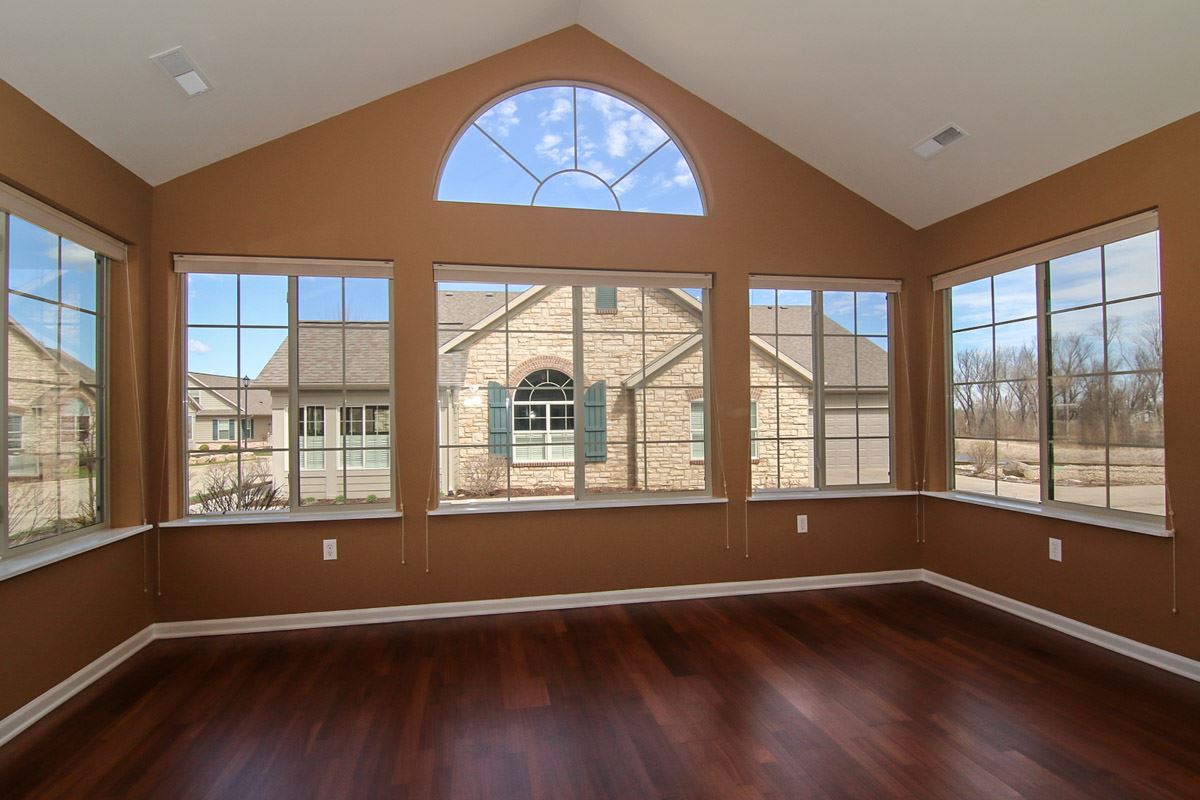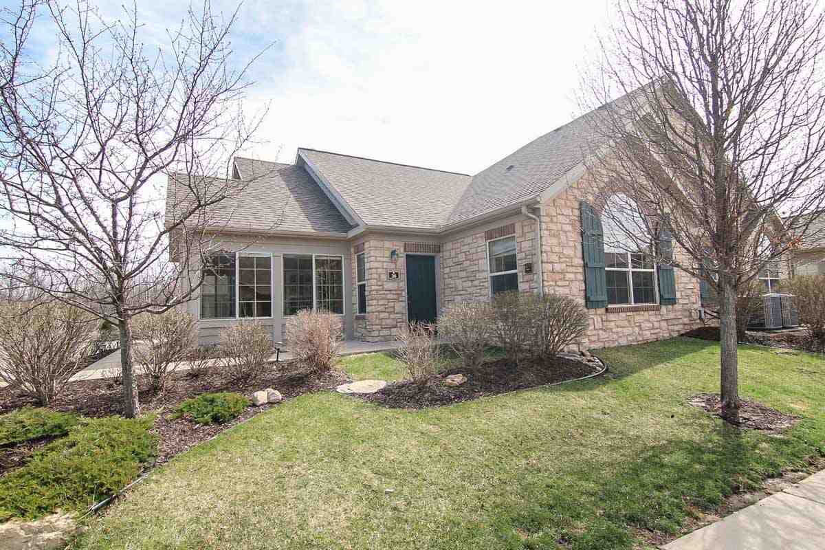 Welcome to the Crossing. Wonderful Ranch Abbey plan offers French Country stone exteriors, 2 bedroom, 2 bath, large pantry, corner fireplace, vaulted ceilings, 4 season veranda, extra storage in garage attic, freshly painted, refinished woods floors. Community clubhouse: kitchen, lounge area, pool table,TV, fitness room, outdoor pool. Near parks and trails. Easy access to downtown, Capital & UW and Beltline. Sq. ft. est.