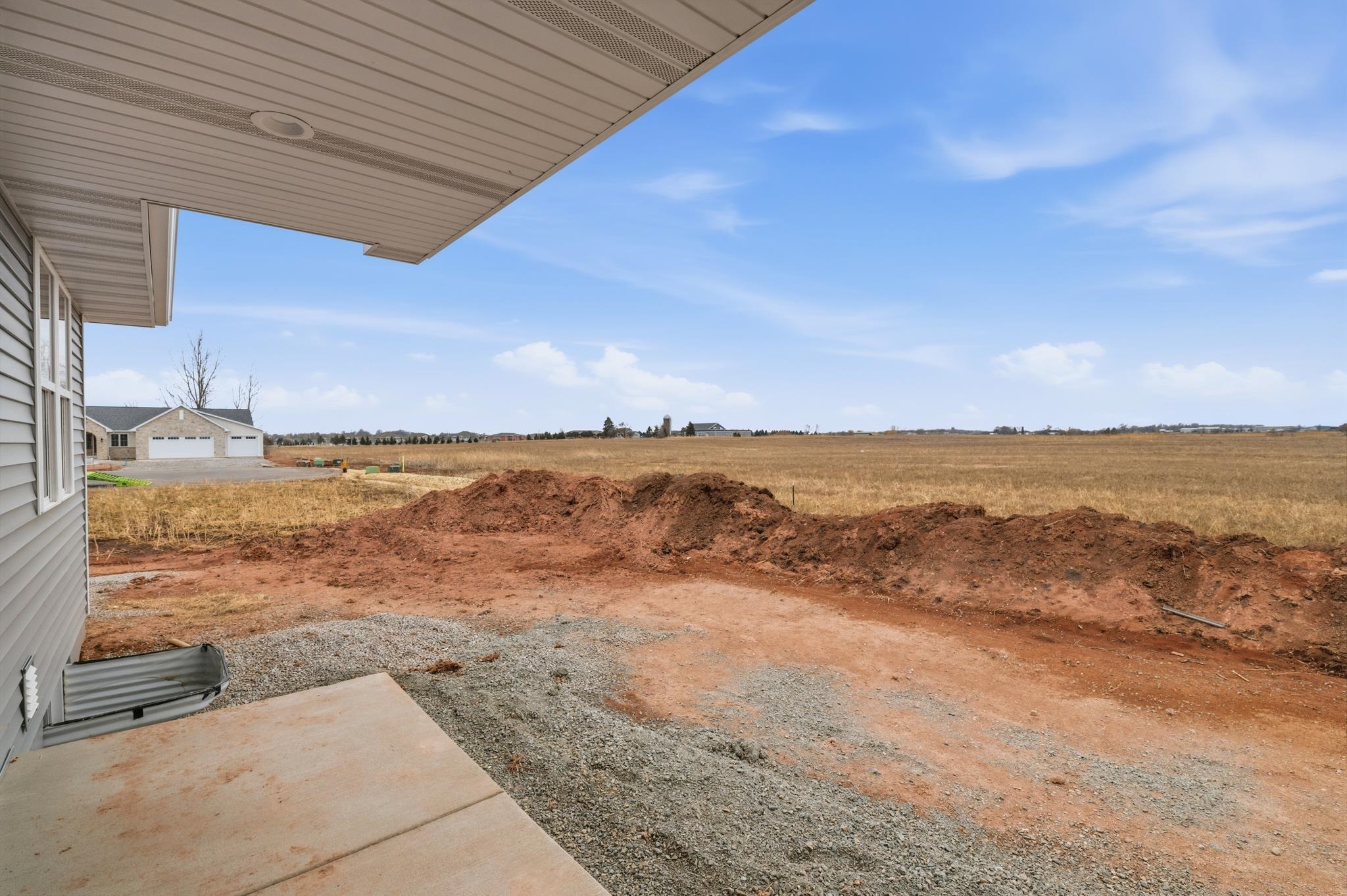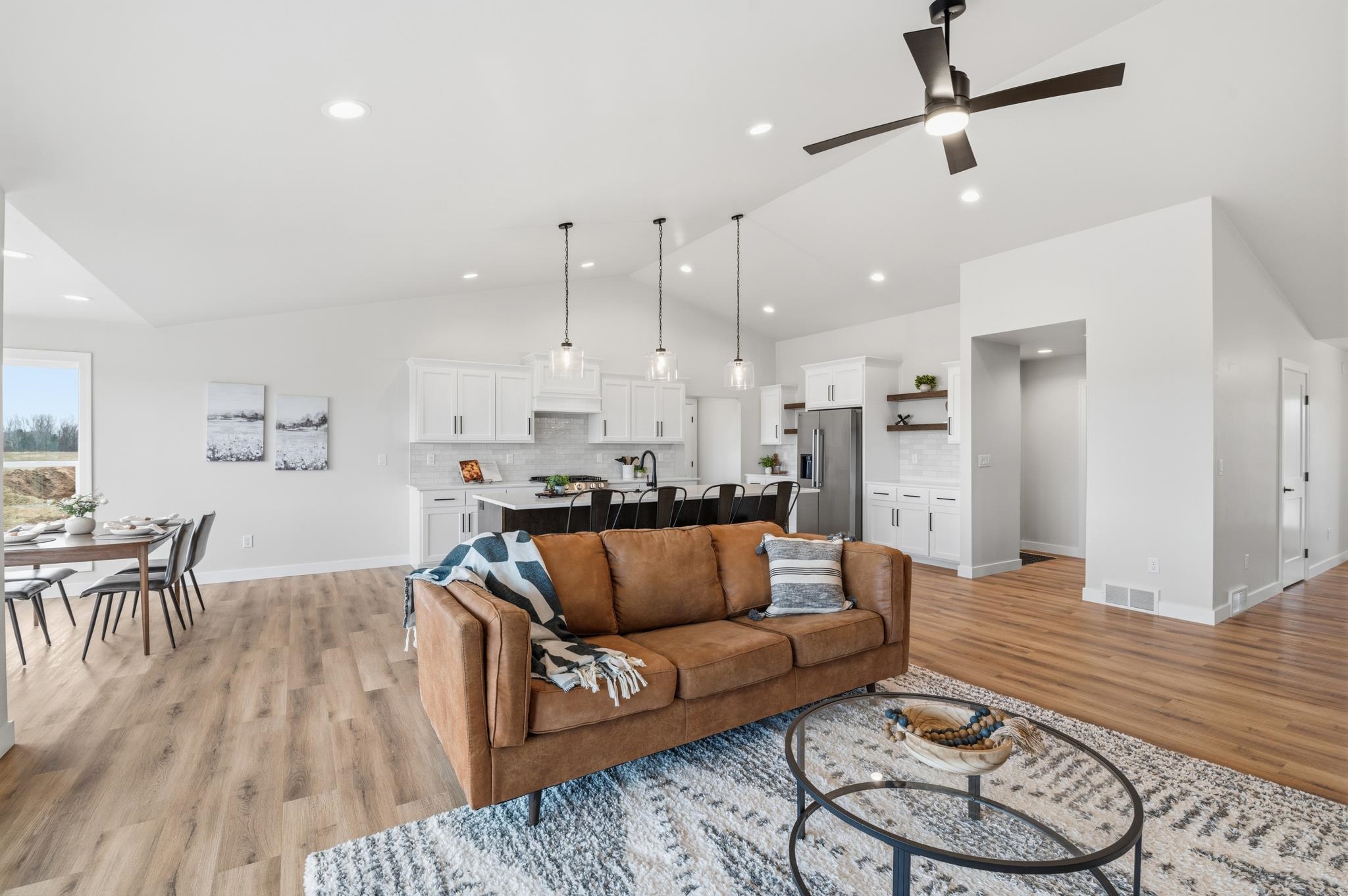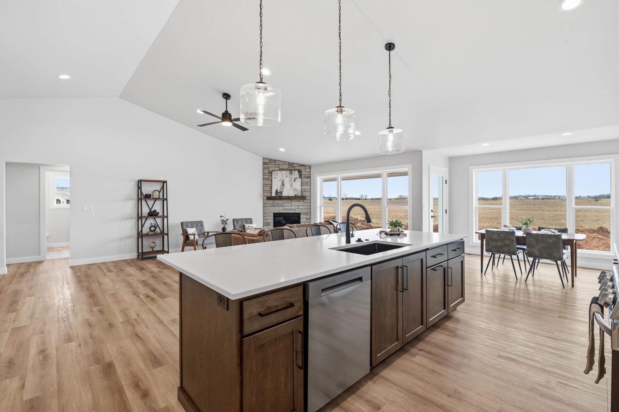 Well-crafted home with an abundance of natural light. This design seamlessly connects the kitchen, dining & great room, making it ideal to enjoy quality time together. The kitchen is a delight, boasting a 10’ island, tiled backsplash, gas range, floating shelves and walk-in pantry. Whether preparing meals or hosting, this space offers functionality & style. Covered patio is perfect for year-round grilling & relaxing. Cathedral ceilings, gas FP w/floor-to-ceiling stone & quartz counter/vanity tops complete this home. Primary suite offers tiled walk-in shower & glass door already installed. Ample space to create the perfect setting for comfort & relaxation. Home currently backs to a farm field. Broker owned.