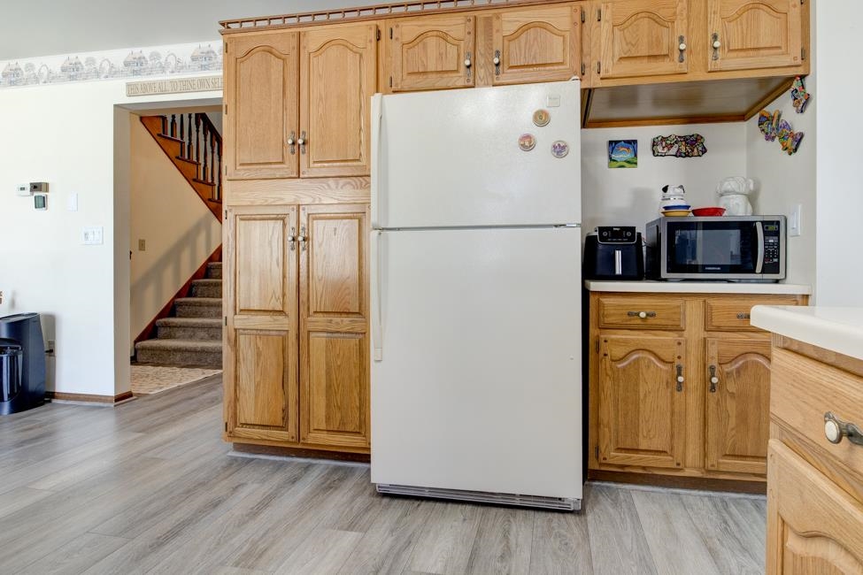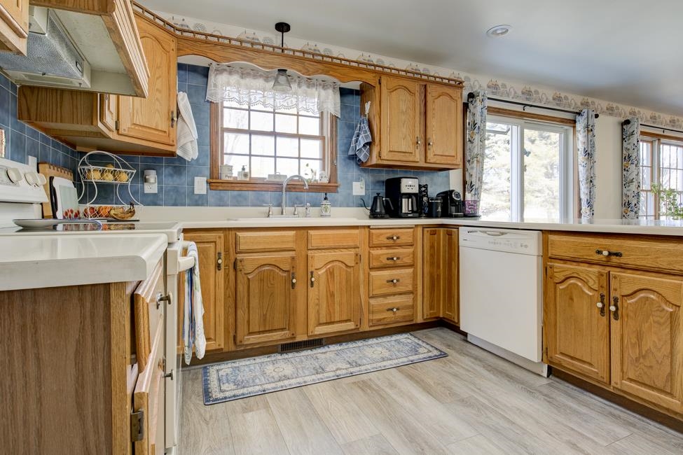 stove, refrigerator, dishwasher, microwave, washer, dryer, window treatments