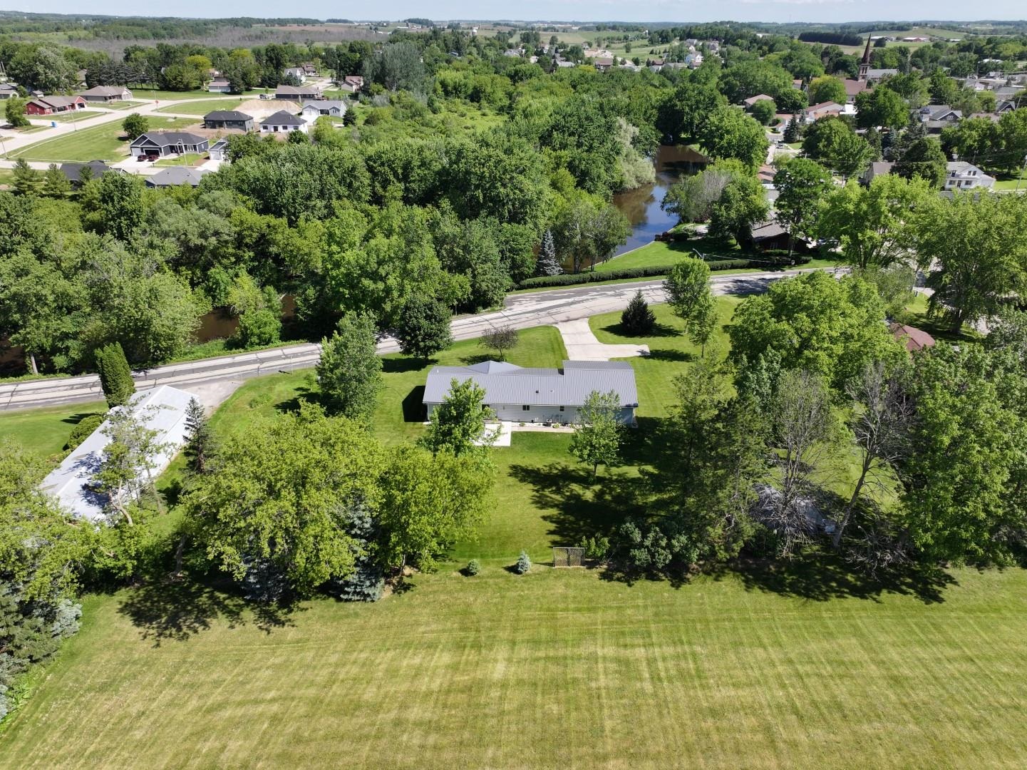 Incredible 1 acre lot that feels like country, yet this is set in the village of Theresa! This open concept ranch has Rock River views out the front & full green space behind as the back yard backs up to soccer fields. House features large living room open to dining/kitchen area. Combo of real hardwood & tile floors. Main floor laundry & 3BDR w/ 2 full BA! Lower level features bar area w/ decorative stone wall, & plenty of room to add additional finished space. Att. garage measures 24x36 for over 850 sq ft of garage. Detached utility shed outback gives a spot for all yard equipment. Poured concrete patio out the dining area for cooking out, House, garage and shed have steel roofing. A one of a kind setting for this home! If exact sq footage is a concern, measurements should be verified