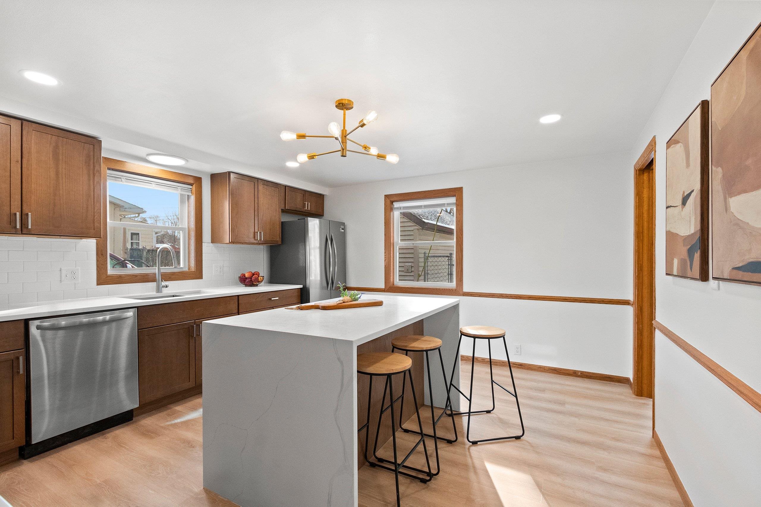 This beautifully updated 4 bedroom home in Kimberly is a rare find! At the heart of the home is the expansive kitchen, featuring quartz countertops and a striking waterfall island that anchors the space. Warm, richly toned cabinetry, a tile backsplash, and a full appliance package come together to create a kitchen that is both beautiful and highly functional. The finished lower level offers a bright, versatile space ideal for entertaining or relaxing, complete with a bar area that extends the home’s living and gathering options. Outside, enjoy a spacious yard and the convenience of a location within walking distance to Kimberly schools, parks, shopping, and everyday amenities. Schedule your showing today! *Buyer/Buyers Agent to confirm finished sqft - LL ceiling = exposed floor joists.