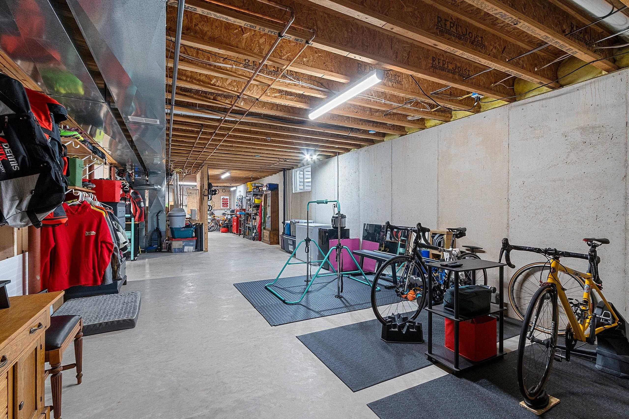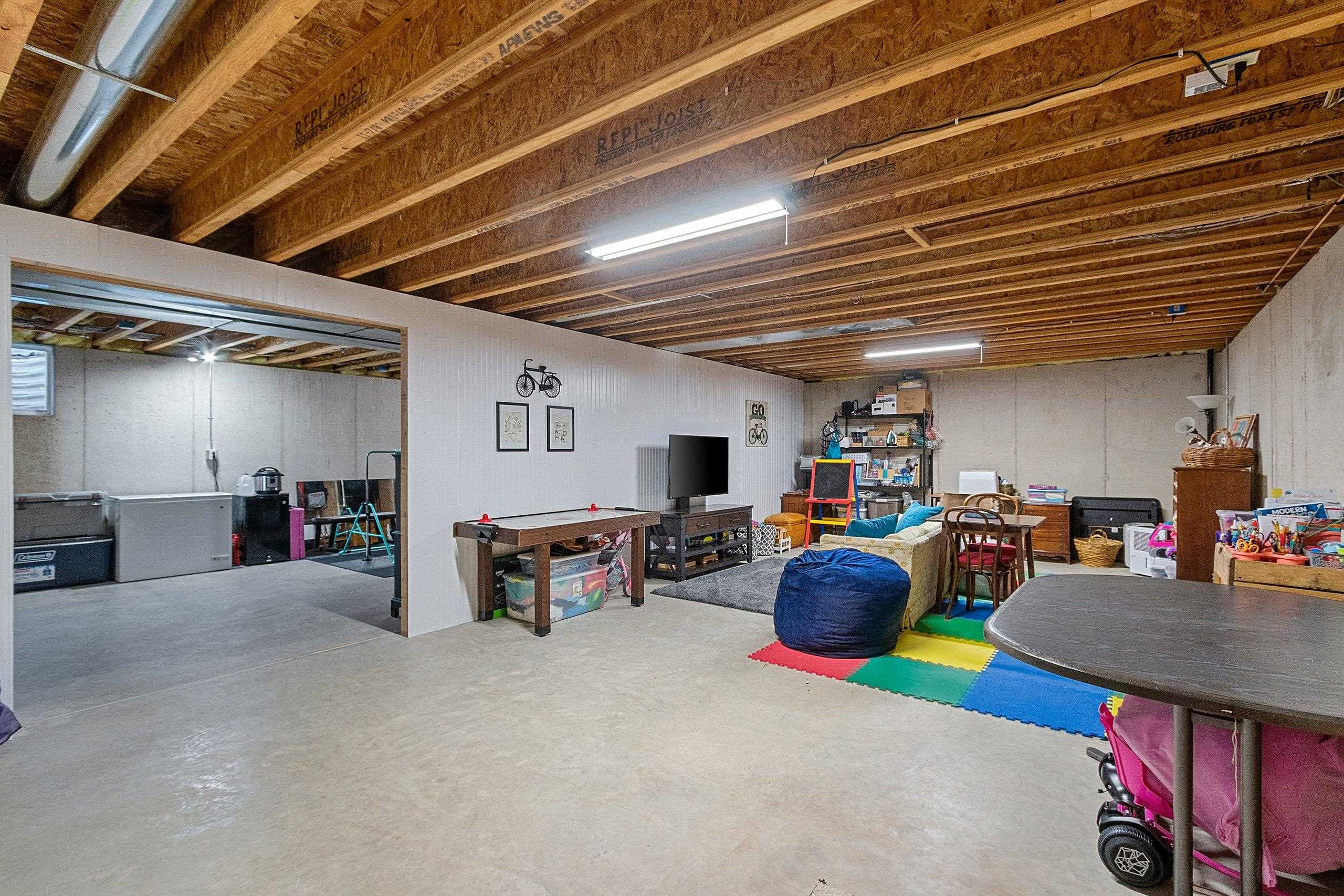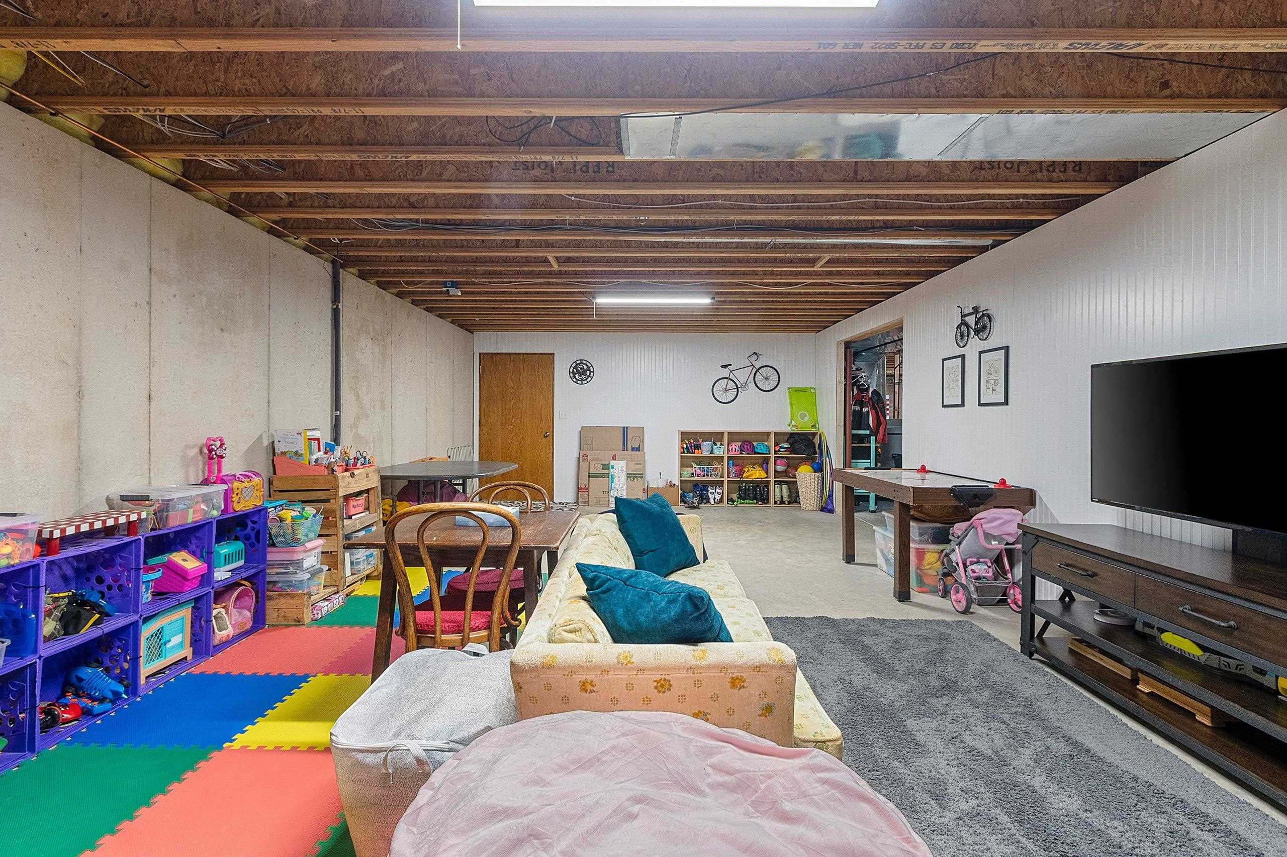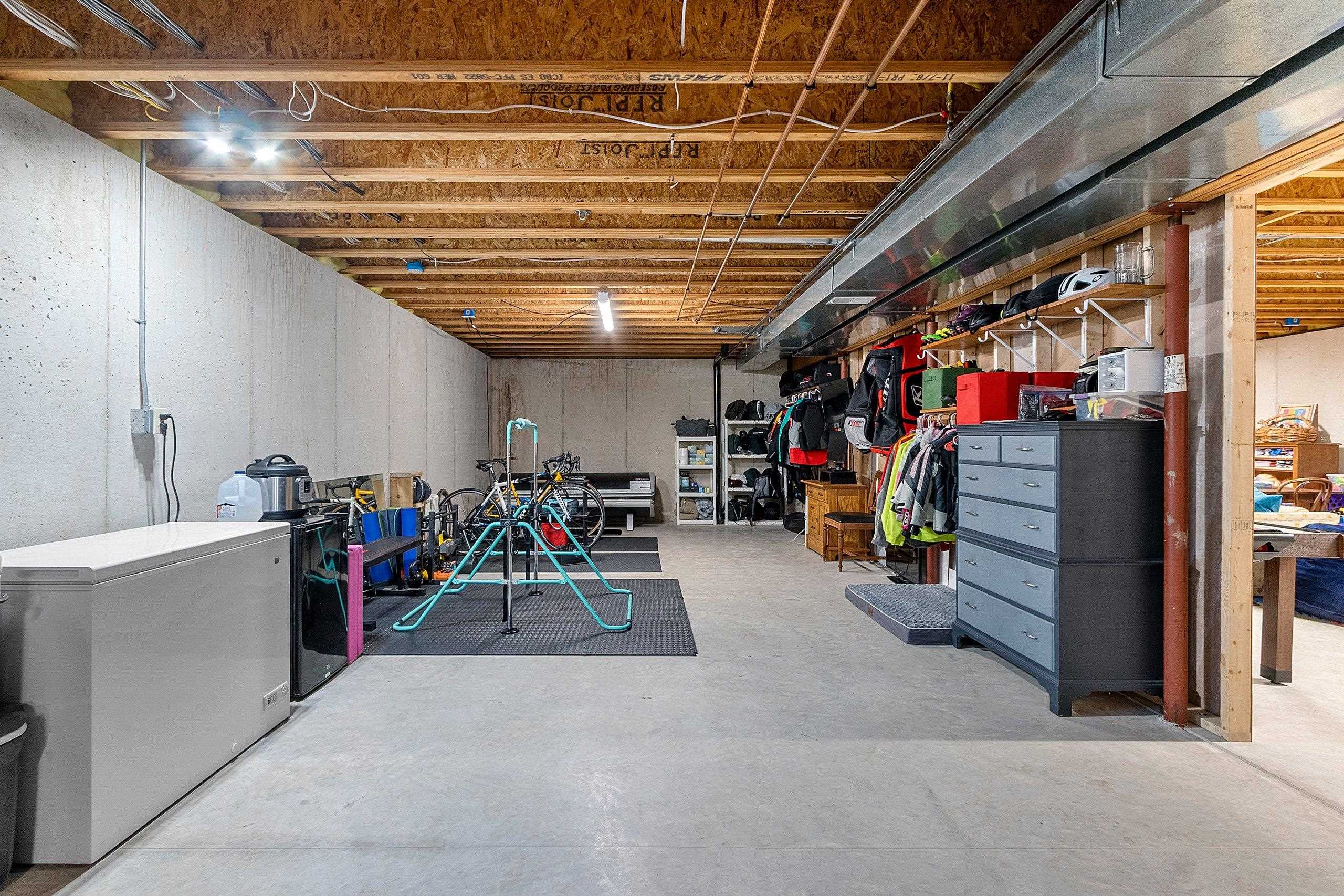 window treatments, tv bracket, playset, shelving in far corner of basement, pergola, desk, kitchen appliances, water softener