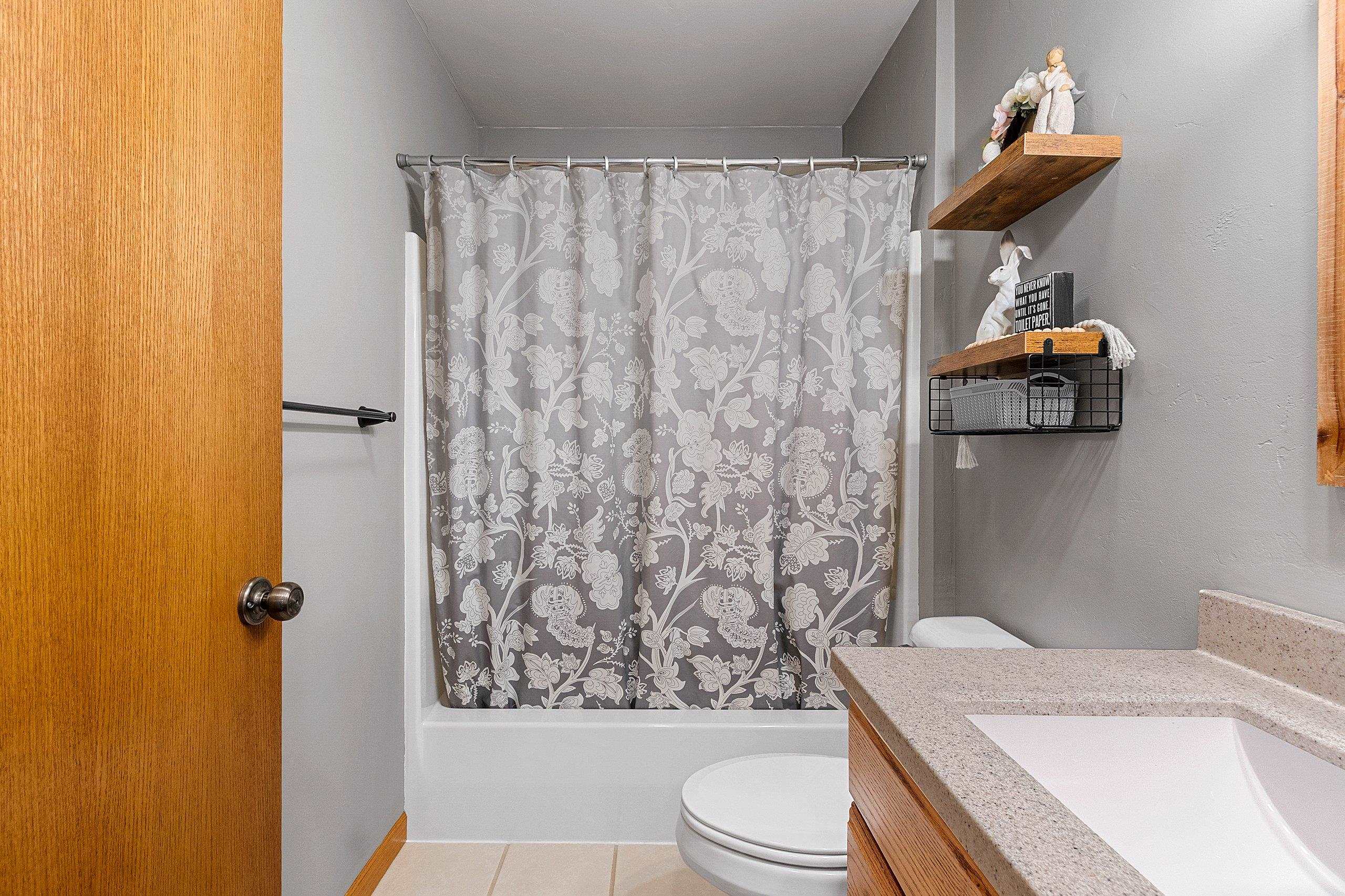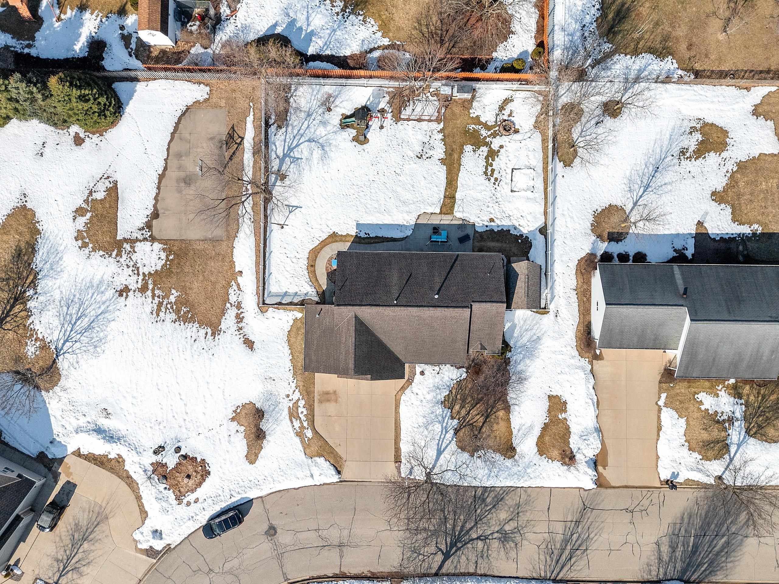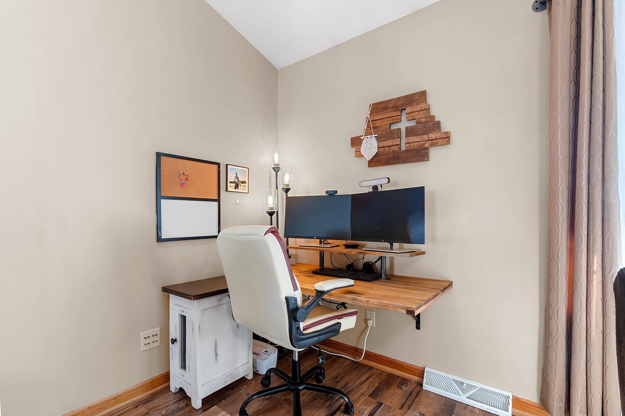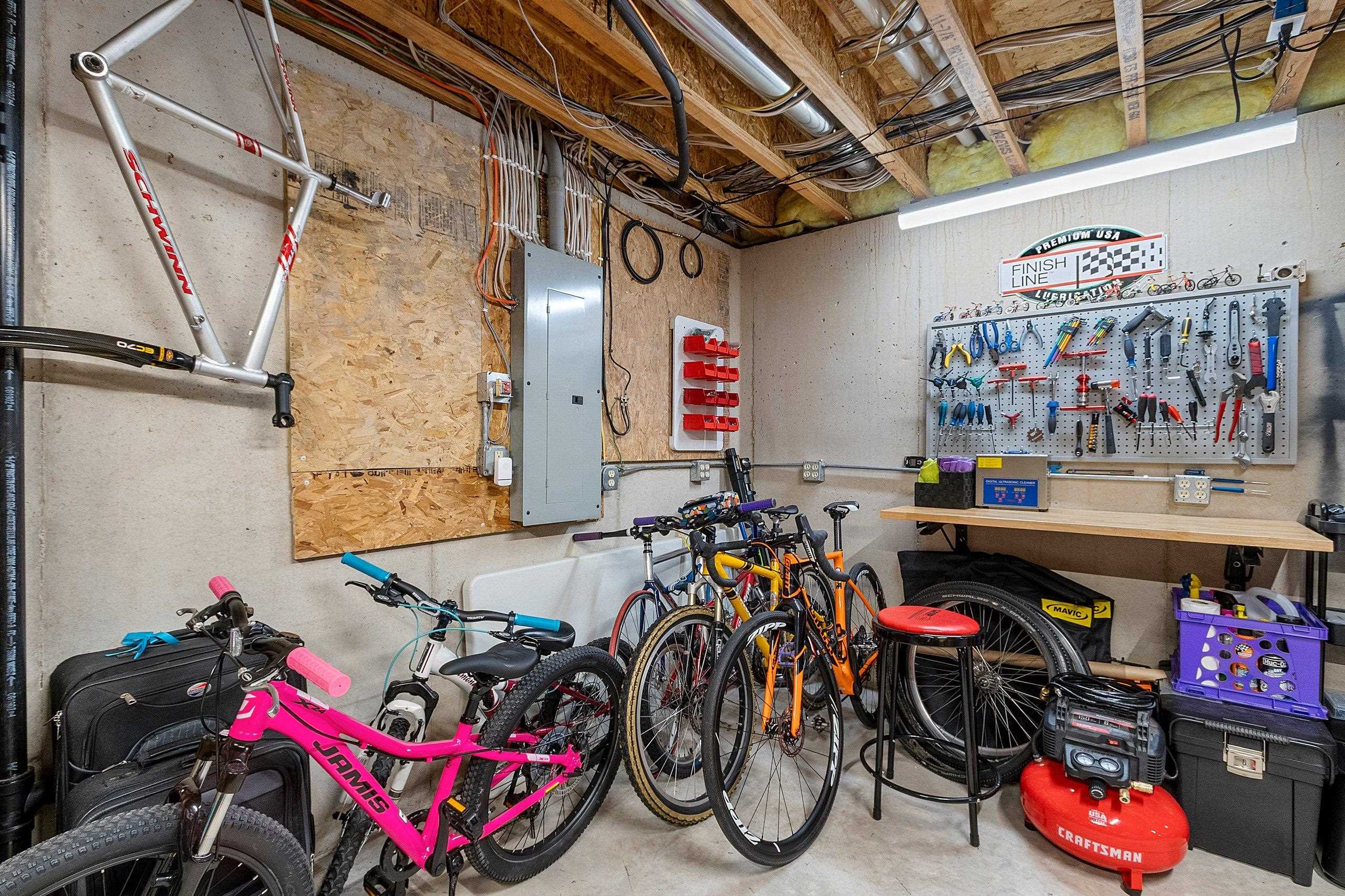 window treatments, tv bracket, playset, shelving in far corner of basement, pergola, desk, kitchen appliances, water softener