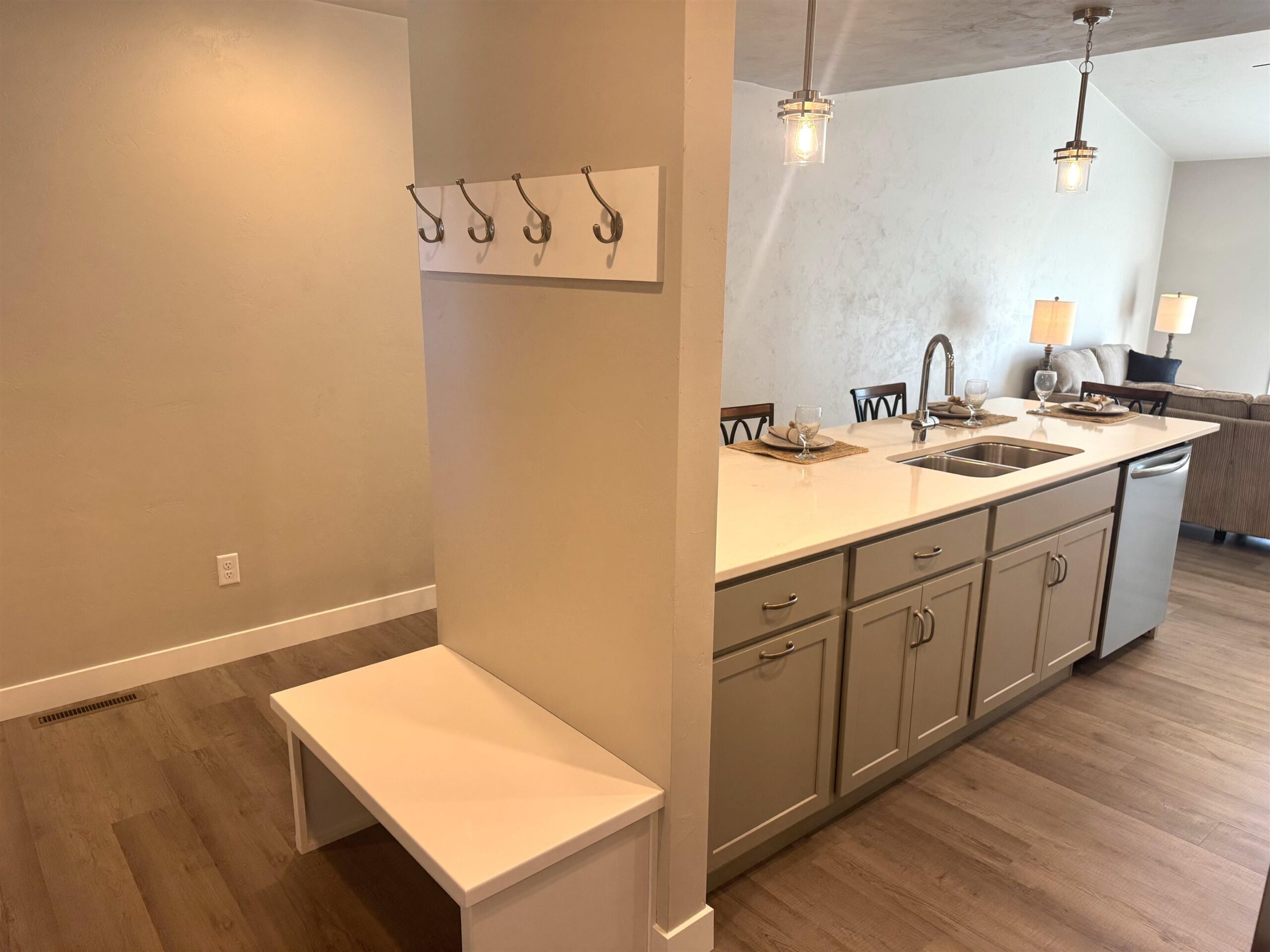 Bright new Condo with white cabinets and trim & huge eat-in kitchen island w Quartz countertop. Beautiful light fixtures & subway tile backsplash adorn the kitchen w high-end finishes. Refrigerator, Stove, Dishwasher, Microwave, Garbage Disposal included. Open floorplan Kitchen to Living Room has durable and easy to clean Luxury Vinyl Planking. LR opens to the outdoors onto large 10’x14’ Trex Deck, big enough for table & chairs. Enjoy the large, landscaped yard and sunsets on your Deck w southern exposure. Primary w attached bath, Quartz countertop, and walk-in closet. Pantry. Laundry w Drop Station, closet and Stacked W/D included! Finished LL, two large bedrooms, family room and full bath. 2 car attached garage. Low Fees $150/mo., snow removal and lawn care.