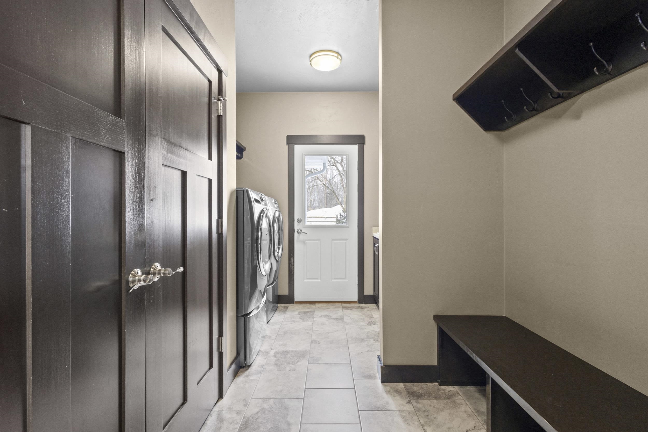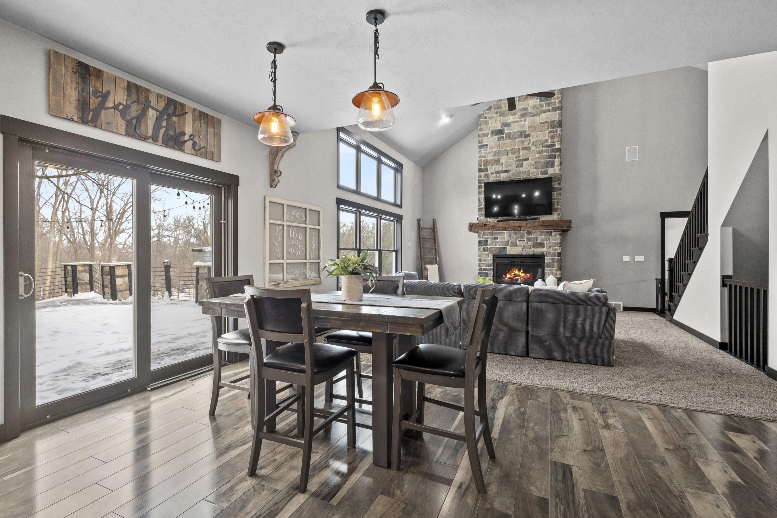 Stunning 1.5-story home on a private, wooded 3.467-acre lot with a scenic ravine. Thoughtfully designed with great flow, large foyer and private office with French doors. Main living area features a dramatic floor-to-ceiling stone FP & tons of natural light. The kitchen offers granite countertops, center island with seating, walk-in pantry & patio drs leading to a spacious deck w/ pillars,steel railing overlooking the serene setting w/ stairs to the patio & hot tub. The main-level primary suite includes radiant in-floor heat, double vanity, tiled shower, and walk-in closet. Upper level boasts 3 bdrms, bathroom & landing area/study space. Newly finished lower level features a full wet bar, quartz counters, tray ceilings & rec rm. Heated 3-stall garage with lower-level access & so much more!