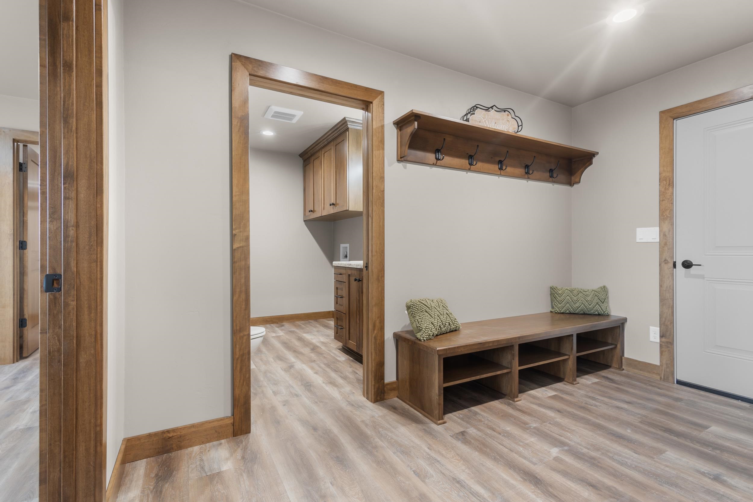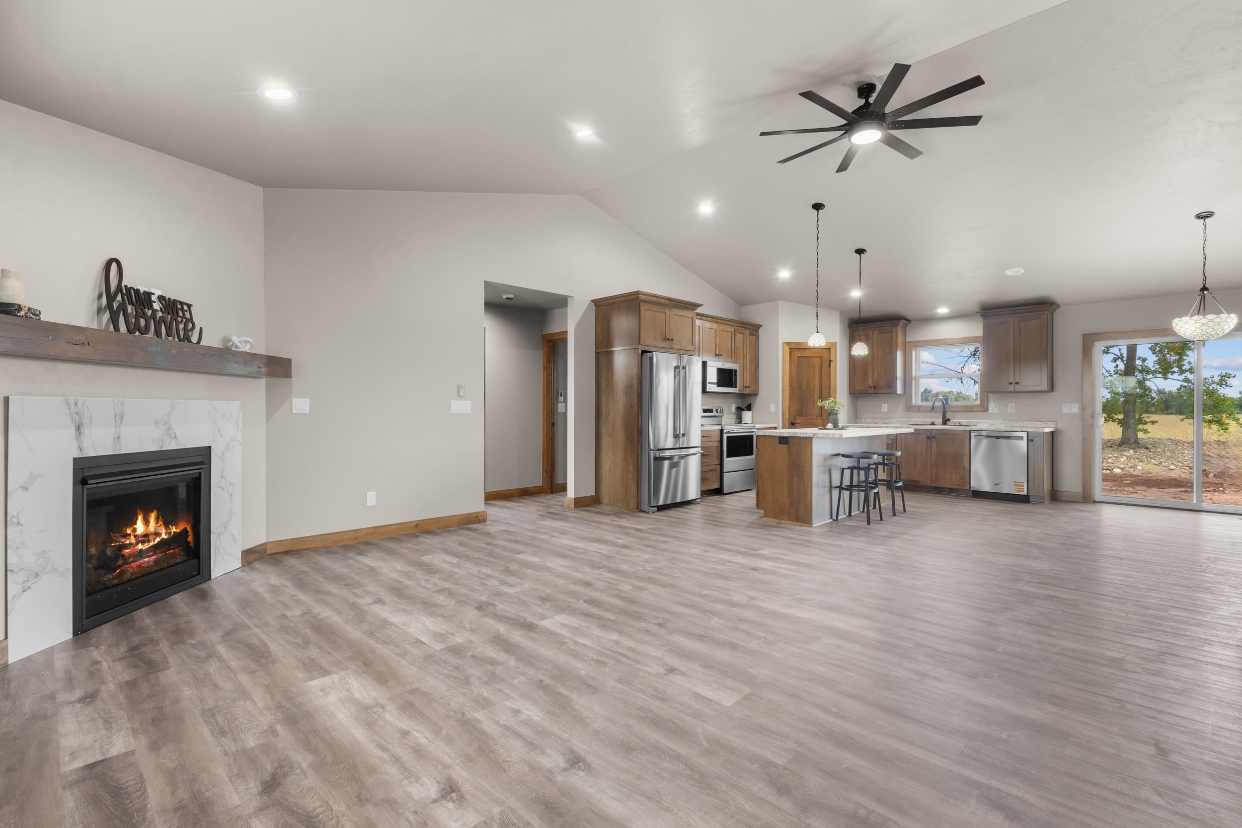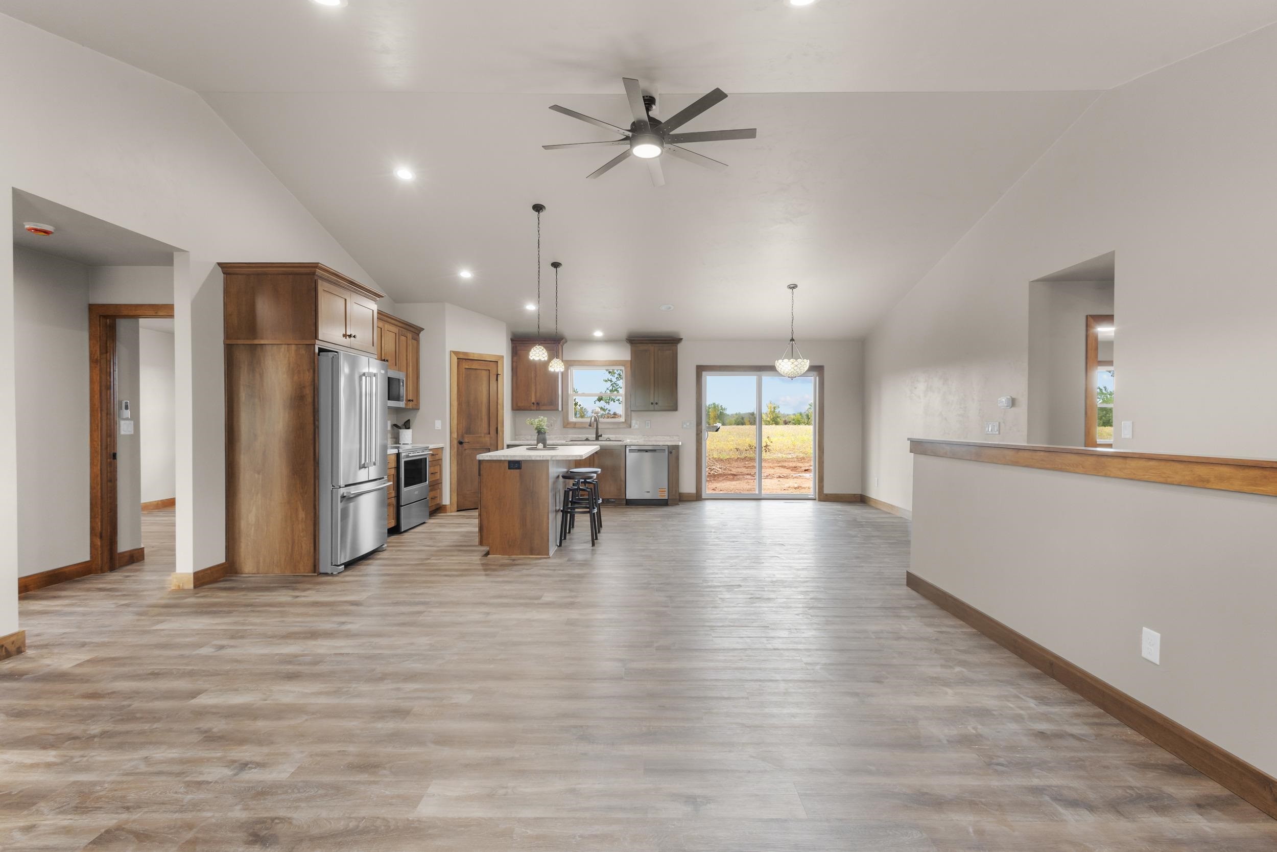 Quality built home with a 4 stall attached garage, 3rd stall is another stall deep plus has a convenient overhead door that leads to the backyard! Sun filled living rm w/ vaulted ceiling, gas FP, open concept to the kitchen dining area. Kitchen offers stove, refrigerator, dishwasher, microwave, custom made soft close cabinets & lots of them! Lighted pantry, nice countertop space, snack bar, dining area. Primary bedroom offers recessed lighting, tray ceiling with fan, huge walk in closet, primary bathroom w/walk in shower and linen. 2 other generous size bedrooms both with ceiling fans & lighted closets. Lower level offers opportunity to add additional sq.ft, egress window & stubbed for another bathroom. 48 hours for binding acceptance, listing agent has an interest. Pics are similar