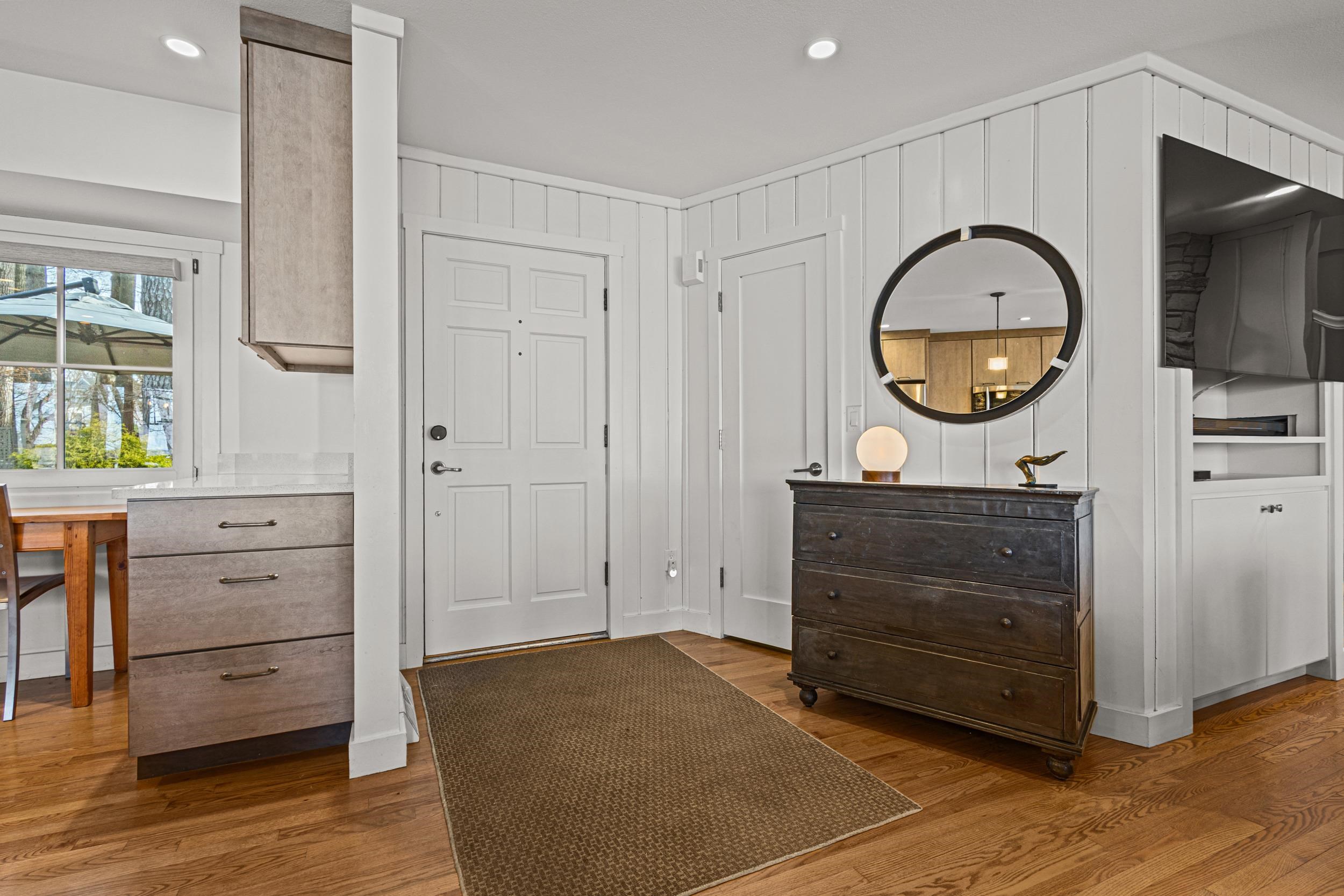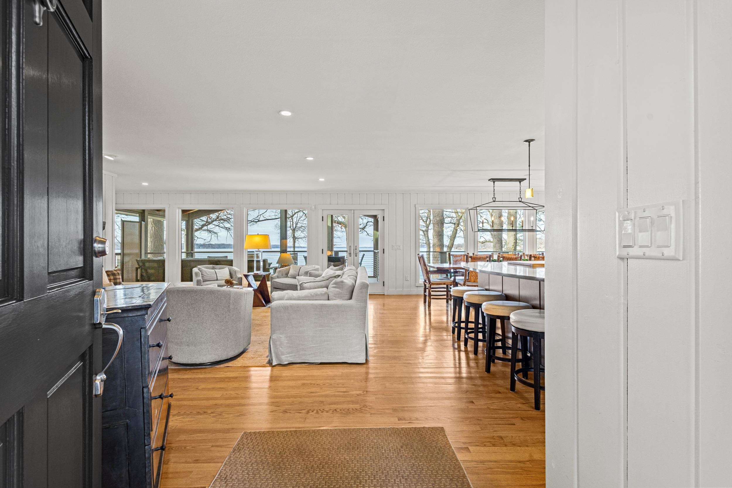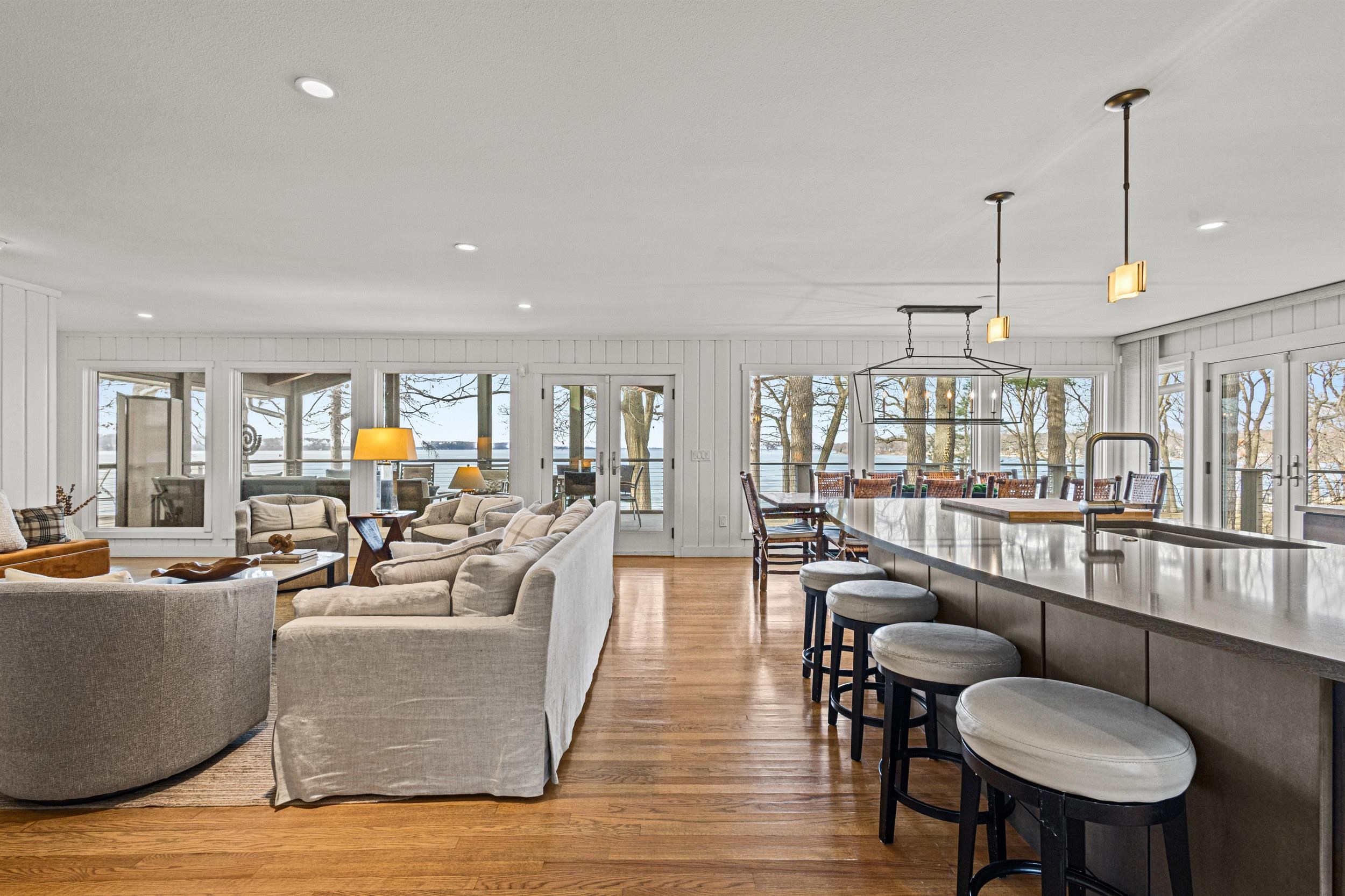 Prestigious Greenway Ave on the north shore of Green Lake is home to this exceptional modern rustic lake house. Originally built in 1945 and completely rebuilt top-to-bottom to todays standards, the residence blends timeless lake charm with refined comfort. The expansive great room serves as the heart of the home, creating an inviting central gathering space. Offering 6 bedrooms plus a den and 5.5 baths, the home is designed for both relaxation and entertaining. The huge lakeside screened porch with four skylights captures breathtaking water views. A vaulted ceiling highlights the main-floor primary suite, while an upper-level ensuite and spacious lower-level family room provide room for guests. Two wood-burning fireplaces, warm wood floors throughout, and a durable metal roof add character. Outside, enjoy the large lakeside fire pit and beautifully landscaped grounds on one of Green Lakes most coveted streets.
