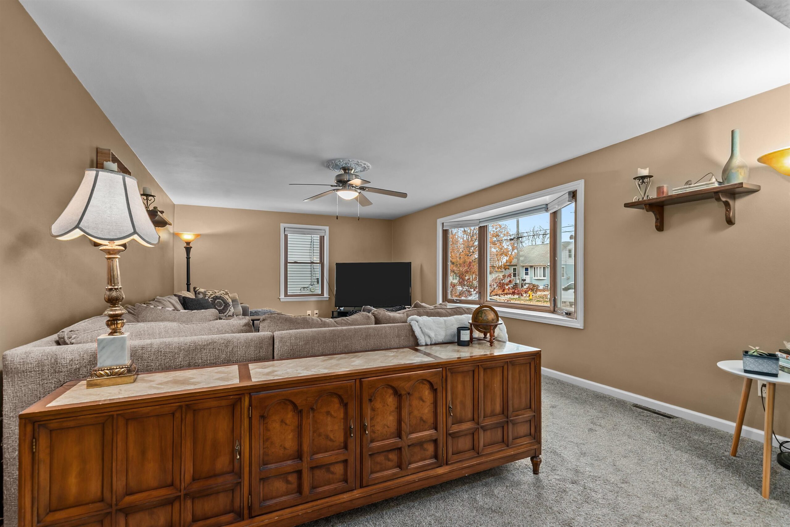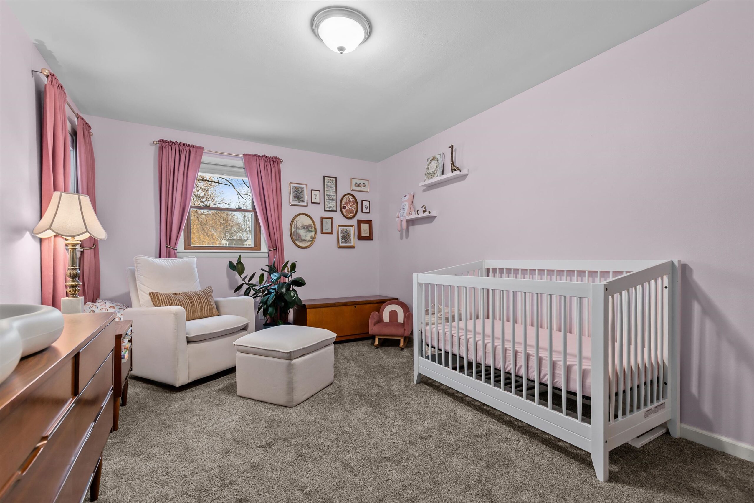 Seller's Personal Property, Living Room Shelves, Garage Metal Shelves, Chest Freezer, Curtains and Curtain Rods in Nursery.