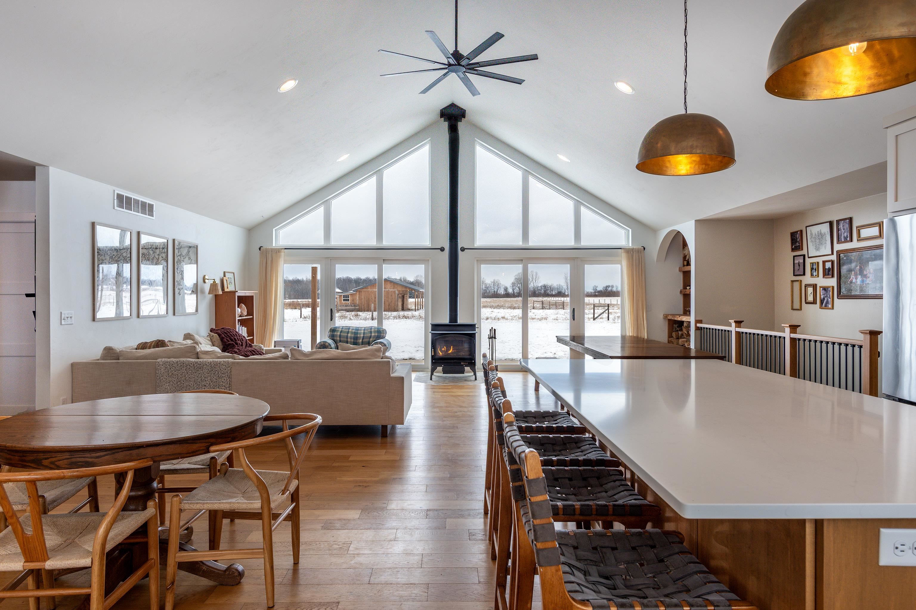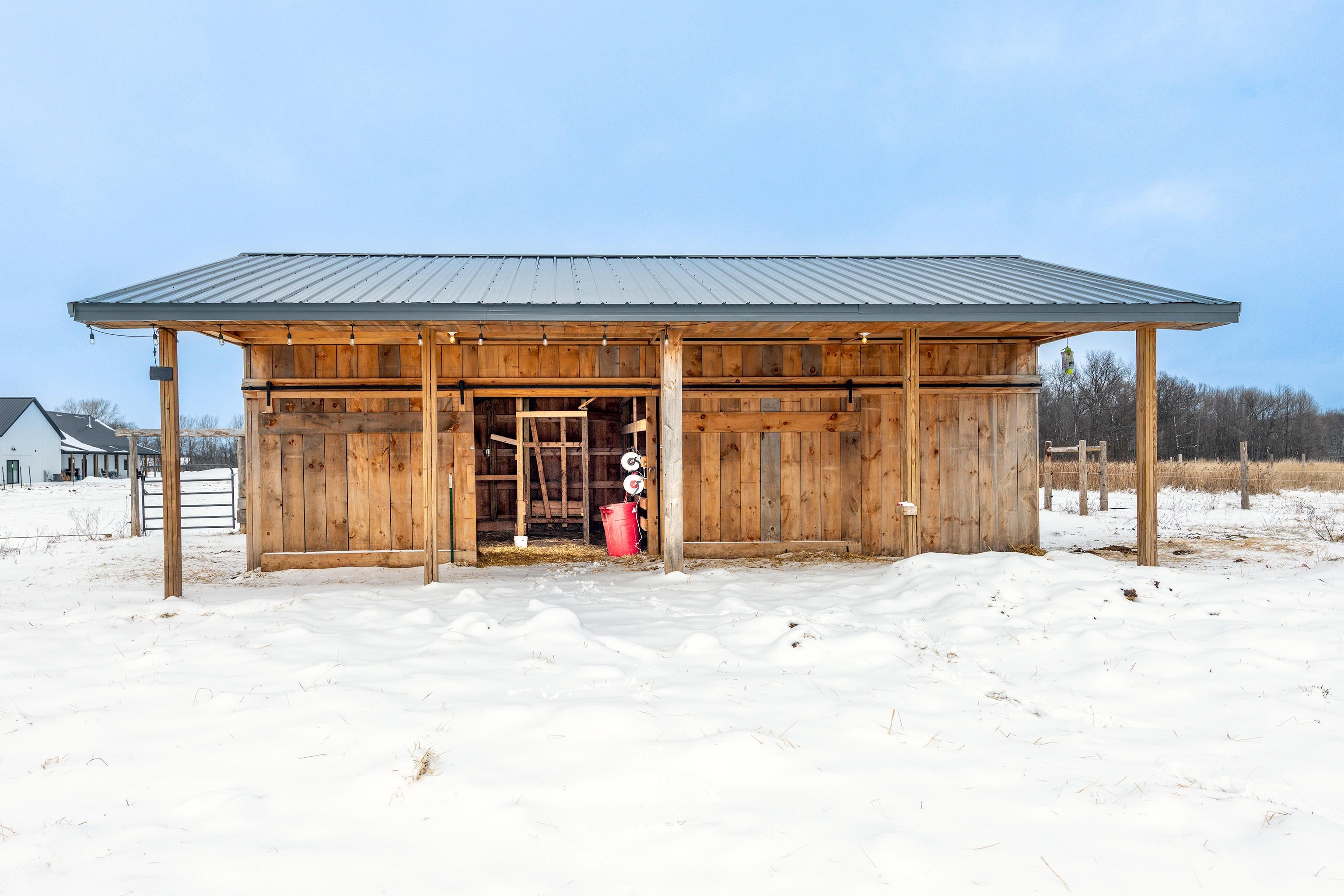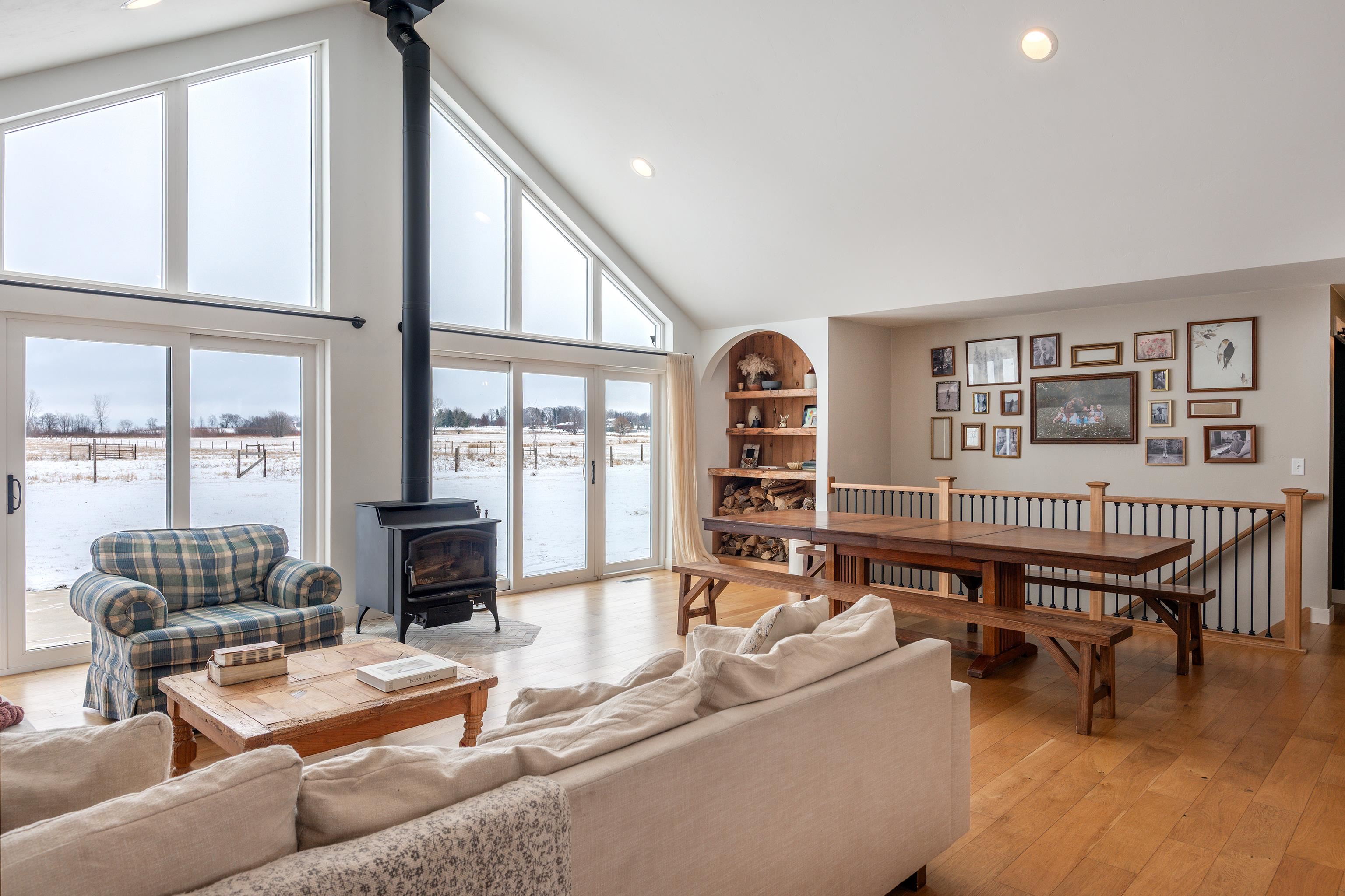 Showings begin 02/07/2026. Country living meets purposeful design in this custom-built 2021 ranch, on 9.72 acres. Designed for everyday comfort and elevated entertaining, the open-concept layout showcases vaulted ceilings, rich finishes, and a wood-burning fireplace that anchors the feeling of home. A gas fireplace brings warmth to the lower-level family room. The kitchen is a true showpiece, featuring quartz countertops, a Monogram range with pot filler, custom cabinetry, and a generously sized walk-in pantry. Thoughtful spaces include a stylish mudroom/laundry, a dedicated office, and a serene primary suite offering an ensuite bath with soaking tub and beautifully tiled showers throughout. Outdoors, the lifestyle continues with a back patio, raspberry plantings, and garden space. Attached garage is 30x40. The barn features a heated 8x10 milkhouse with water and 6.4 acres of fenced land, creating opportunity for a hobby farm, equestrian use, or refined rural living.