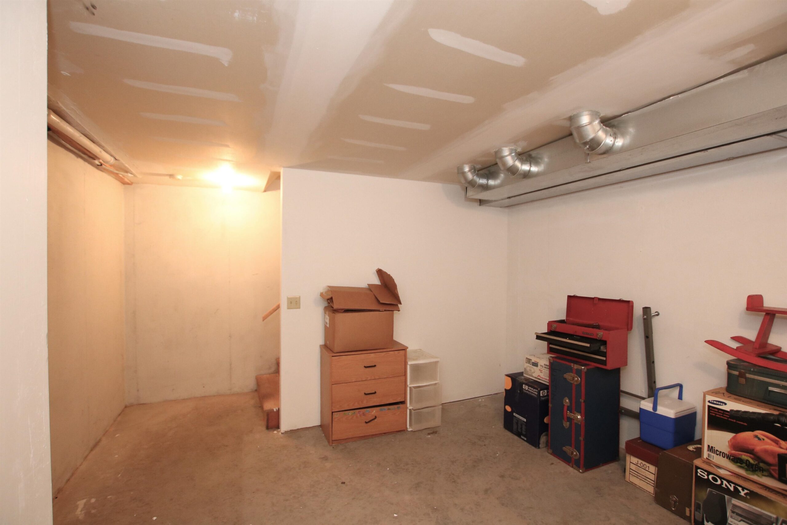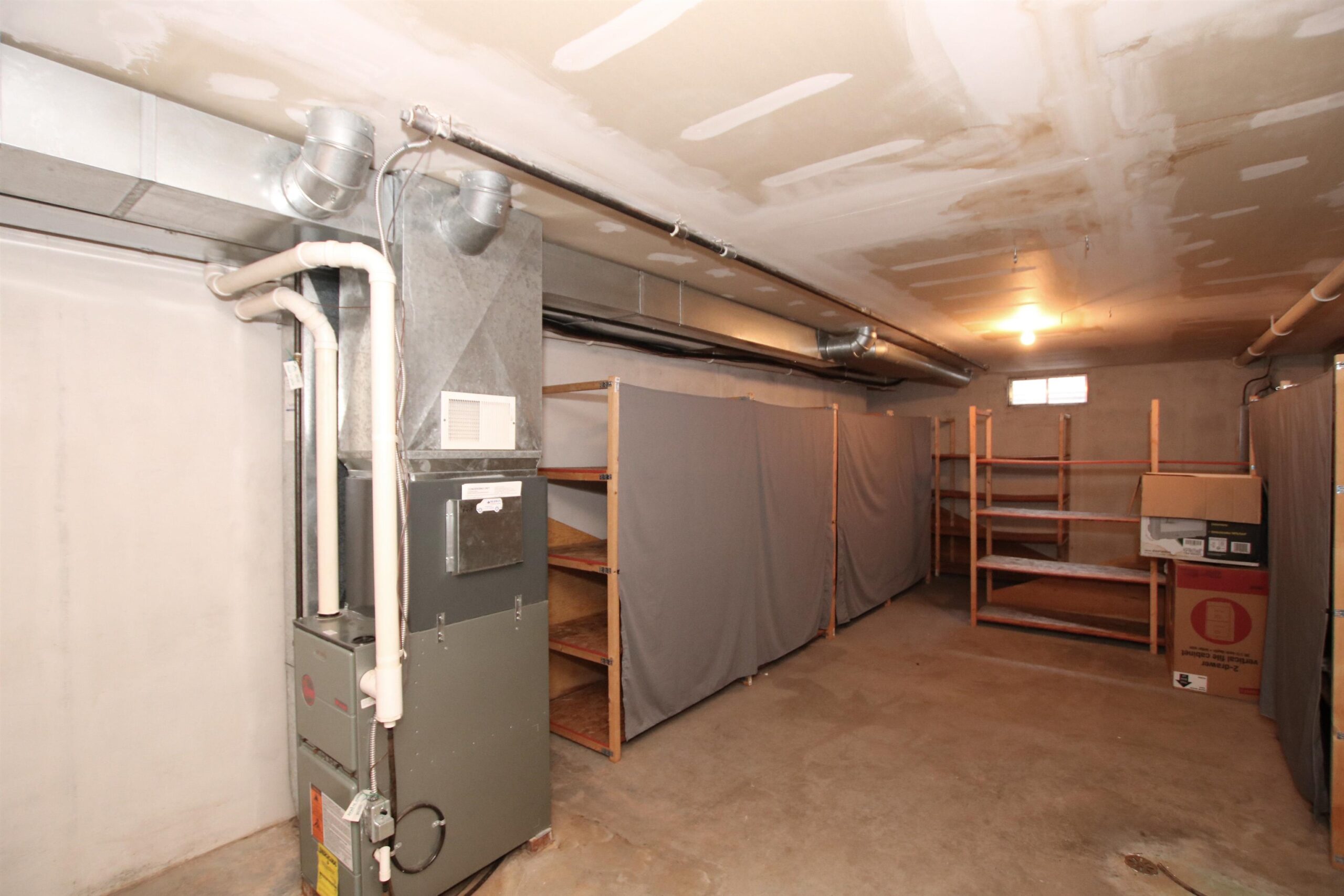 Stove, Refrigerator, Dishwasher, Washer/Dryer, Storage Shelves (Basement), workbench, light and pegboard, Shelves (Laundry room) Window Treatments
