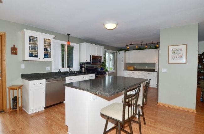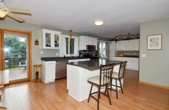 McFarland- Beautiful updated home situated on a private wooded lot. Expansive remodeled kitchen with center island and baking area. Off the dining area is a sliding patio door leading out to a deck. Living room is large enough to have a dining space within it. Master bedroom has a walk-in closet and private bathroom. Two spacious bedrooms share a remodeled bath. Exposed lower level with family room & fourth bedroom. Oversized garage. Storage shed. Close to schools.