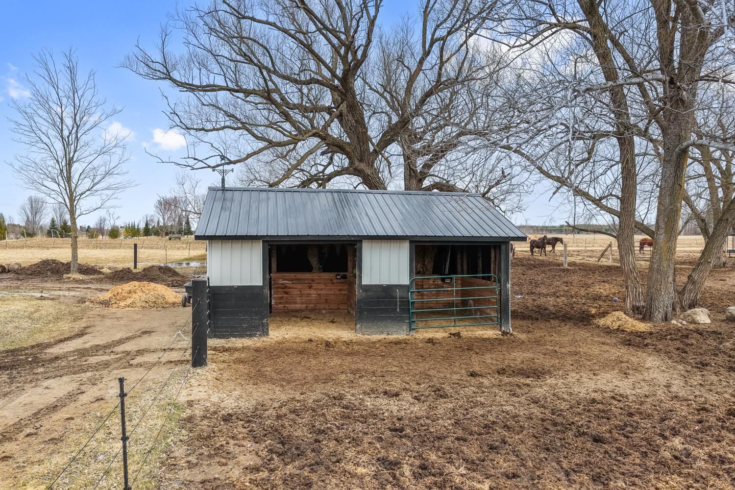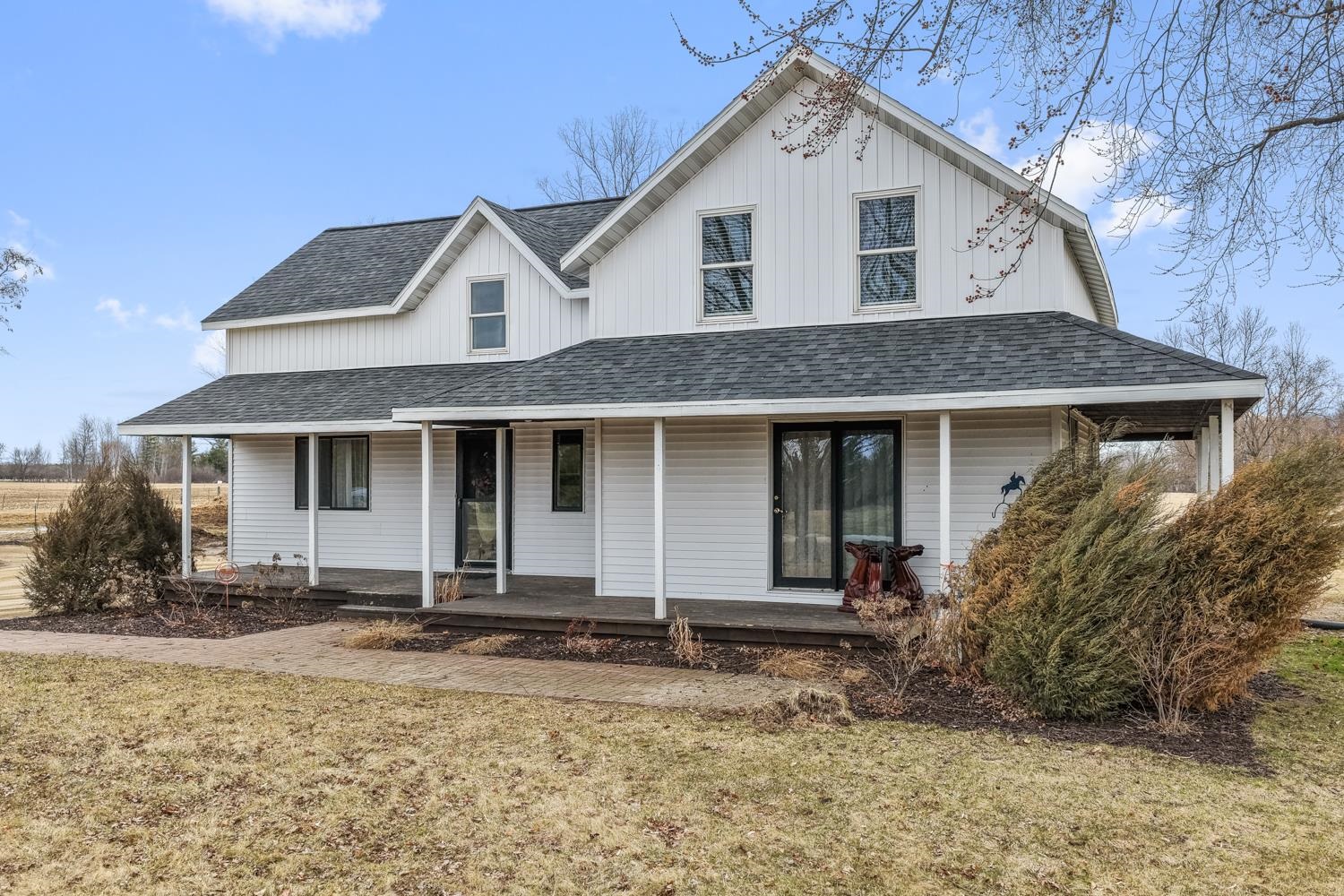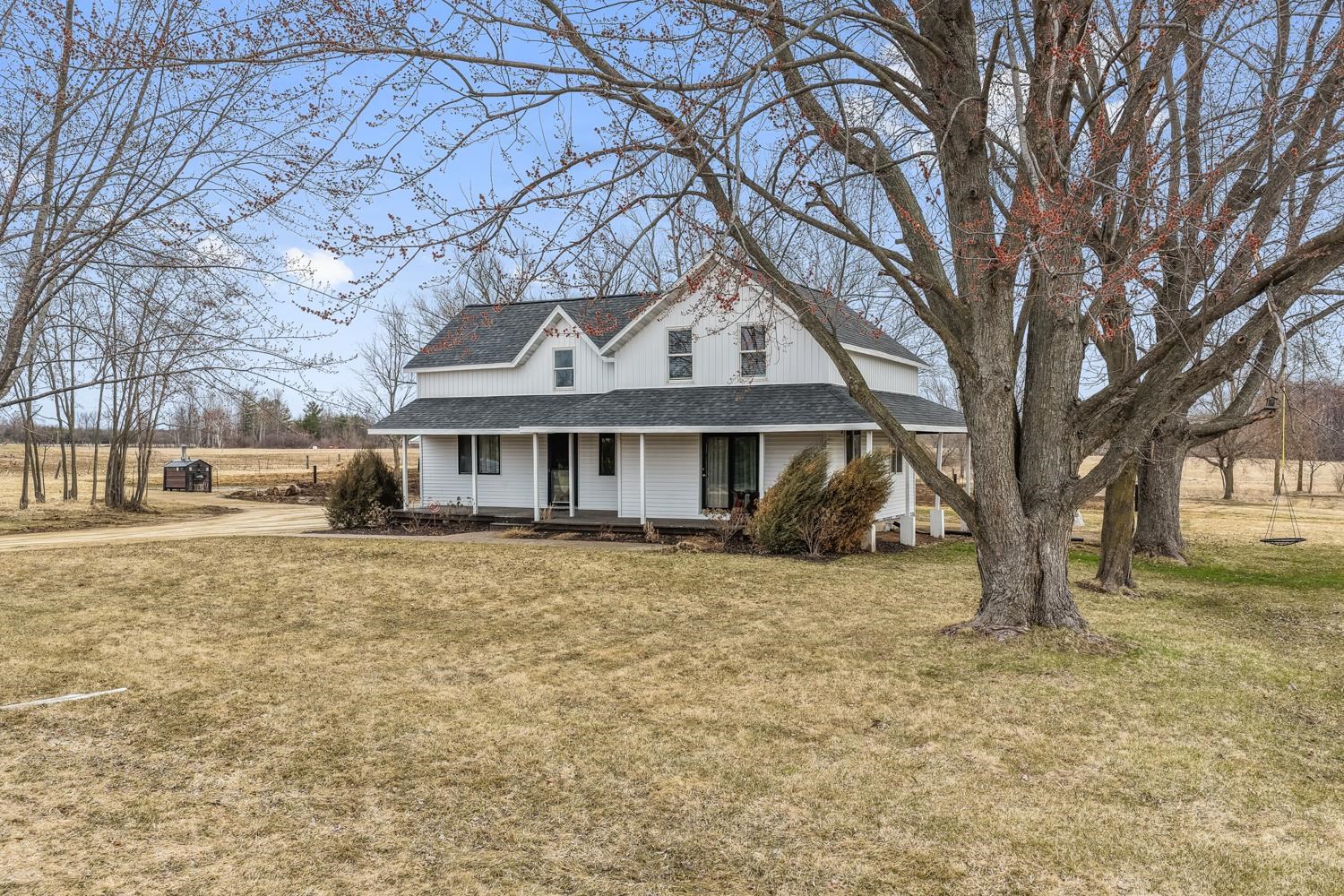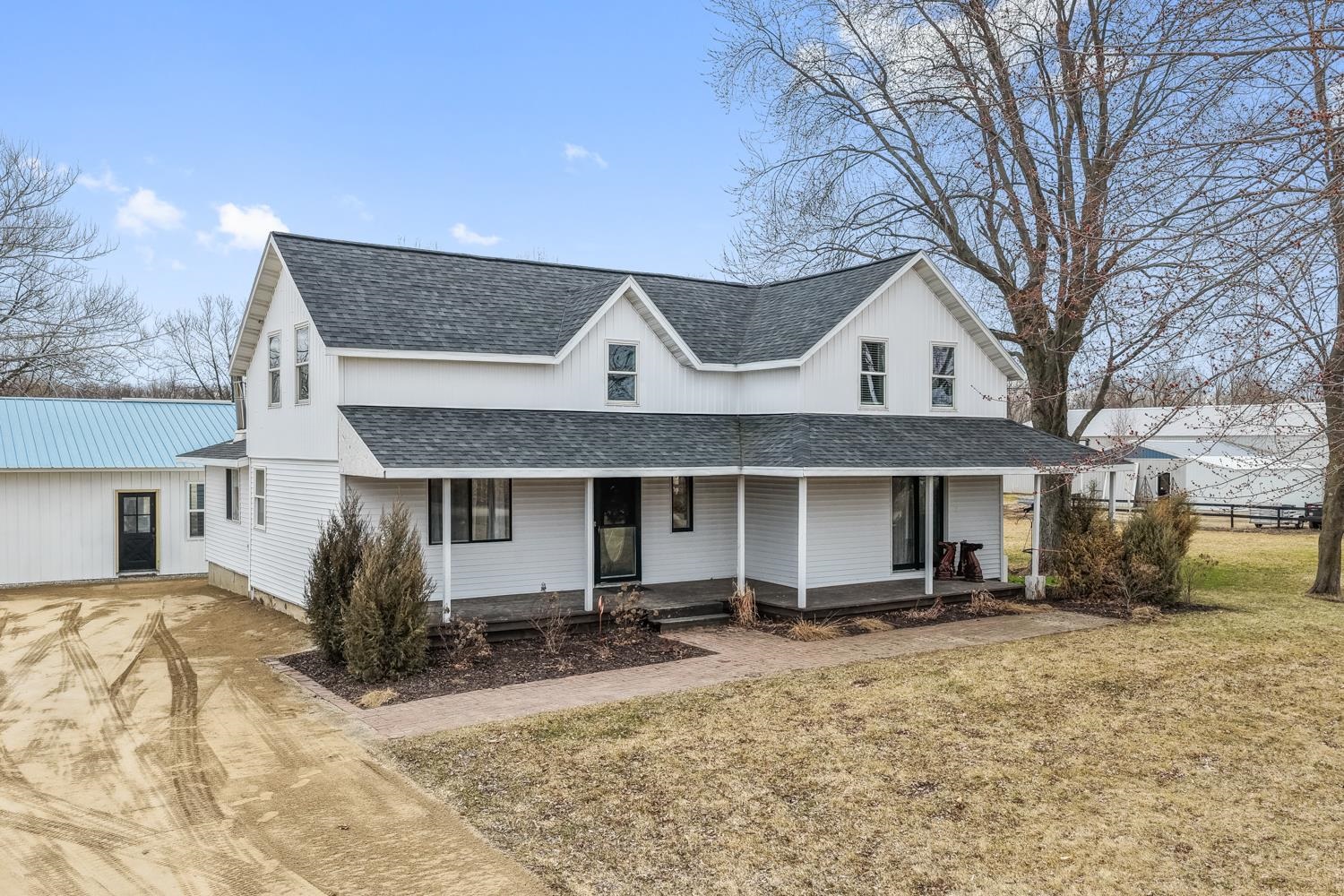 Horse Property! 4BR/1.5BA home set on a 10+acre lot greets w/covered porch opening to foyer. Kitchen w/butcher-block counters, pantry, ss appliances & sliding door opens to back-yard. Dining rm w/sliding door to porch. Huge LR w/cathedral ceiling, exposed beams & stone-faced wood-burning FP. Master BR w/walk-in cls & half-en suite w/partial open ceiling. 1st flr laundry w/W+D! Full BA w/hex-tile & modern vanity complete main flr. Upper lvl w/den/office space w/knotty pine, walk-in cls, large 2nd BR & BR's 3+4. Acreage w/ fenced areas, productive tillable land & 2 ponds! Detached garage/shed combo w/ great storage or potential finished space. Home heated by economical wood-fired hydronic forced-air system! Taxes TBD. *Adjacent 1 acre w/ barn & horse stables available w/ home for $799,900.