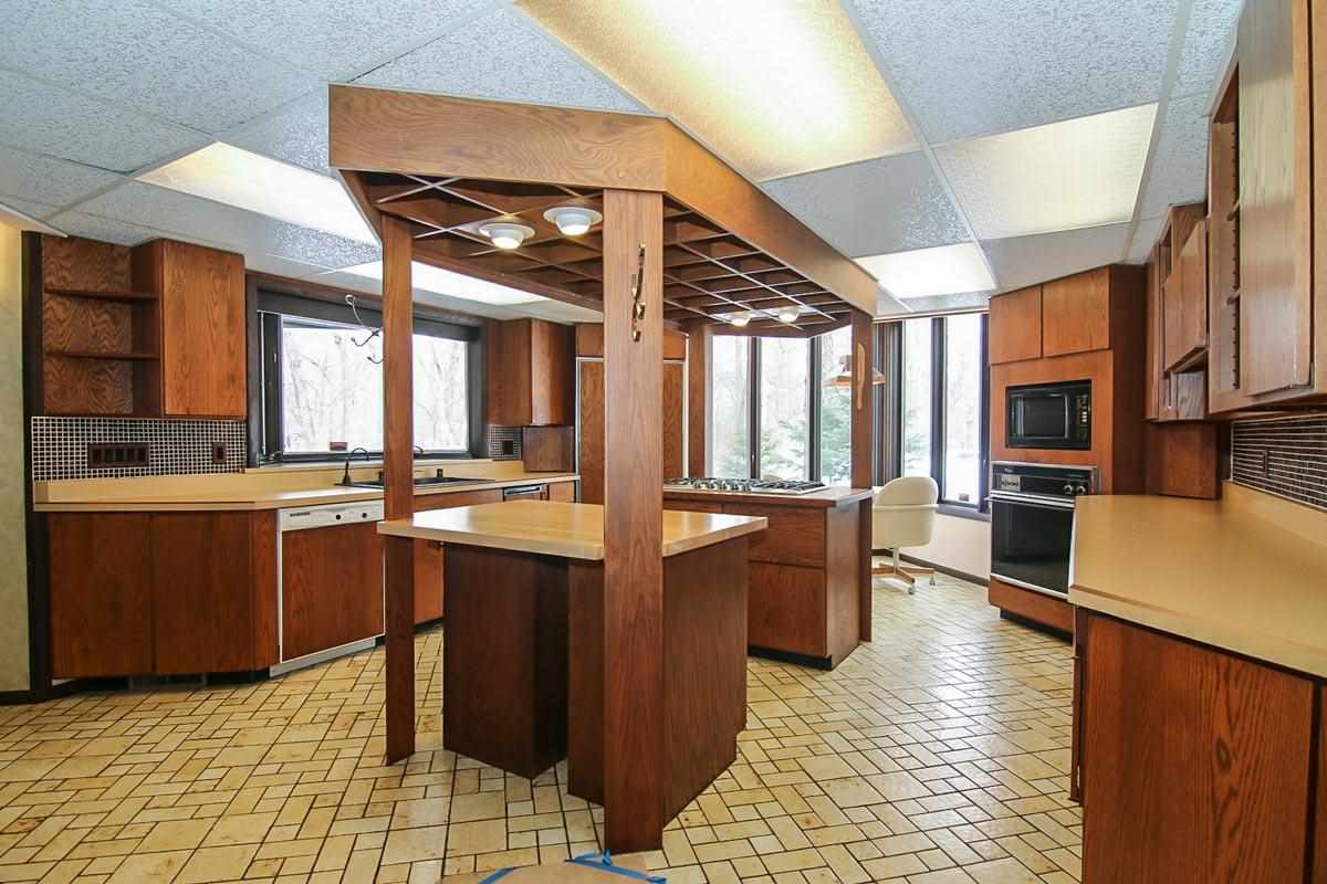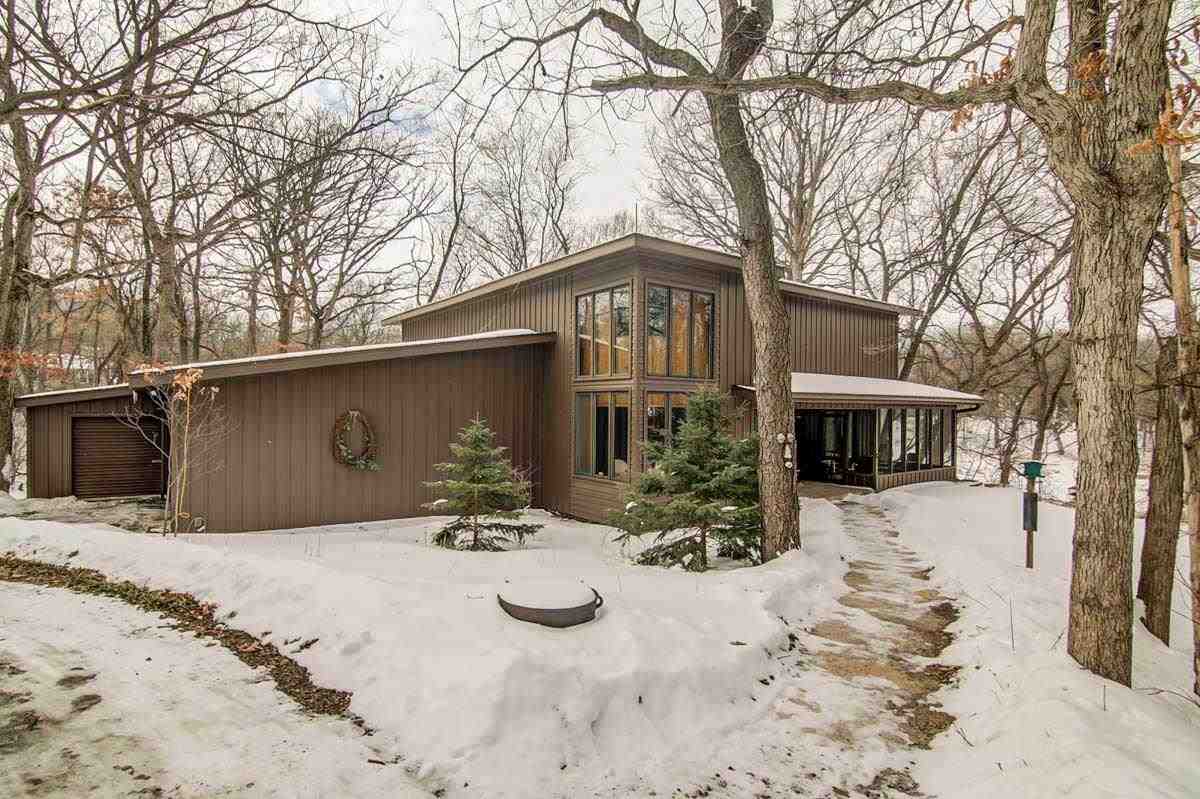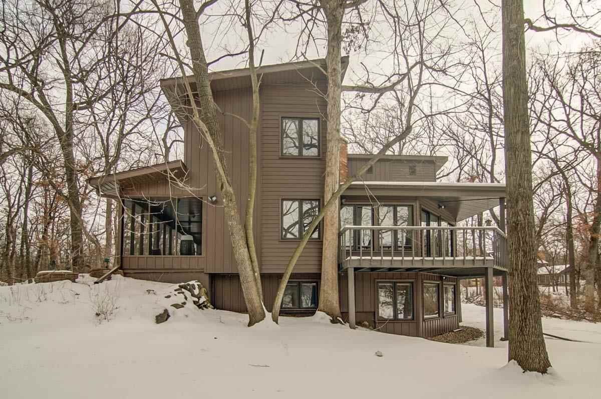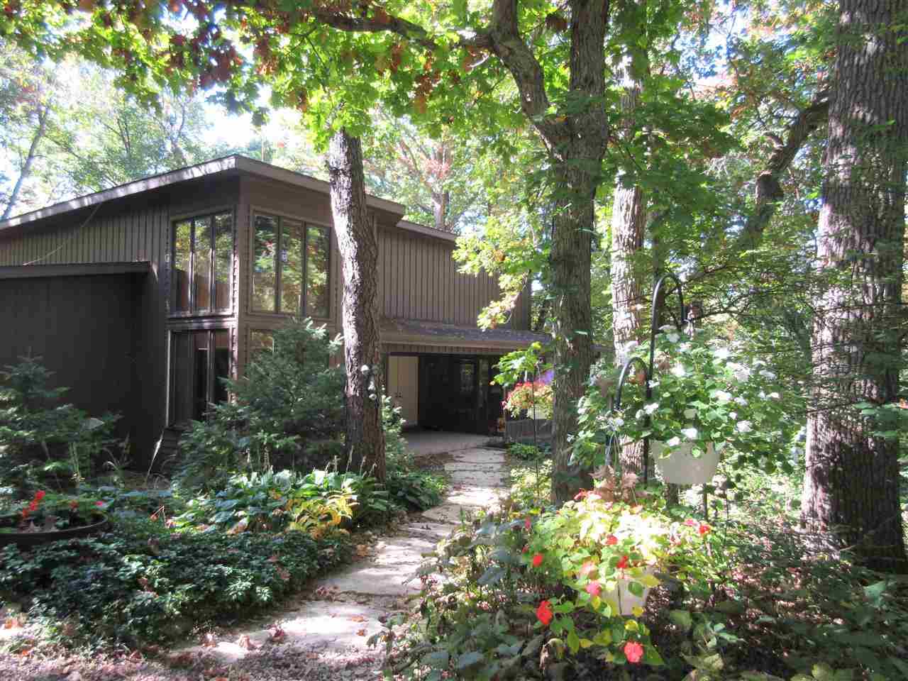 Fantastic custom contemporary home on over 1.5 acres of wooded privacy! Spectacular views backing to green space. Unique design w/ interesting architecture & large open spaces w/ windows galore! Vaulted ceilings & stunning FP w/ copper hood! Huge Great Room! Retractable wall to separate spaces! The UL has 2 large BRs & Bath with dbl sinks & jetted tub! One BR has a free-standing FP & huge space for W/I Closet! Walk-out LL w/ huge Rec Rm, 2 add'l BRs & full Bath! Giant wrap around deck & screen porch!