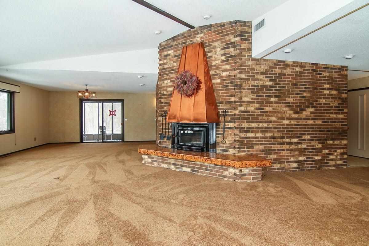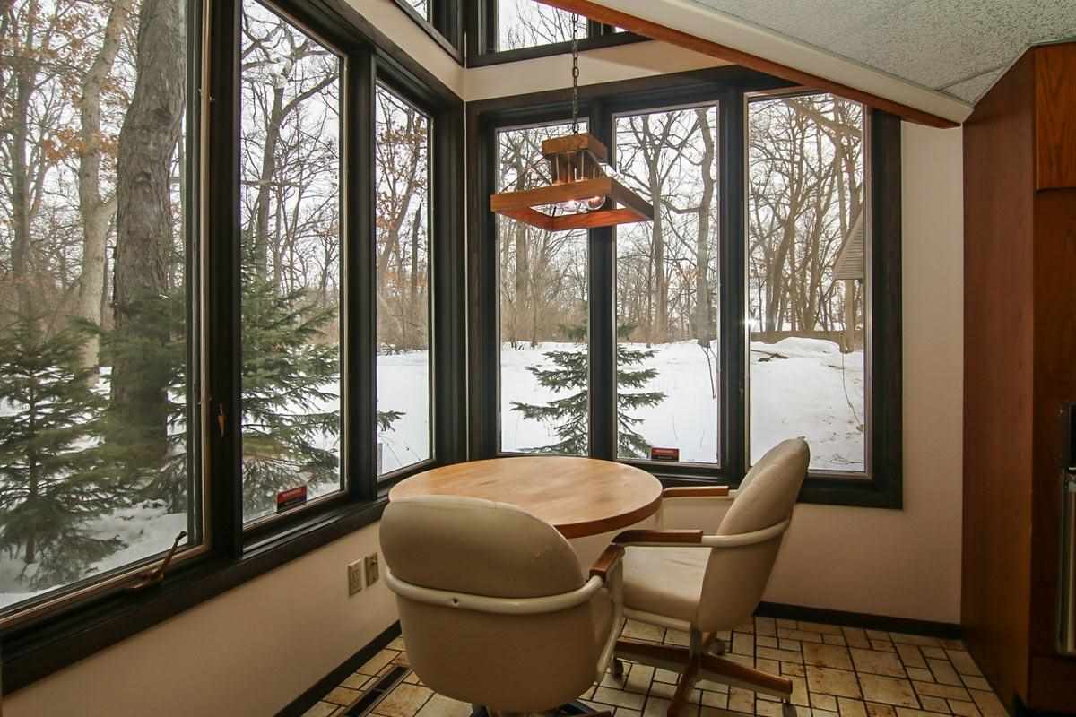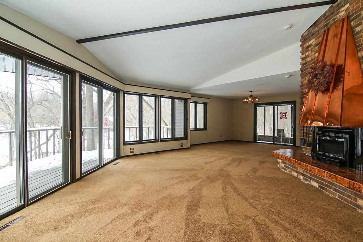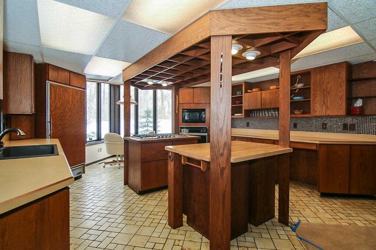 Fantastic custom contemporary home on over 1.5 acres of wooded privacy! Spectacular views backing to green space. Unique design w/ interesting architecture & large open spaces w/ windows galore! Vaulted ceilings & stunning FP w/ copper hood! Huge Great Room! Retractable wall to separate spaces! The UL has 2 large BRs & Bath with dbl sinks & jetted tub! One BR has a free-standing FP & huge space for W/I Closet! Walk-out LL w/ huge Rec Rm, 2 add'l BRs & full Bath! Giant wrap around deck & screen porch!