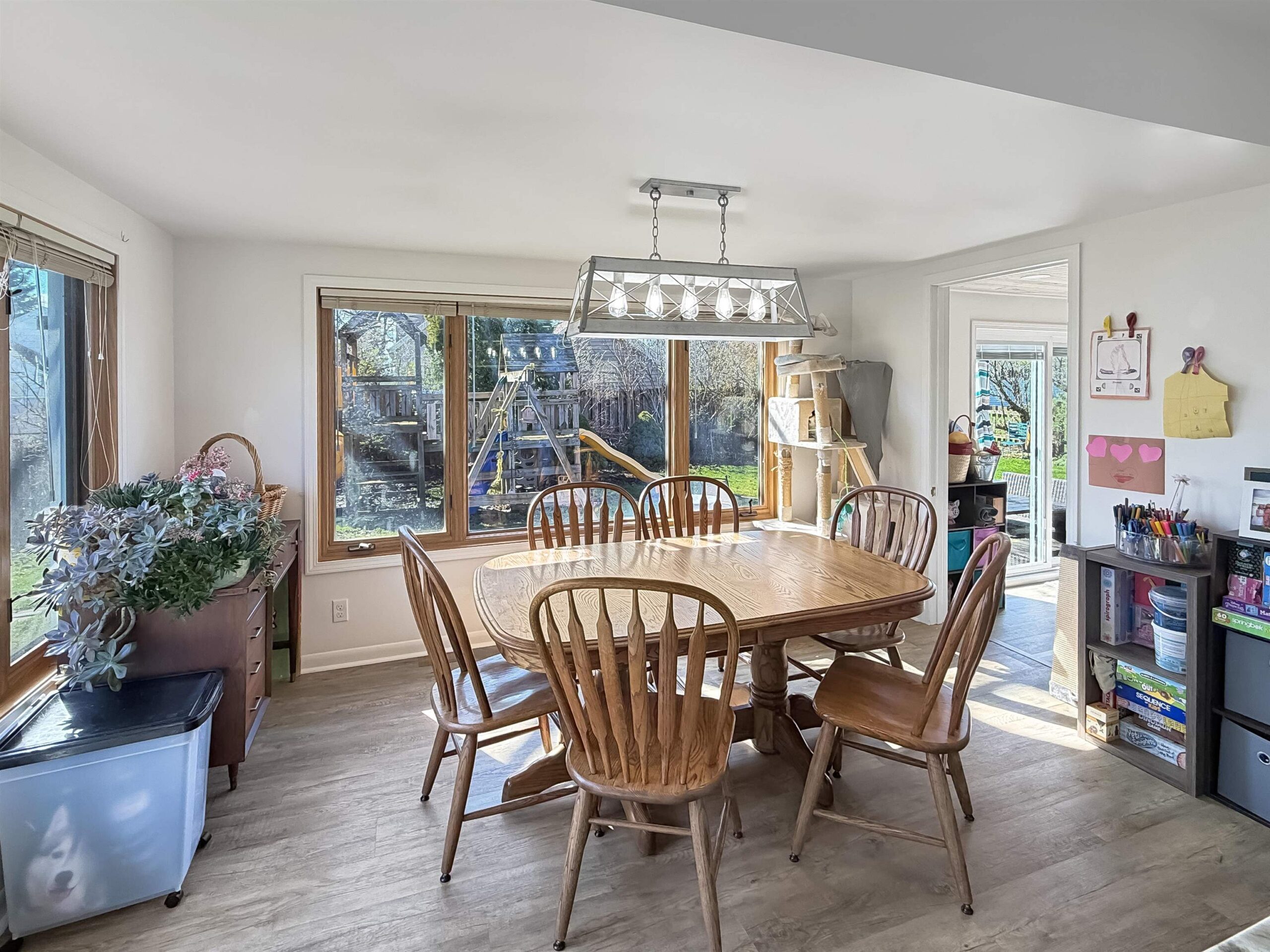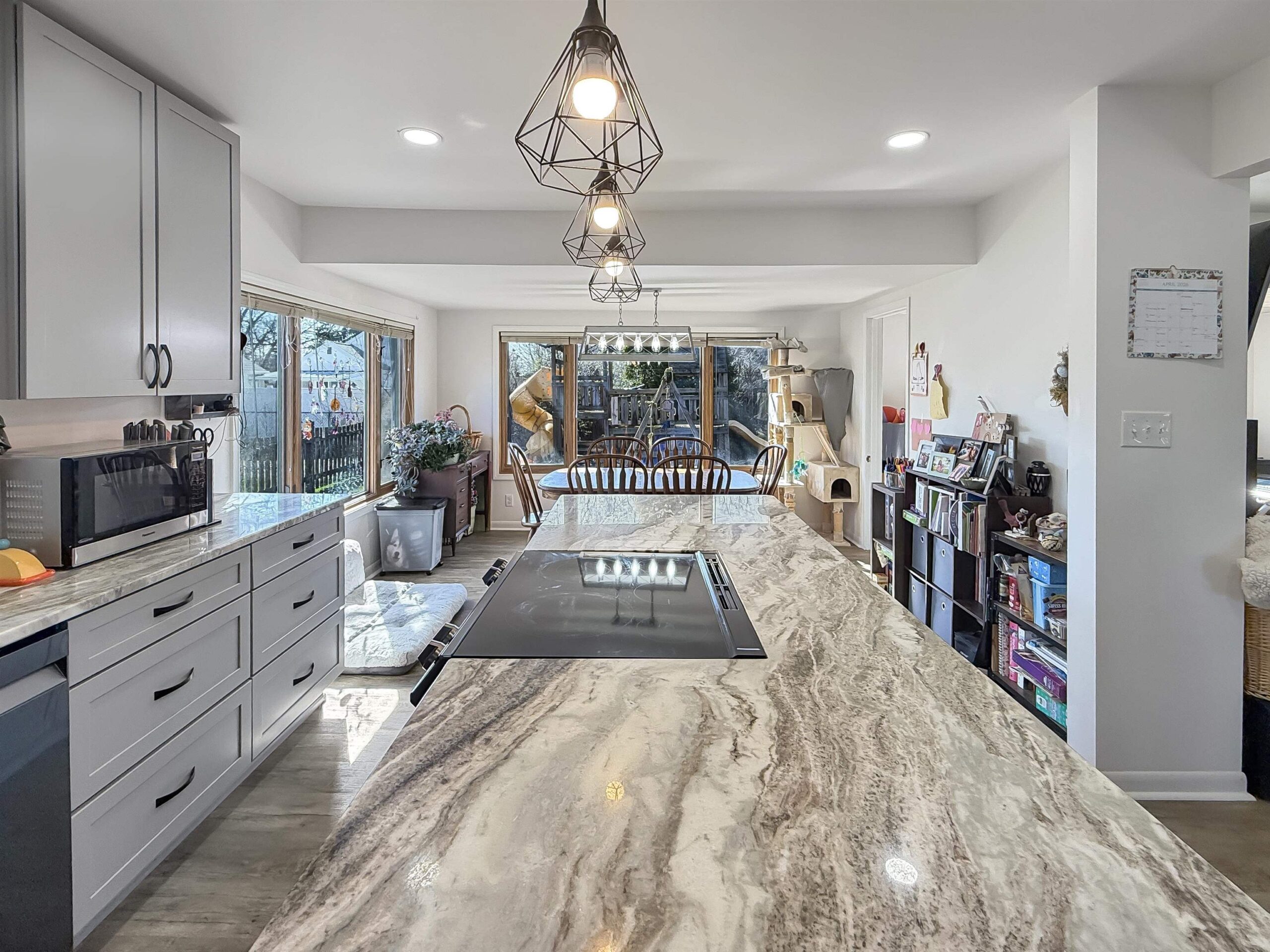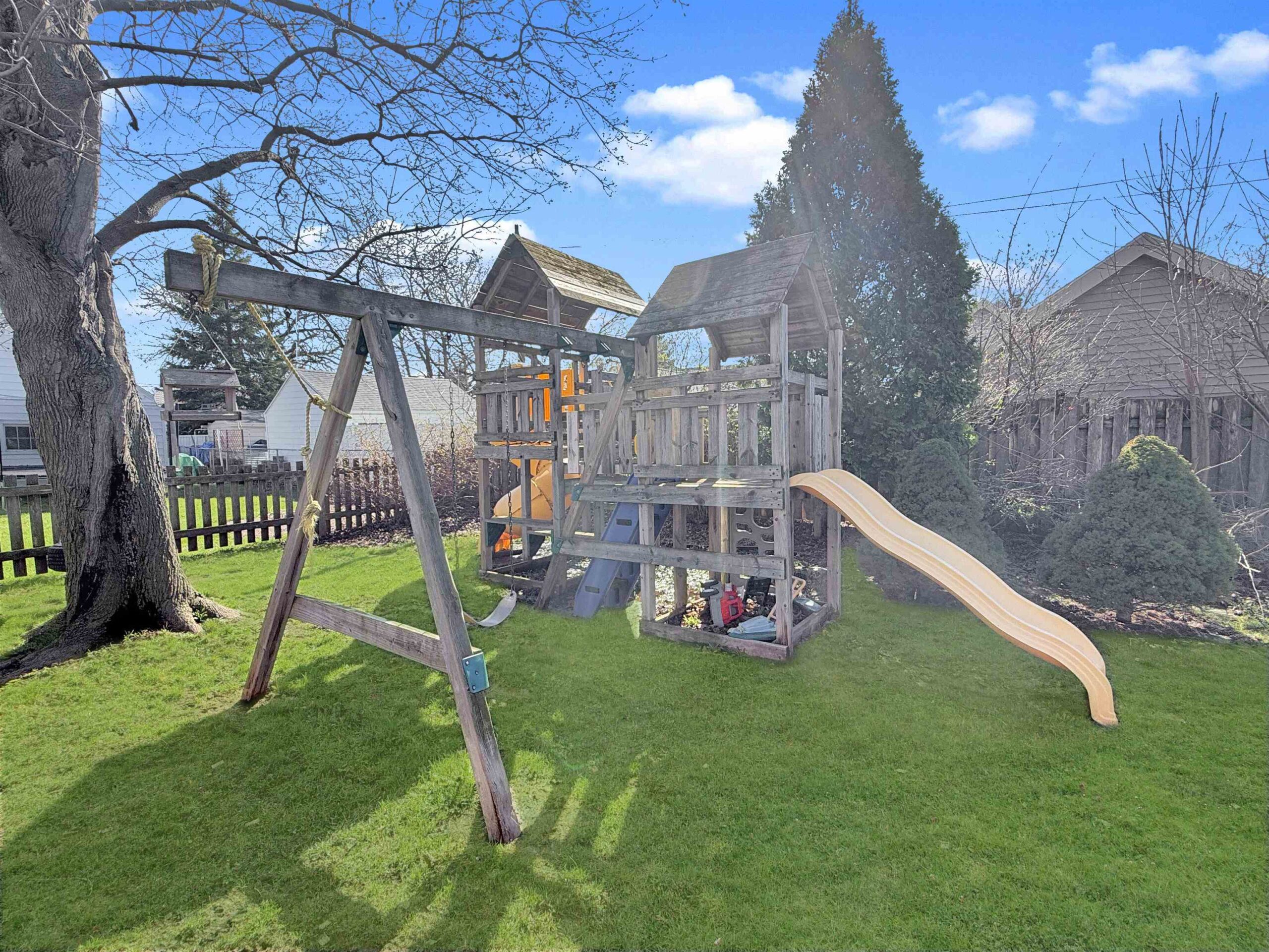 stovetop, oven, refrigerator, dishwasher, microwave, washer/dryer, outdoor playset, municipal garbage and recycle containers, window treatments